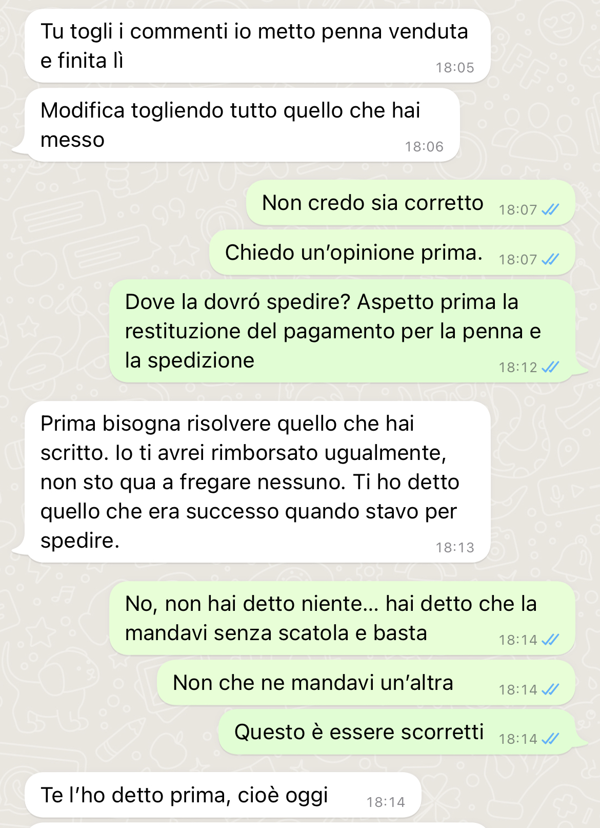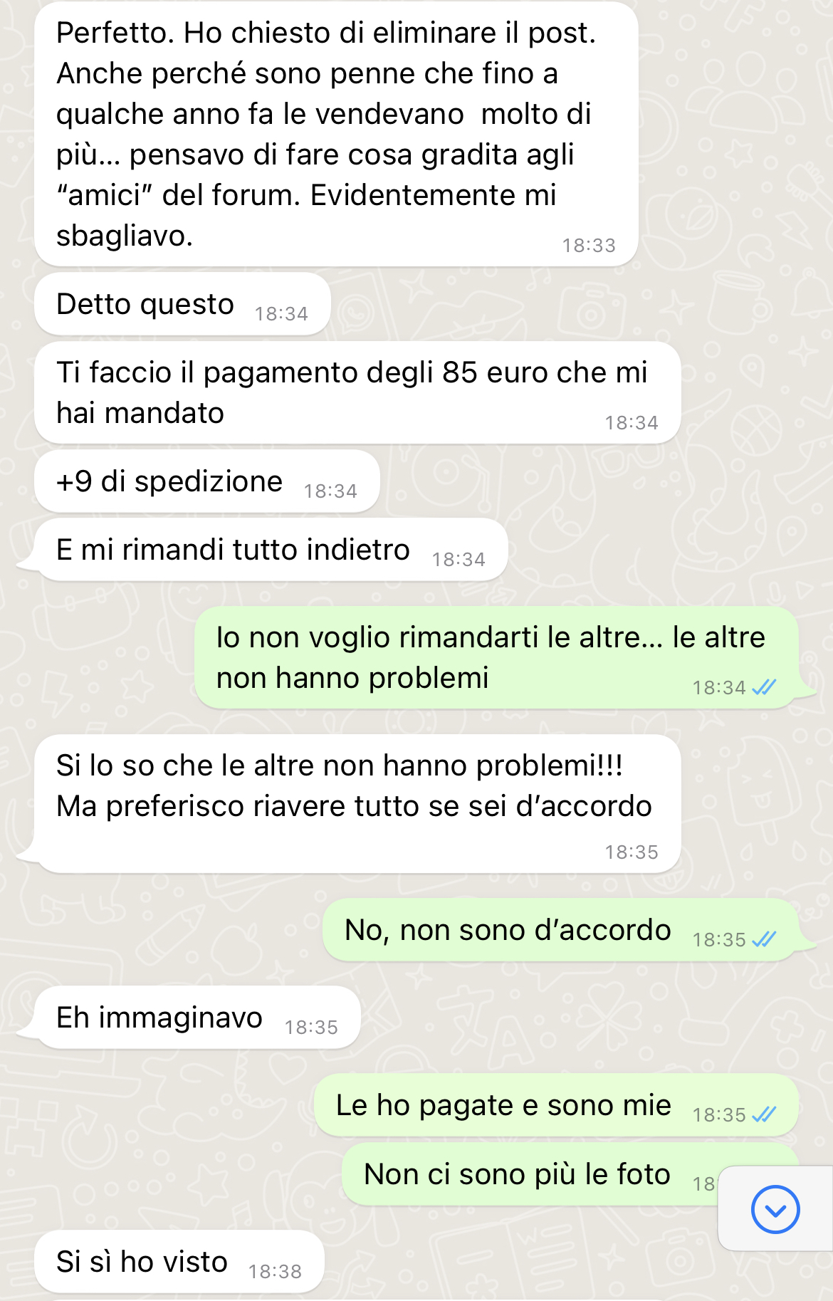 Chiedo di restituirgliele (dopo che mi ha detto che le penne spacciate per nuove non lo erano) e contestualmente lo assecondo rimuovendo le foto pubblicate sotto al suo annuncio in cui mostravo gli evidenti difetti che aveva la penna.