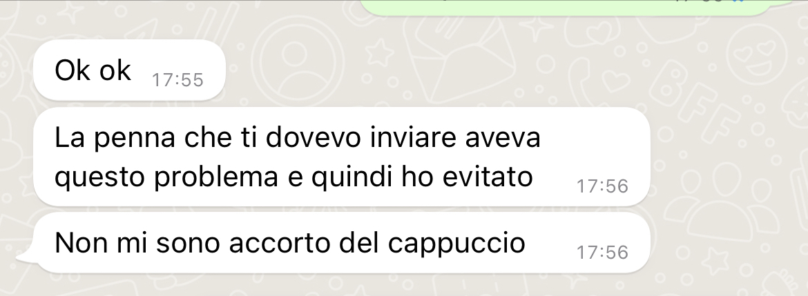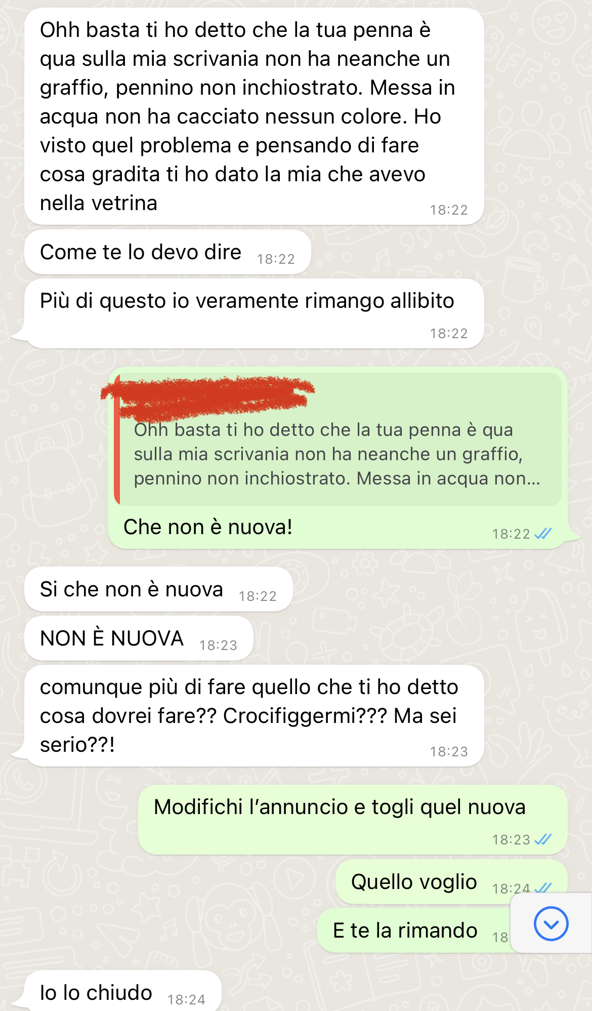 Contattato immediatamente l’inserzionista mi risponde che non ha mandato la penna di cui aveva pubblicato le foto perché difettosa, ma mi aveva mandato la sua, e non si era accorto dei problemi che aveva.