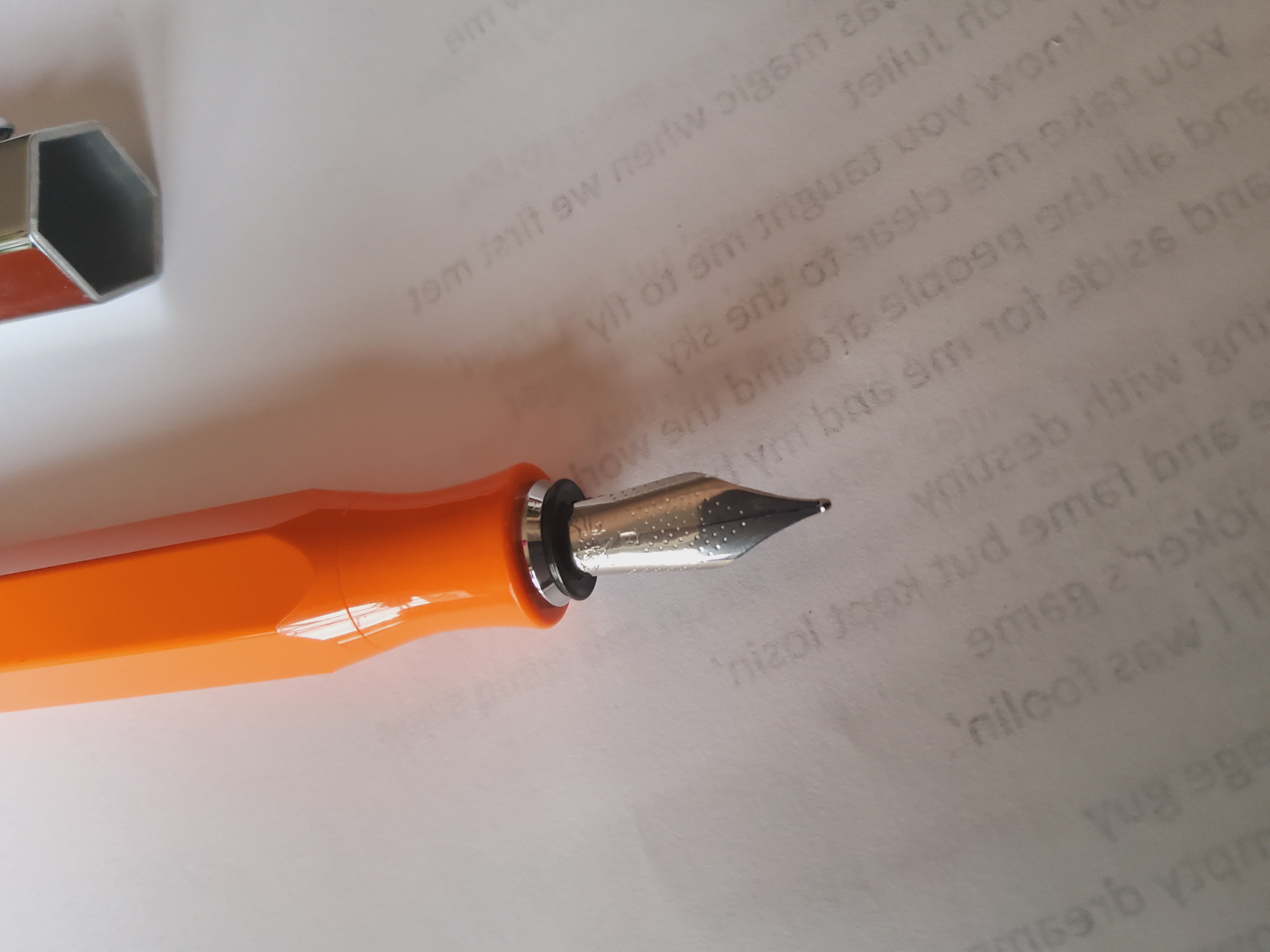 Il pennino è molto buono, rigido ma molto scorrevole. Anch'io sono rimasto attratto dalla arancione (ce n'è una di quelle in legno che è altrettanto bella).