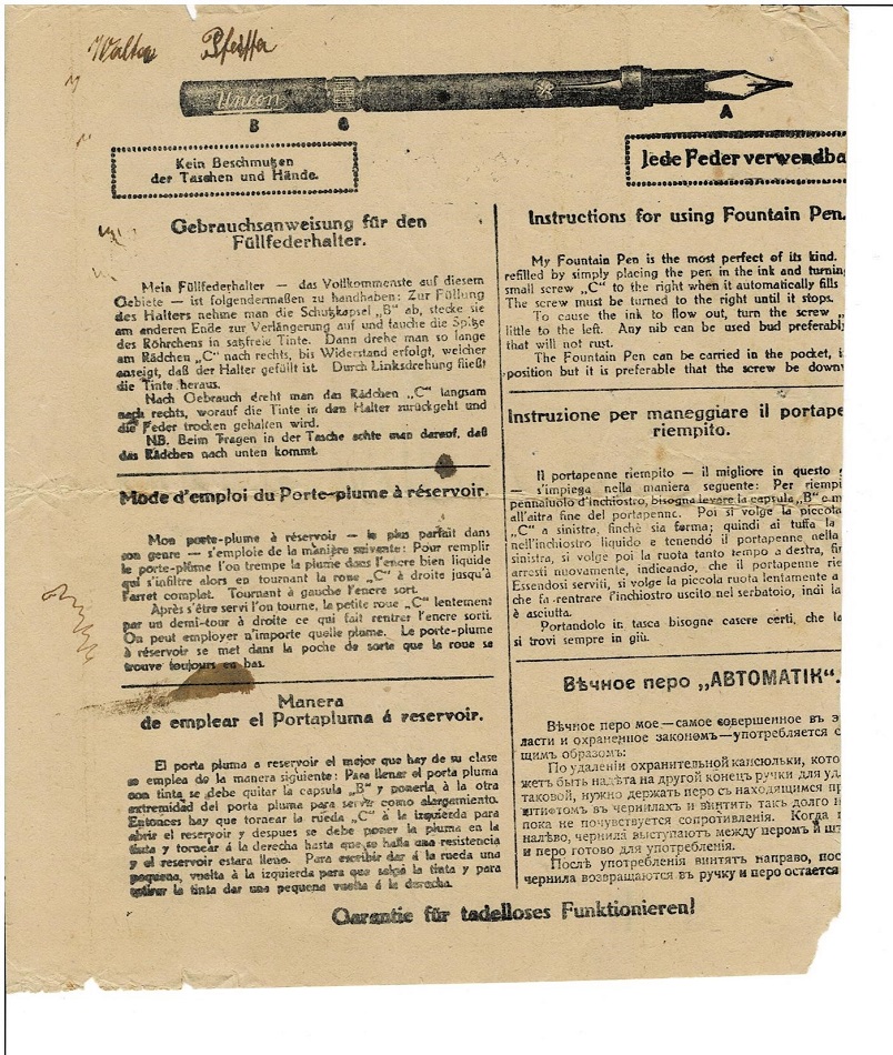 Si tratta di una stilografica sconosciuta con caricamento a tubo. Con un manuale di istruzioni in 6 lingue. Purtroppo, non tutto può essere letto su di esso.