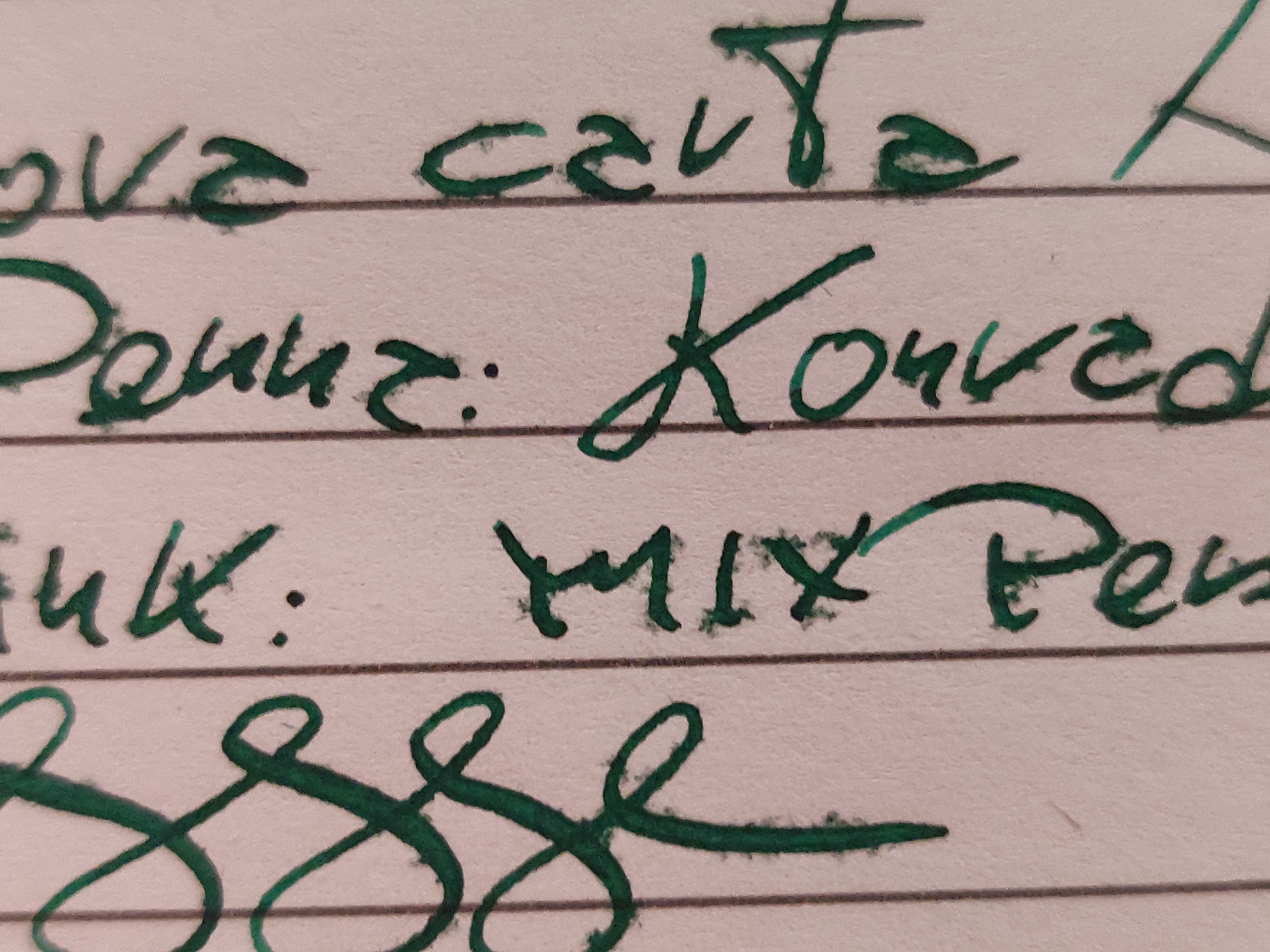 Al max una Noodler's Konrad, ma non la definirei abbondante... Anzi, trovata; una Jinhao 159 B, con l'inchiostro peggiore che ho, il Pelikan Adventurine.