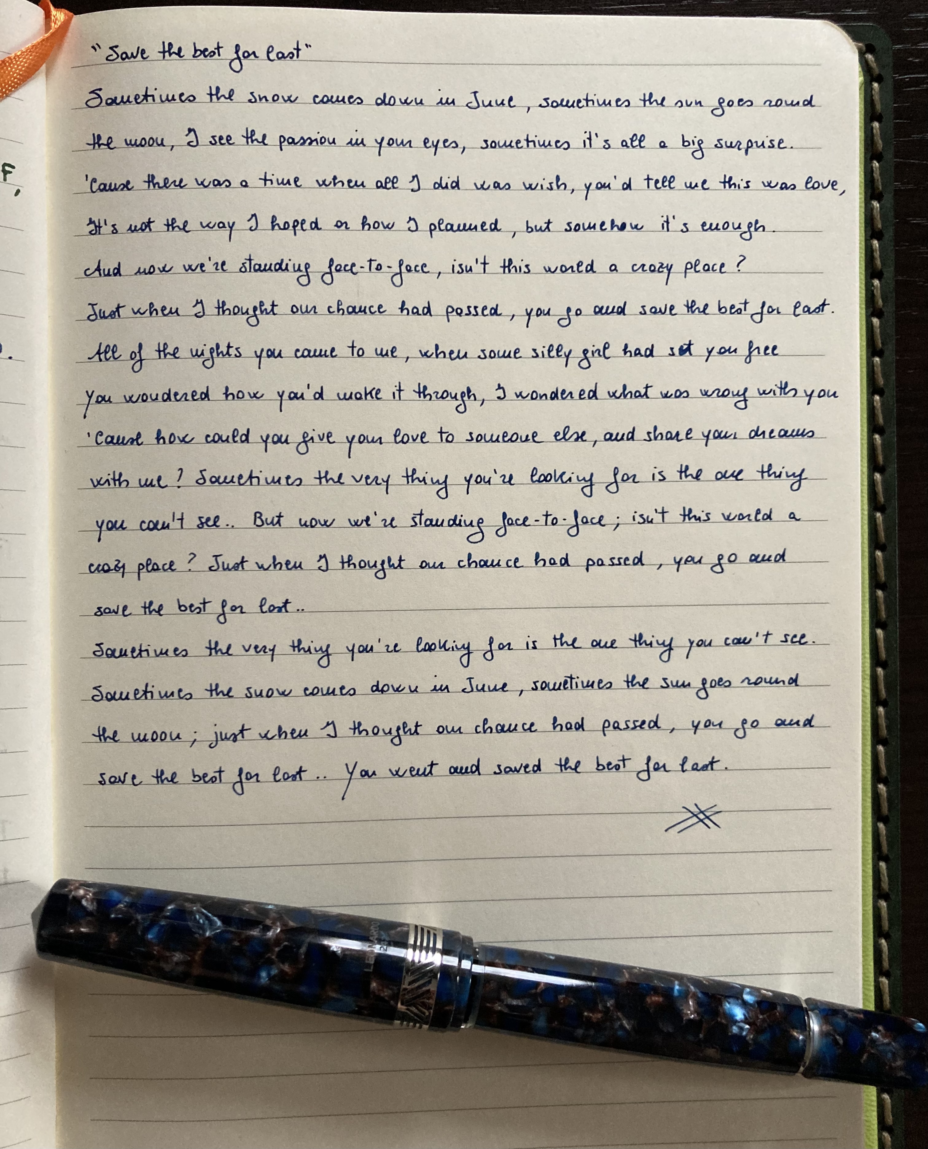 Anche la mia era una prova estrema. Qui stessa penna, lato corretto del pennino e scrittura “normale”Silvia1974 ha scritto: ↑domenica 26 giugno 2022, 18:00 Normalmente non sono così estrema: era giusto per la prova.