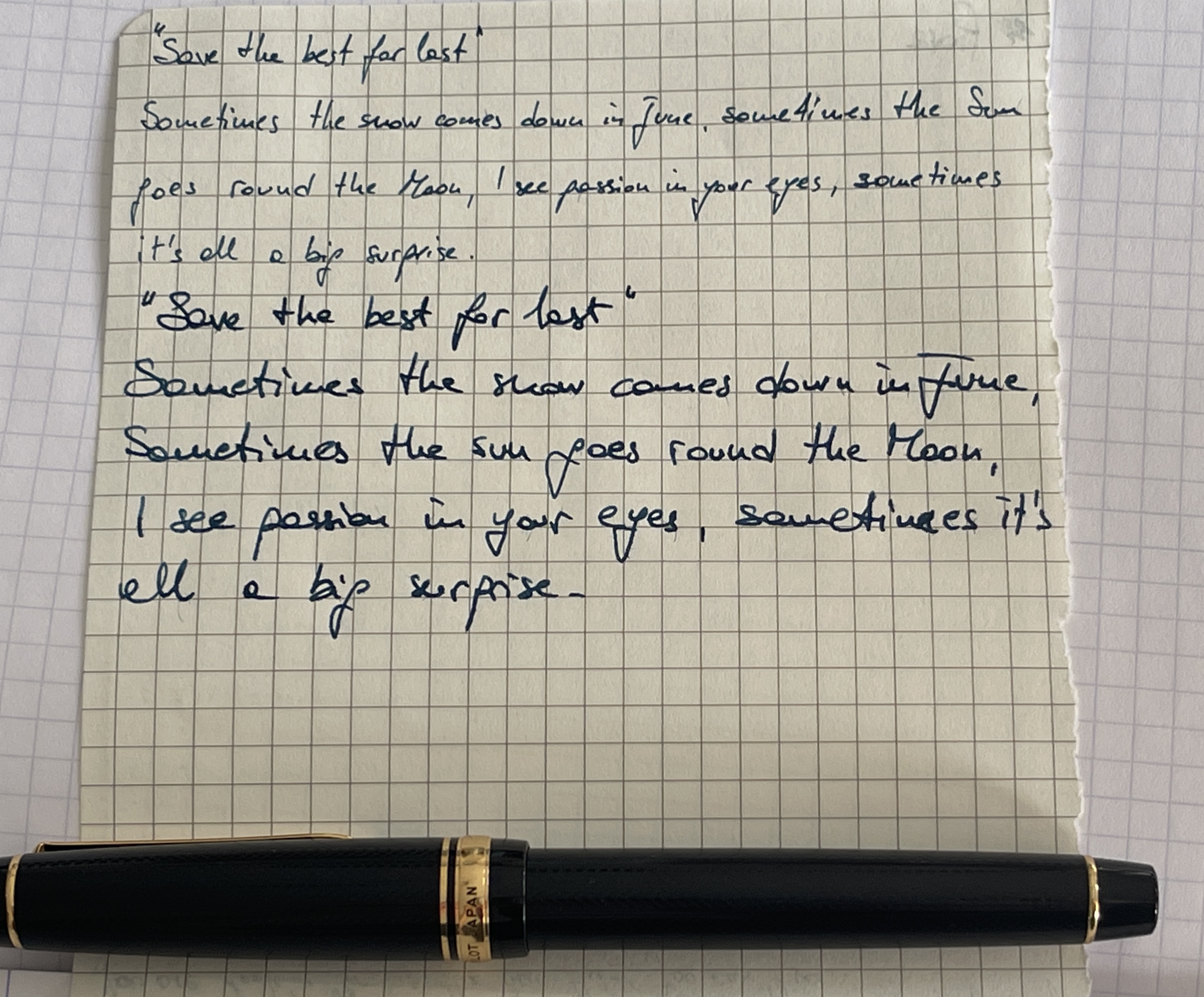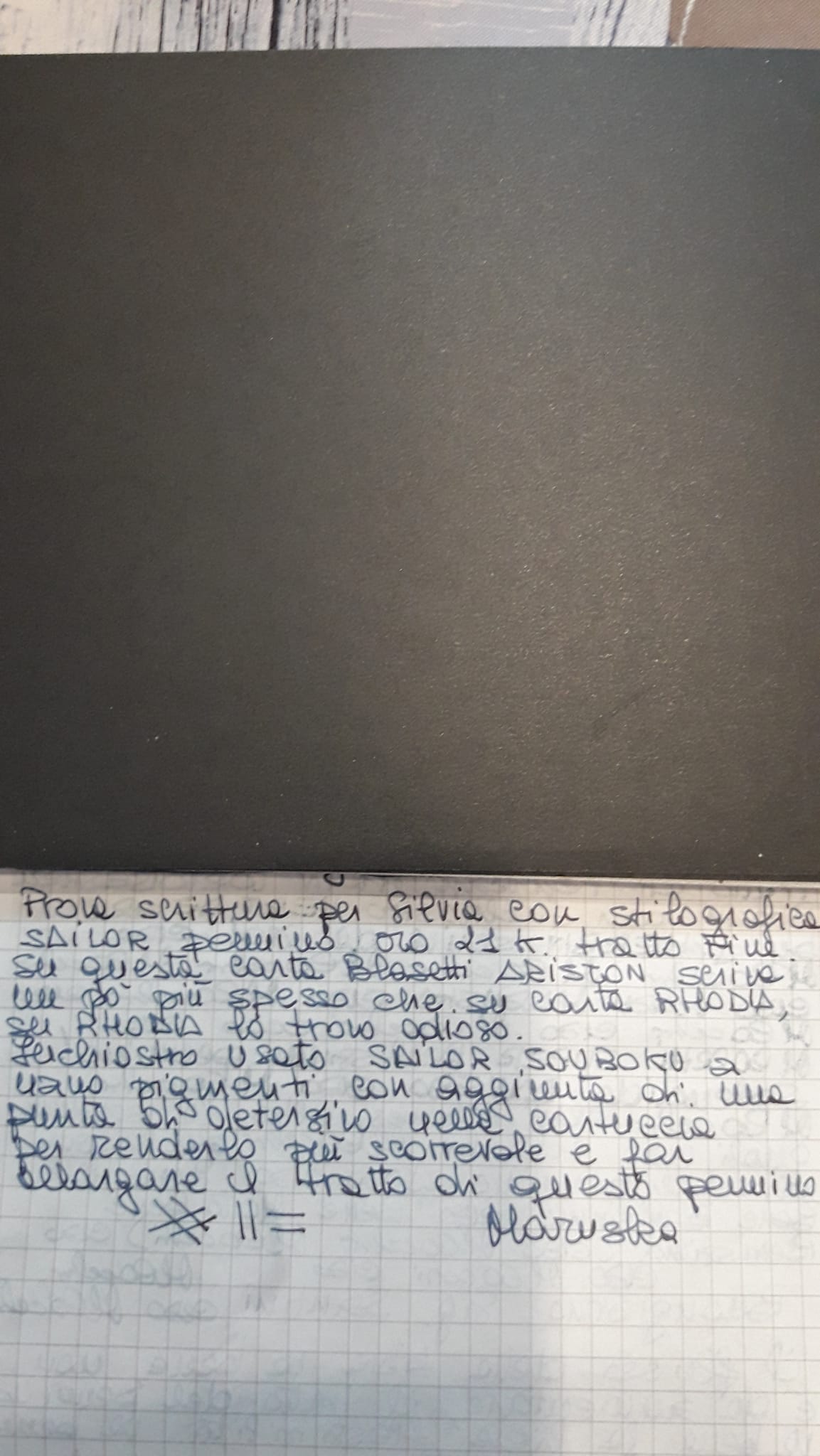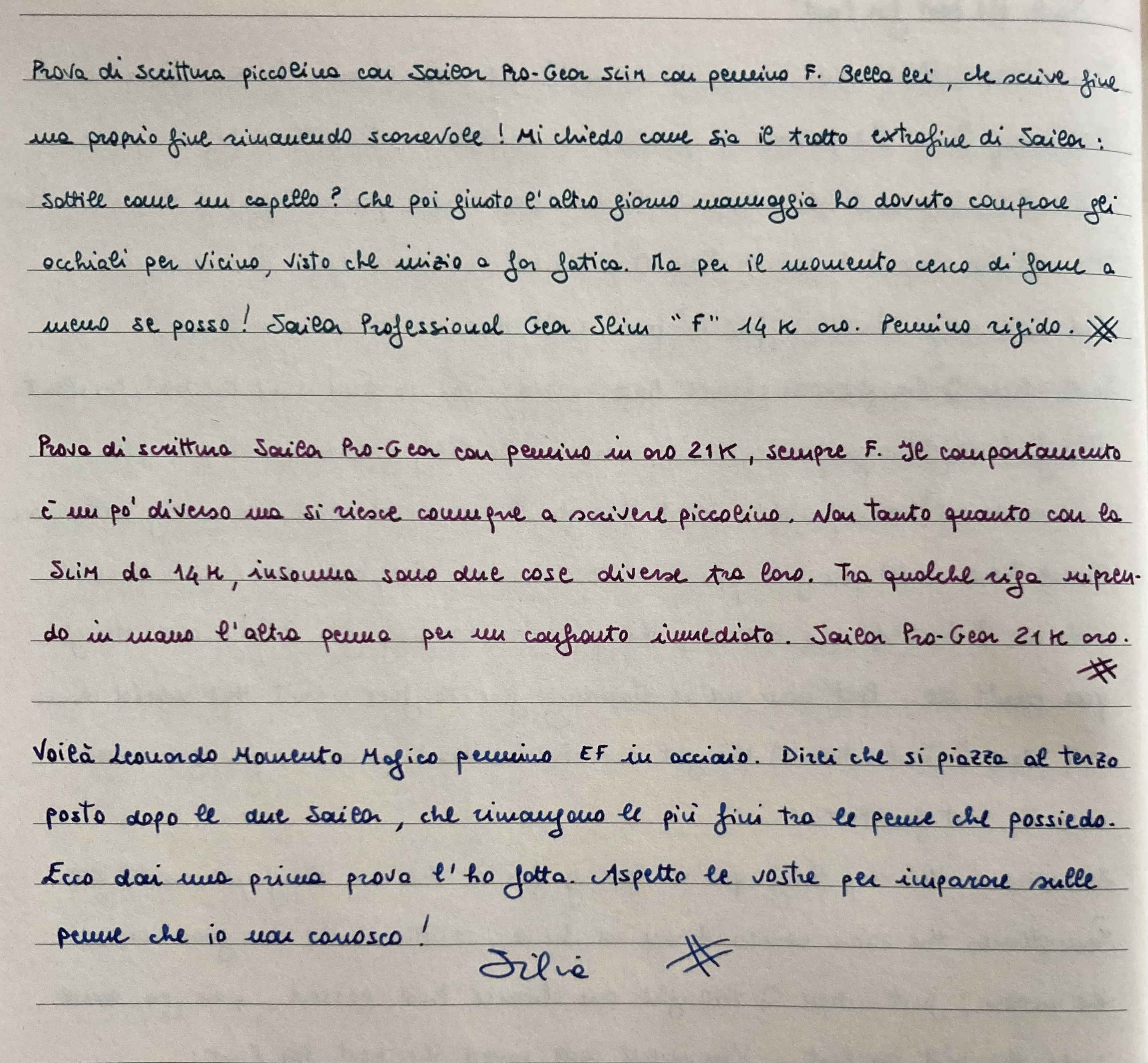 Bella grafia ma la comparazione tra i vari pennini si dovrebbe fare con identico inchiostro, almeno credo. Mi sorprende, forse non tanto, la differenza tra i due Sailor.Silvia1974 ha scritto: ↑domenica 26 giugno 2022, 17:48 Ecco le Sailor che possiedo: entrambe tratto F ma 14k oro la Professional Gear slim e 21k oro la Pro Gear standard (ciccia). Paragone anche con la Leonardo MM in EF: