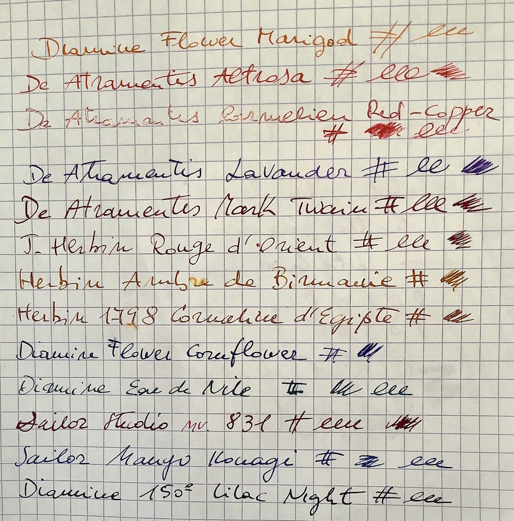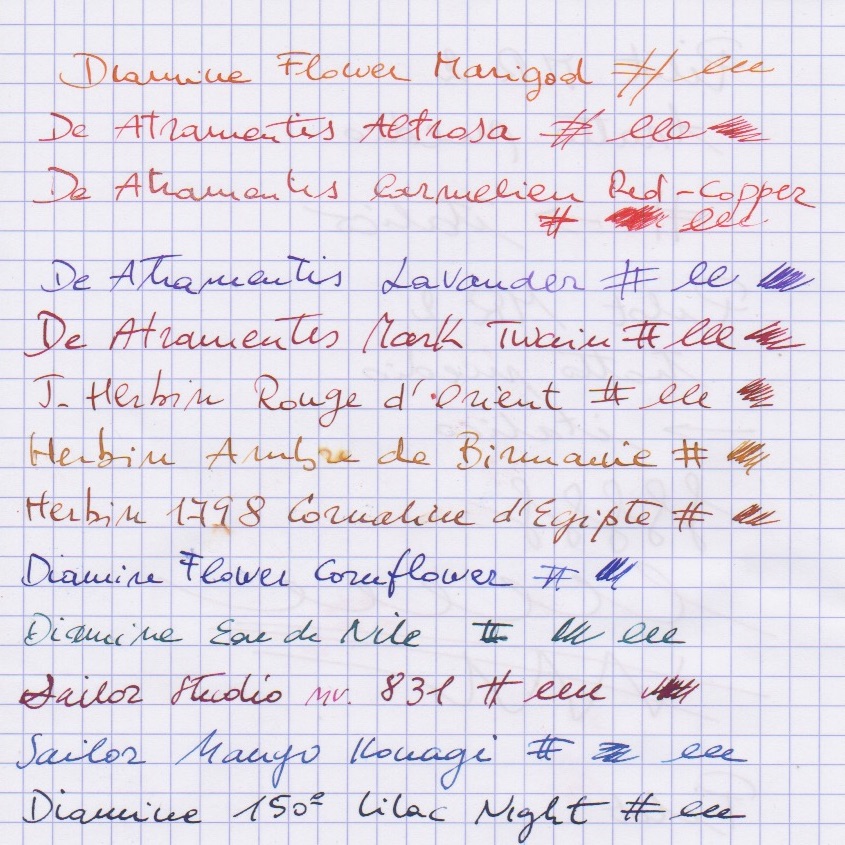 Sono tutti molto belli a vedersi, davvero difficile sceglierne uno ; i De Atramensis mi hanno particolarmente colpito, i vari Herbin sempre splendidi ed i Diamine una conferma (la serie Flower con il Marigod ed il Cornflower belli belli). Bella sorpresa anche i Sailor ink studio #831 e il Manyo Konagi.
