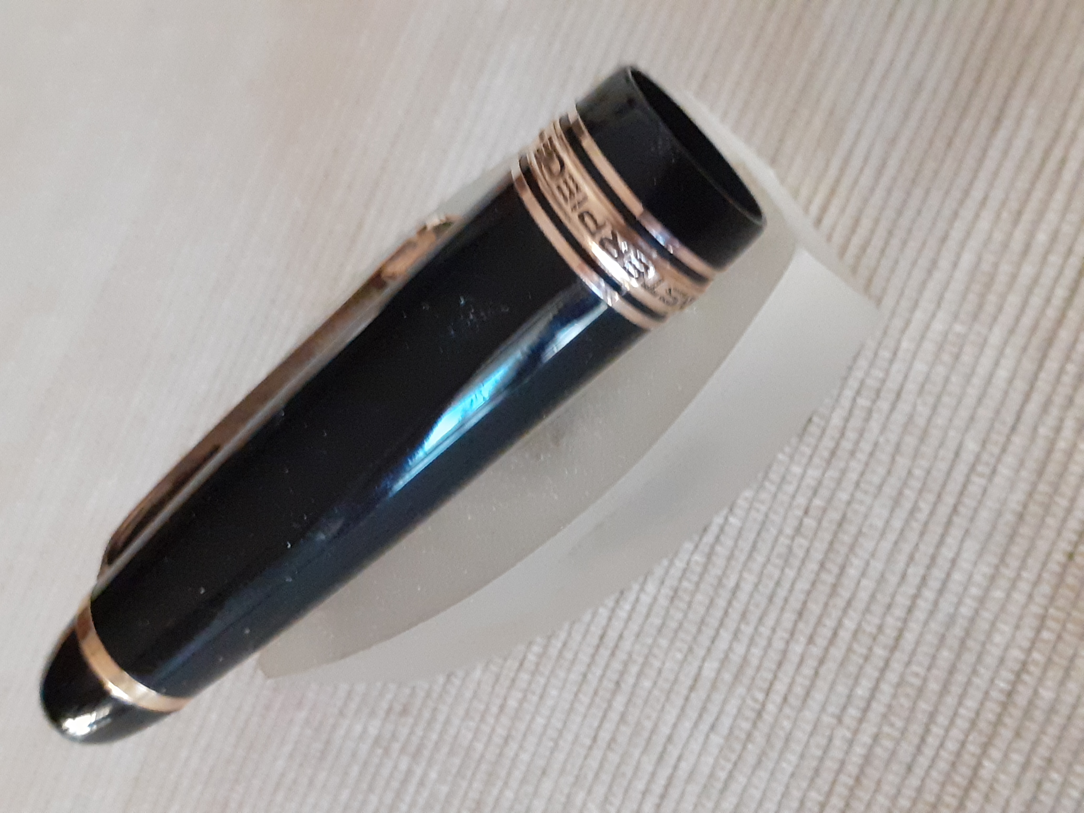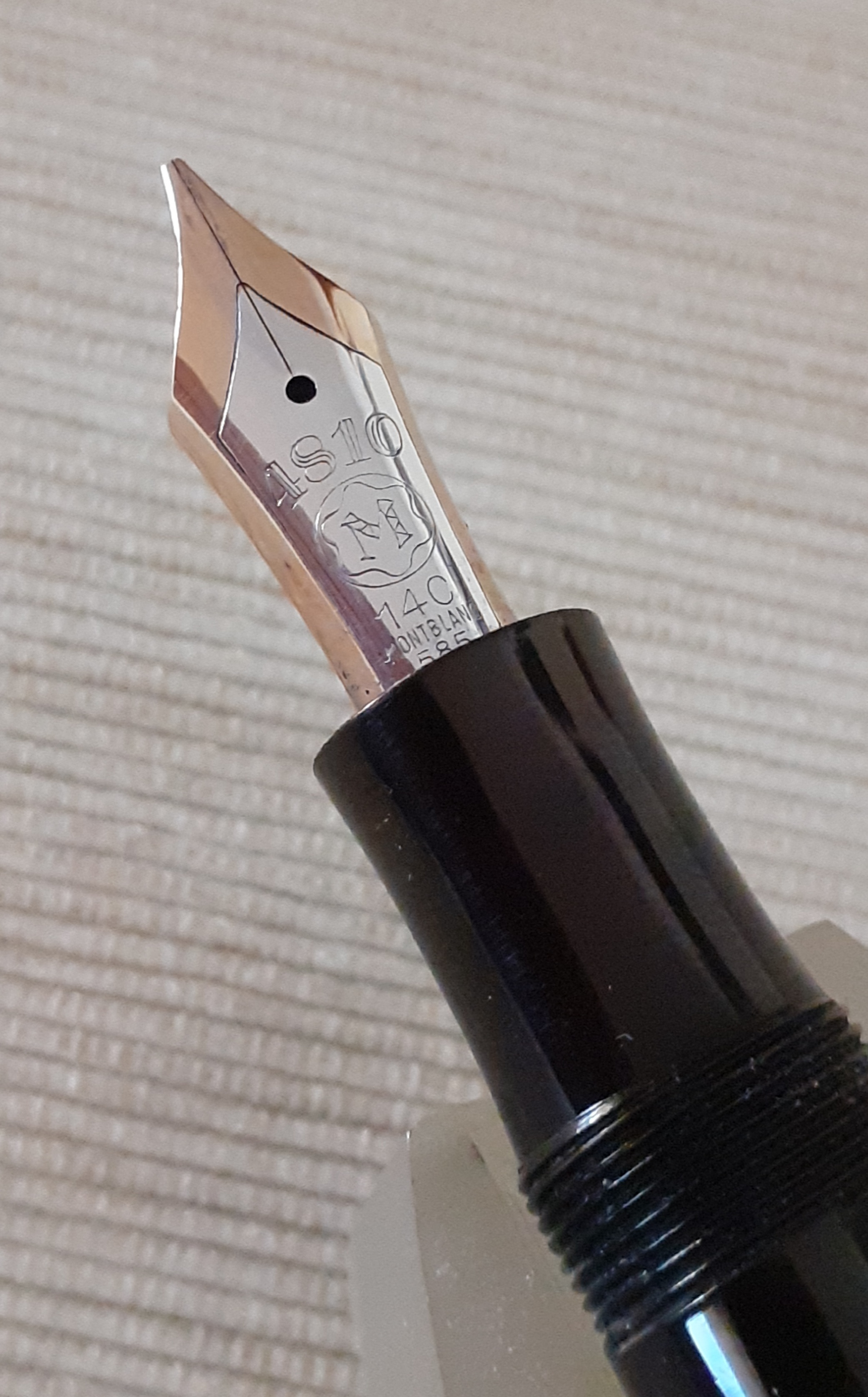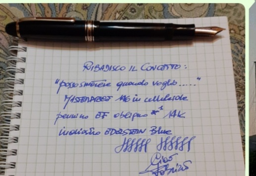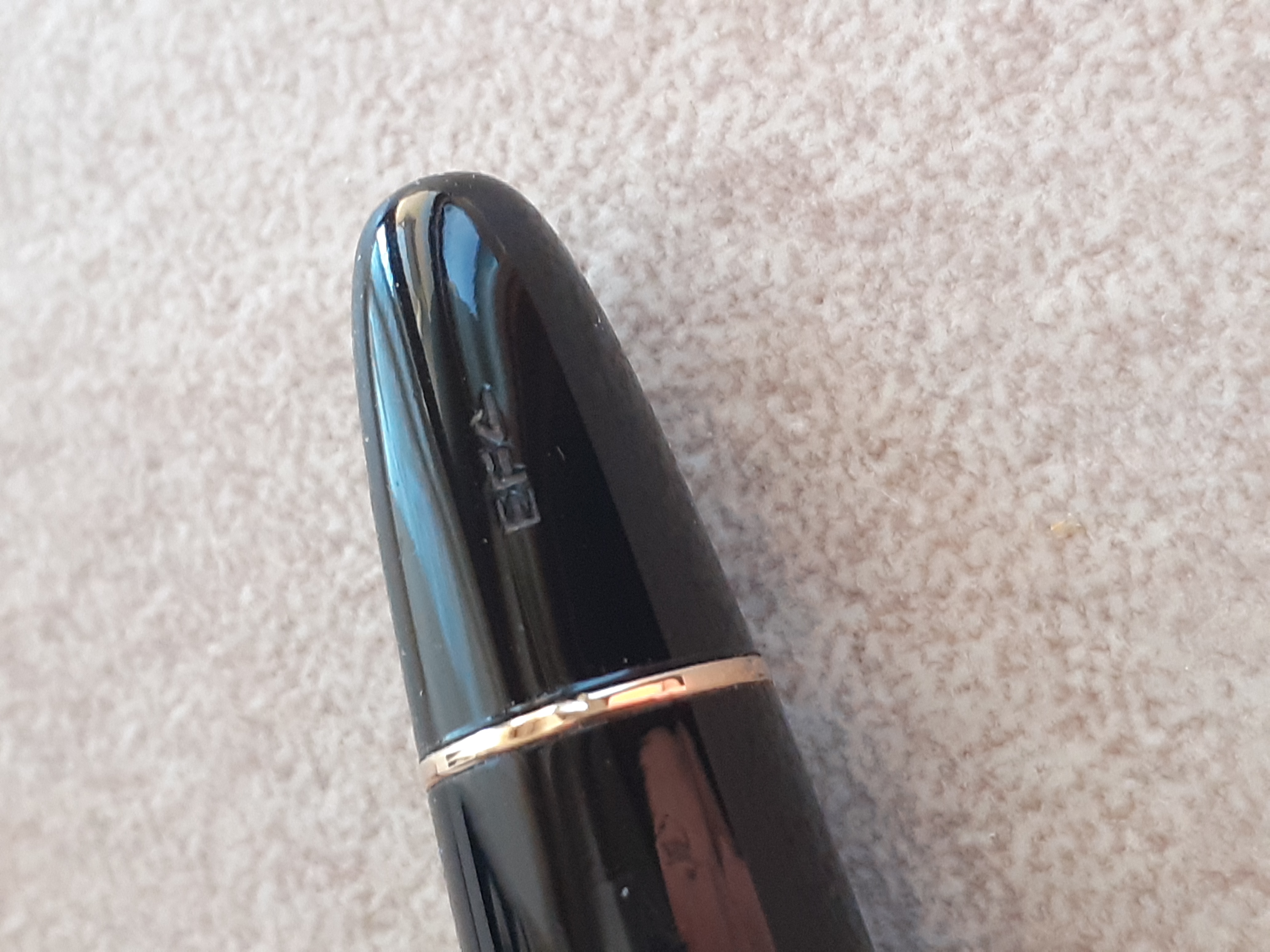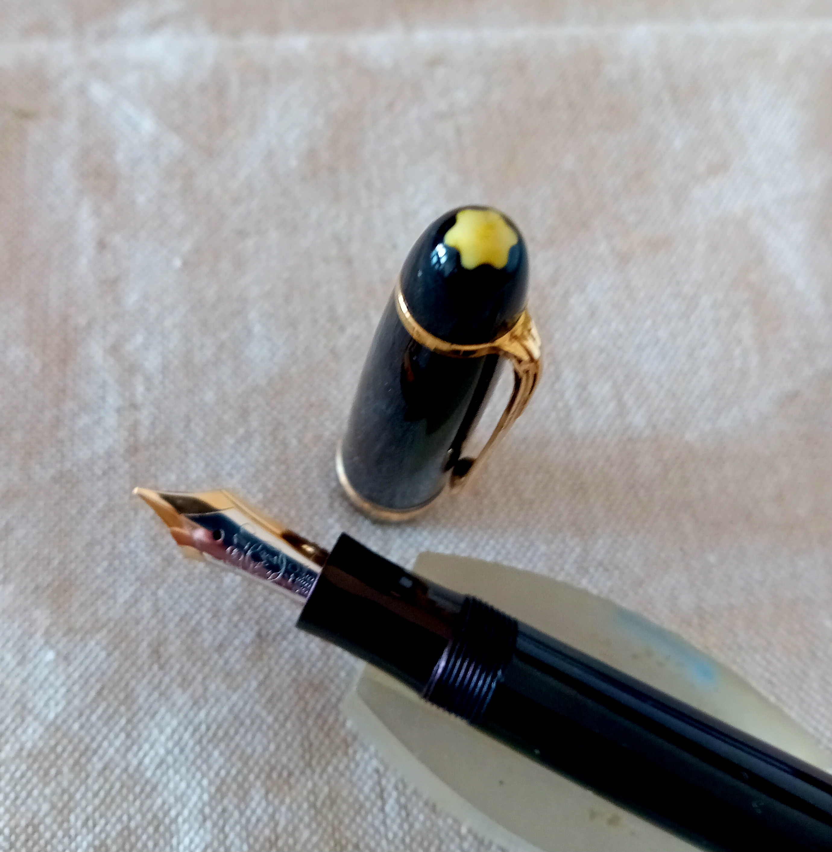 Anche questa proviene dall'ultimo penshow di Bologna. Ovviamente in celluloide e con pistone telescopico, il pennino è un EF, il simbolo riportato dopo sul fondello dovrebbe indicare calligrafico, o almeno è quanto sono riuscito a trovare in rete.