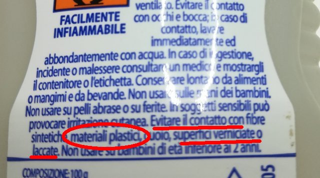 va fatta attenzione, ho esperienza anch'io di azione deleteria sulla plastica (ricordo anni fa che mi si era rovesciata la boccetta del prodotto liquido sul fondo in plastica della tenda da campeggio, al mattino dopo era fusa con un bel buco!