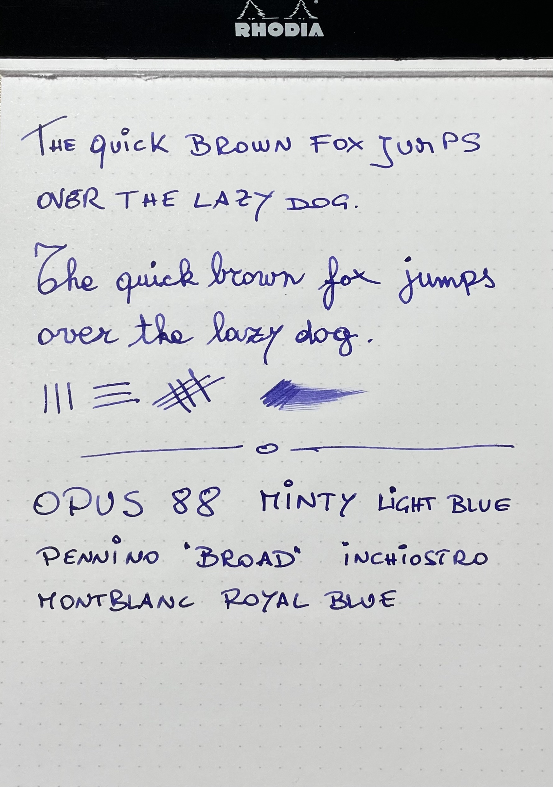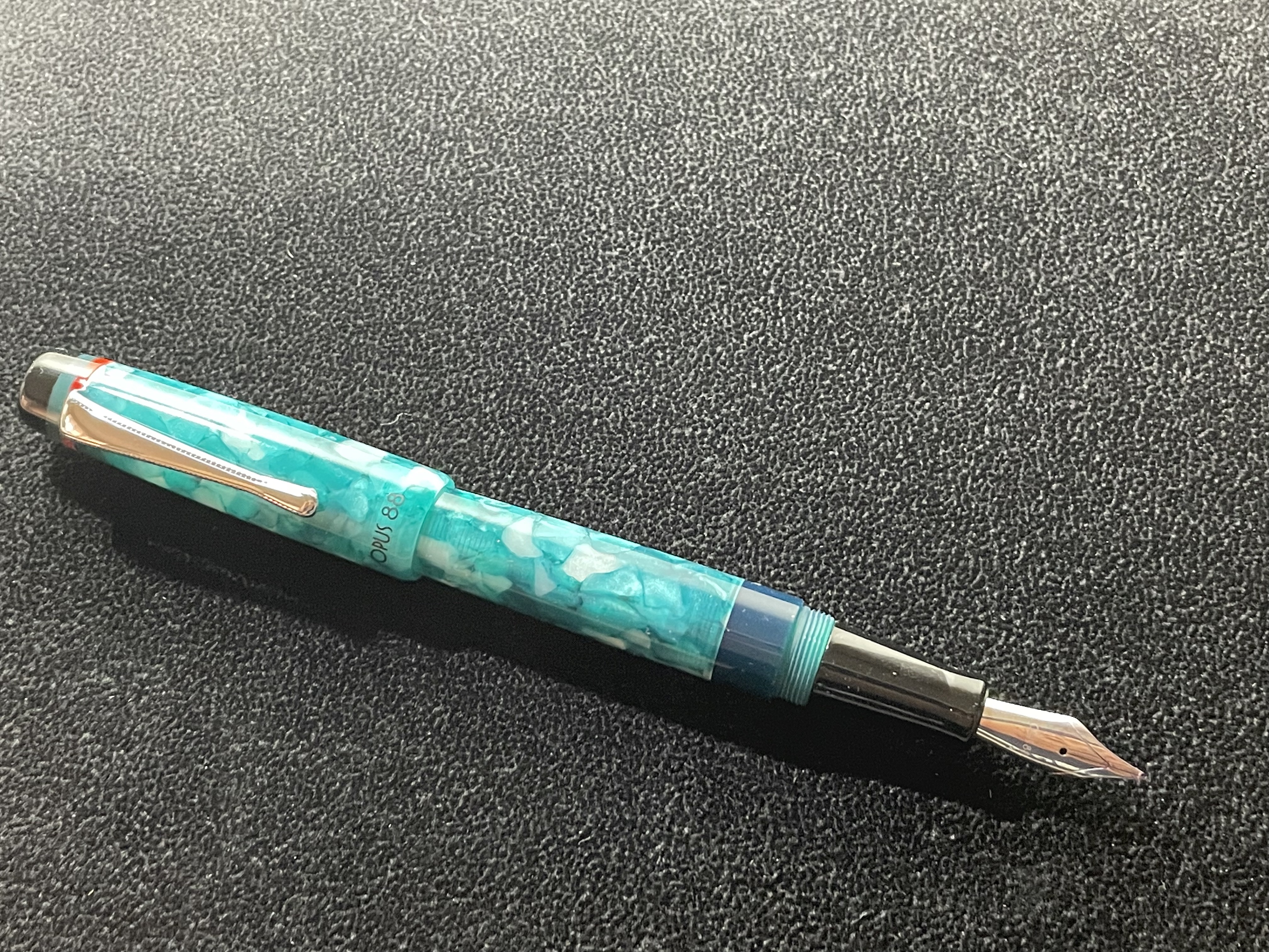 Buongiorno a tutti, questa è la mia prima recensione (forse è meglio dire impressione) di una penna che mi ha fatto sussultare quando l'ho vista per la prima volta. Si tratta di una Opus 88 Minty Light Blue, una penna di dimensioni importanti (io però ho le "manone") con una colorazione per me fantastica. L'ho scelta con il pennino broad perchè preferisco una scrittura ampia e veloce con un flusso giusto o appena leggermente abbondante. Per provarla ho scritto su carta Rhodia che essendo abbastanza patinata non è (secondo me) molto adatta a un pennino broad. Si avranno risultati certamente migliori con carta più ruvida. L'inchiostro usato è il Montblanc Royal Blue che ben gli si abbina. Per concludere... è stato un acquisto d'impulso del quale non mi sono affatto pentito! :mrgreen: