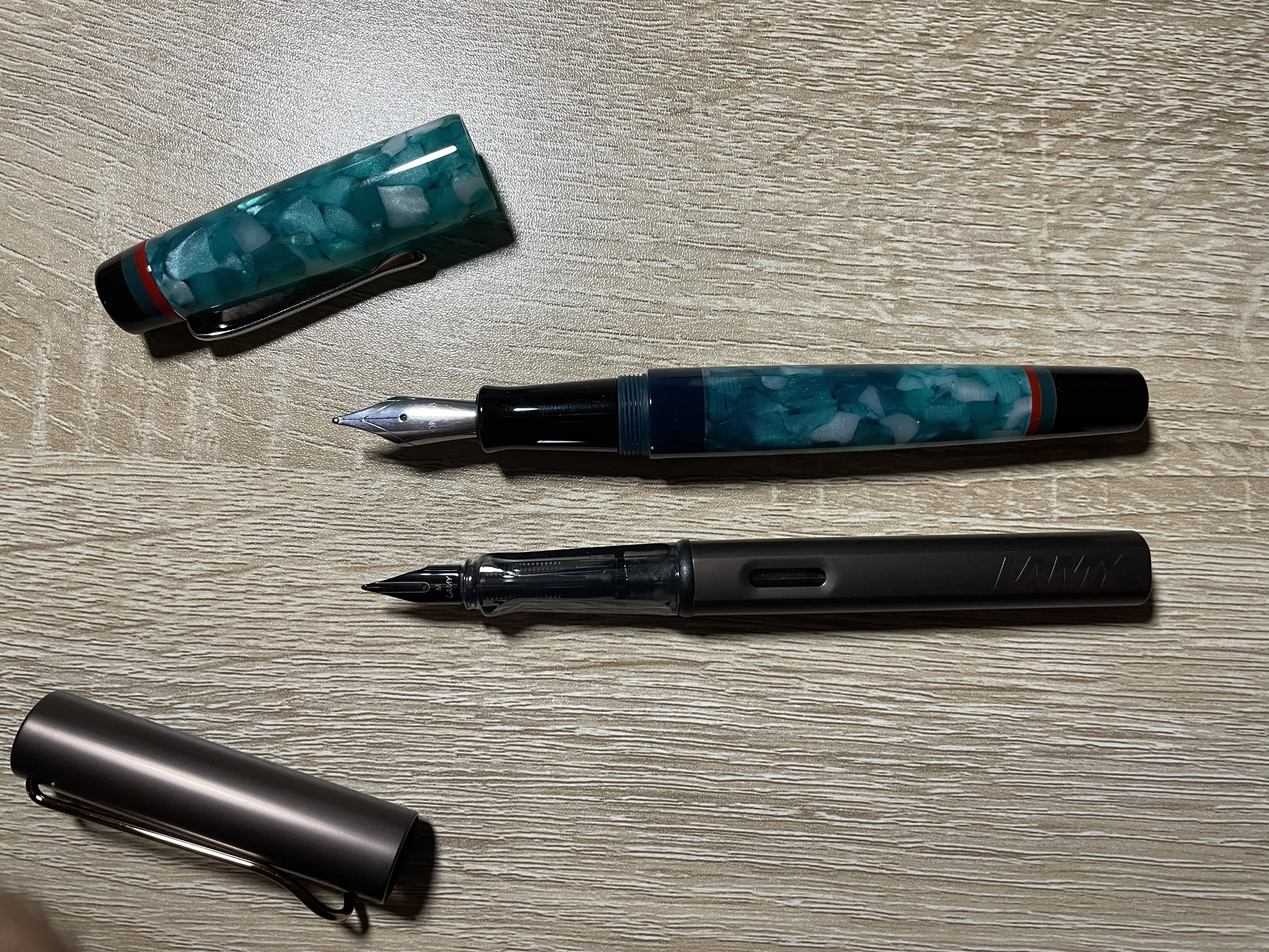 Ciao Sealion, scusa il ritardo, ti allego due foto vicino a una Lamy LX. Chiusa ha circa 1 cm in più, da aperta ha circa 4/5 mm in più...