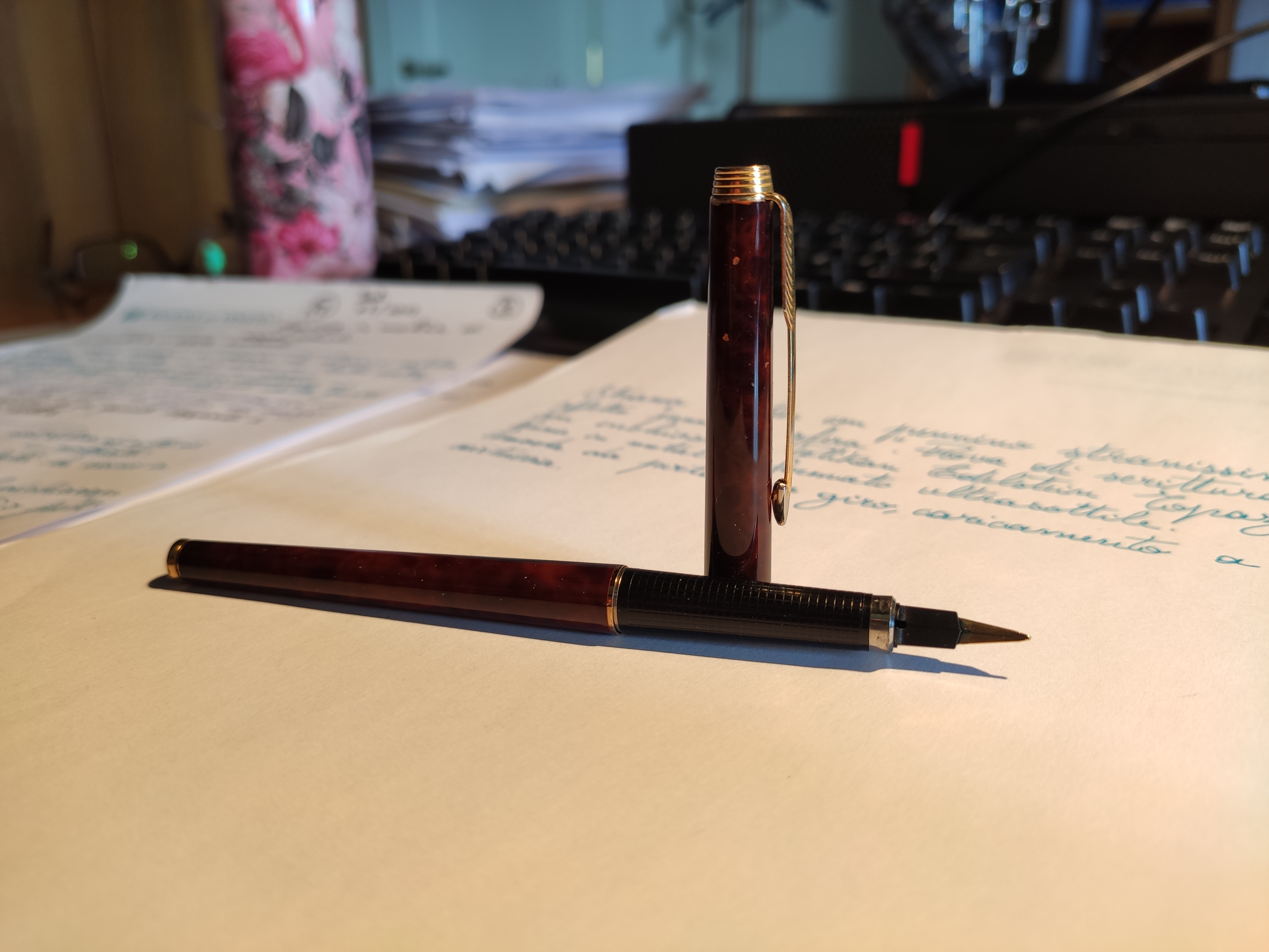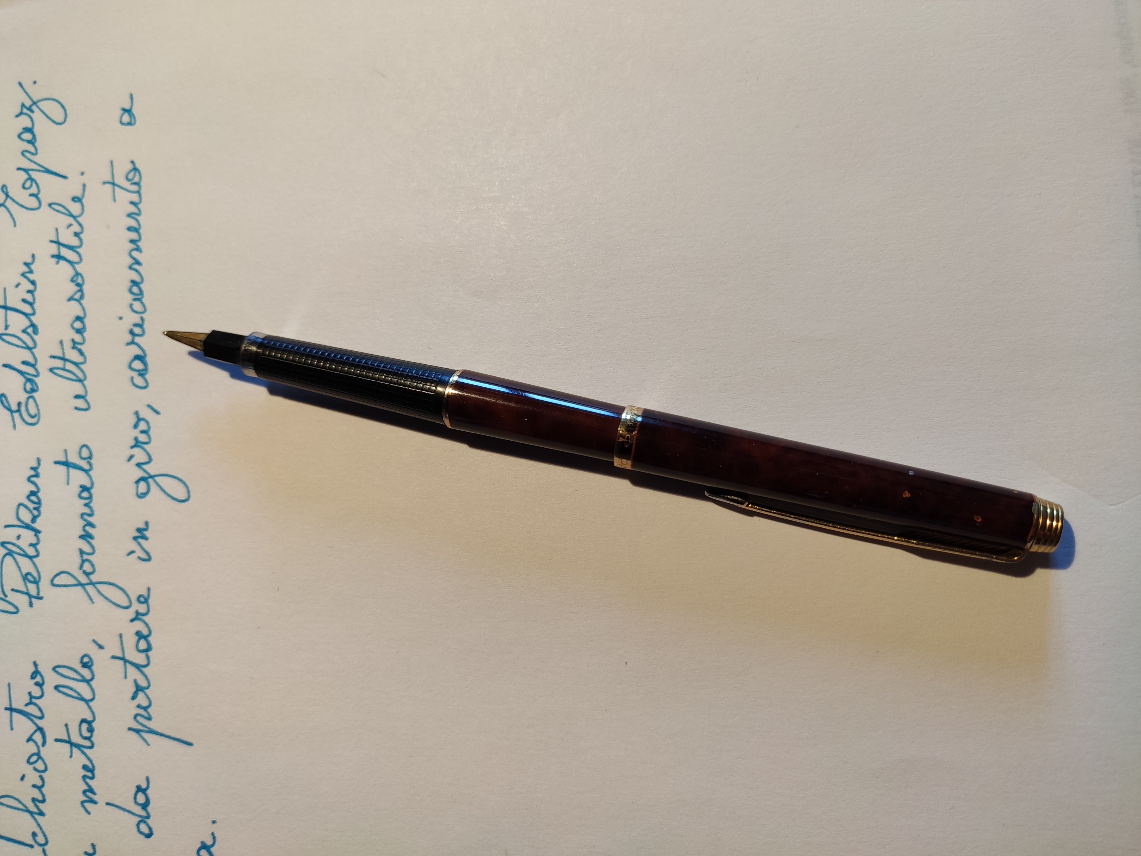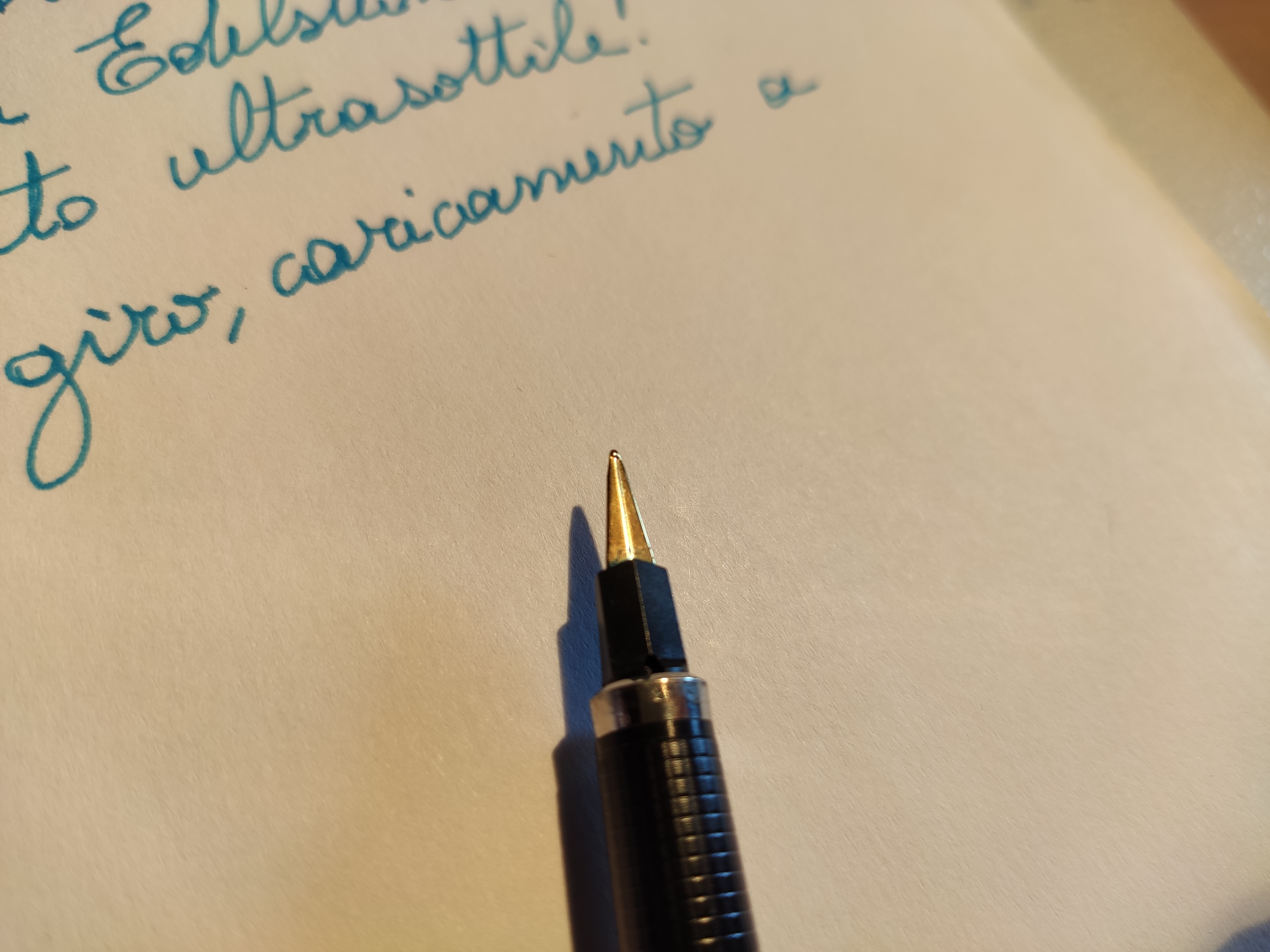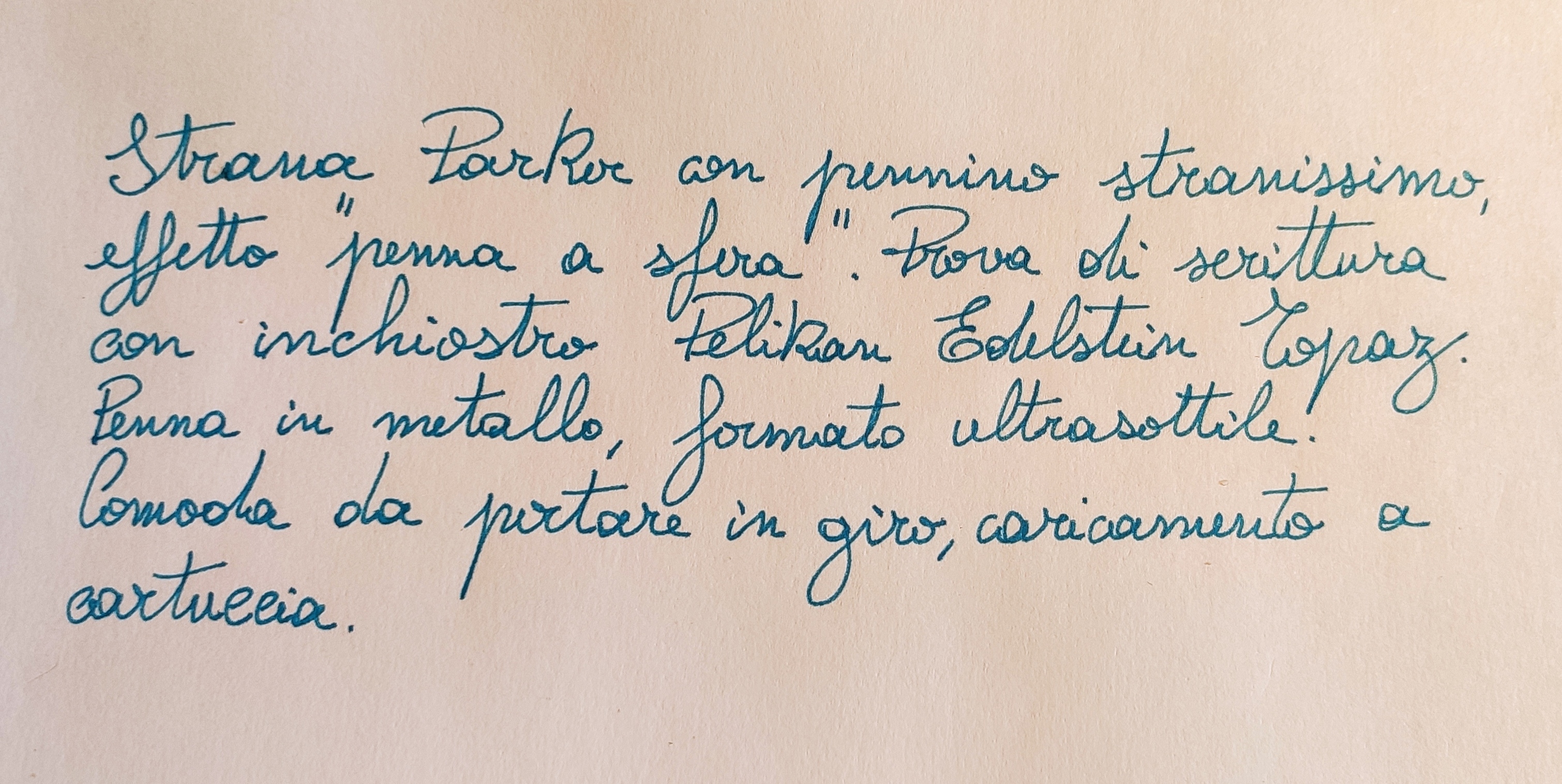 Allego anche un breve esempio di scrittura. Definirei il tratto un fine tendente al medio, non eccessivamente scorrevole, la penna presenta un lieve attrito che ricorda la presa tipica delle penne a sfera.