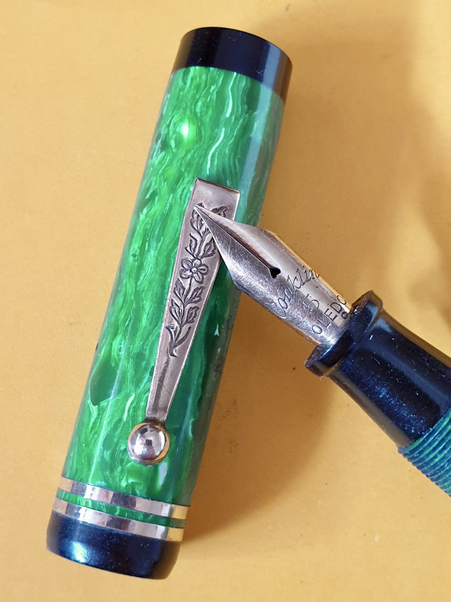 Bellissimo verde marmorizzato per questa probabilmente centenaria Good Service Pen Co. - Chicago in celluloide. Come vedete, pennino importante, coevo ma non originale.