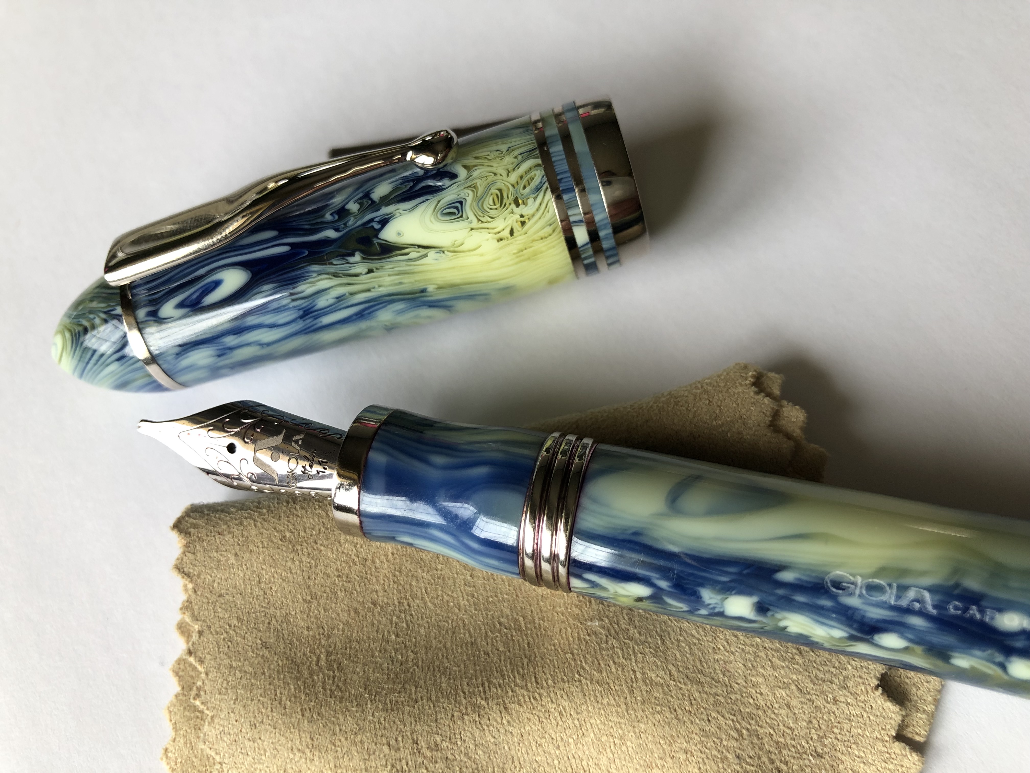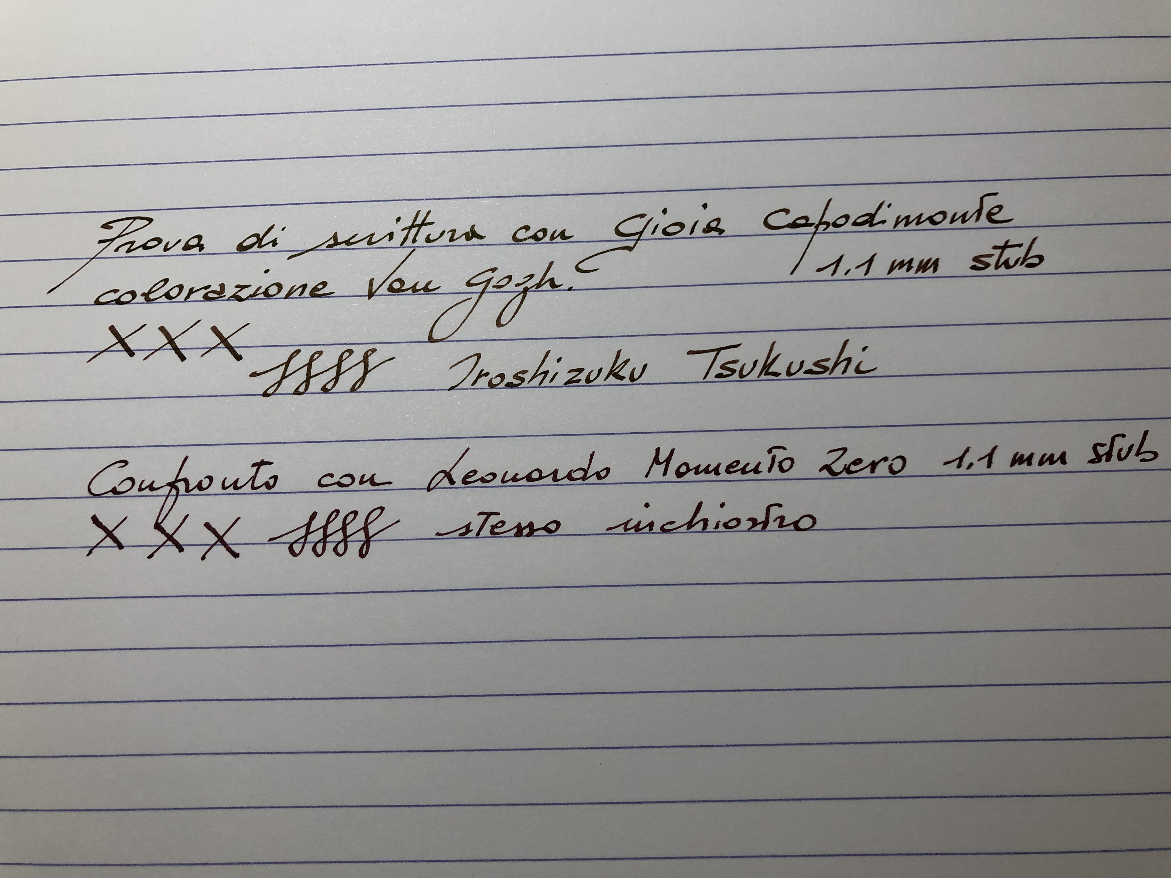 Trovo infine anche gradevole la decorazione scelta per i pennini fatti dalla Jowo marcati "Gioia". Ottima scelta di partner per i pennini. Io scrivo solo con gli stub da 1.1mm e quello montato sulla mia Capodimonte funziona alla perfezione.