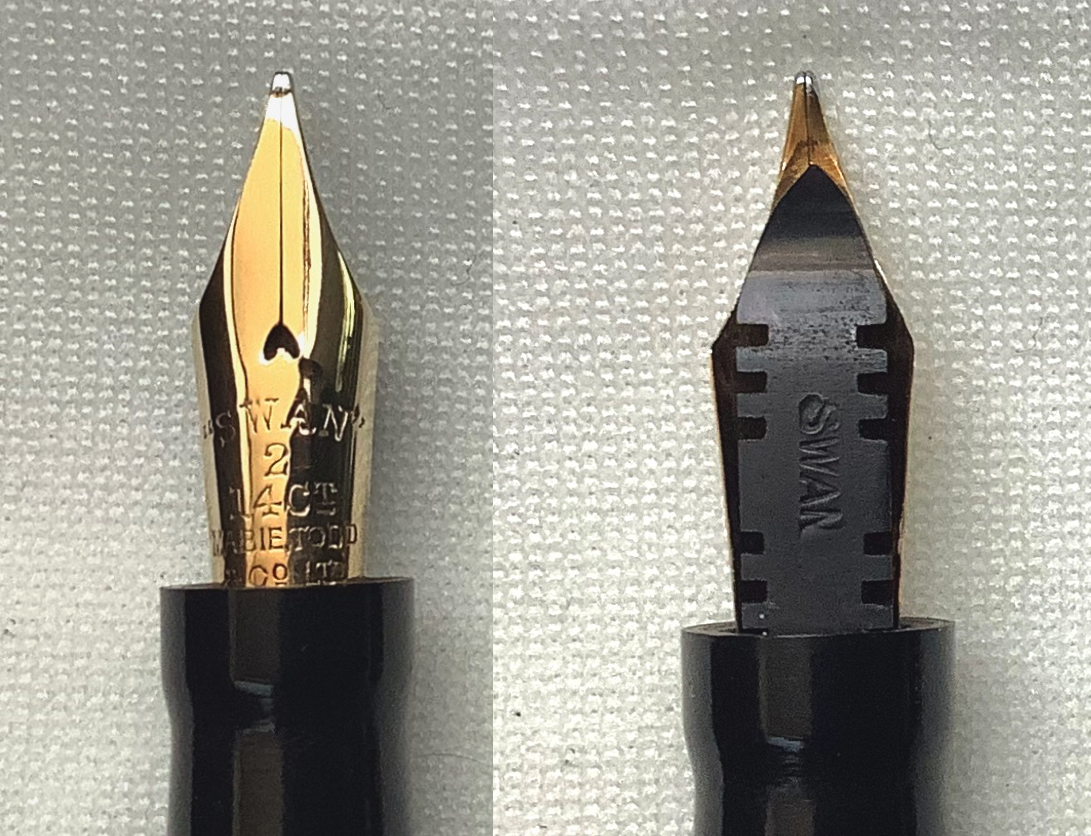 Il pennino è un misura 2 in oro 14 carati e reca impresso “SWAN”, la misura e la caratura espressa in CT , per ultimo il nome del fabbricante MABIE,TODD Co LTD.