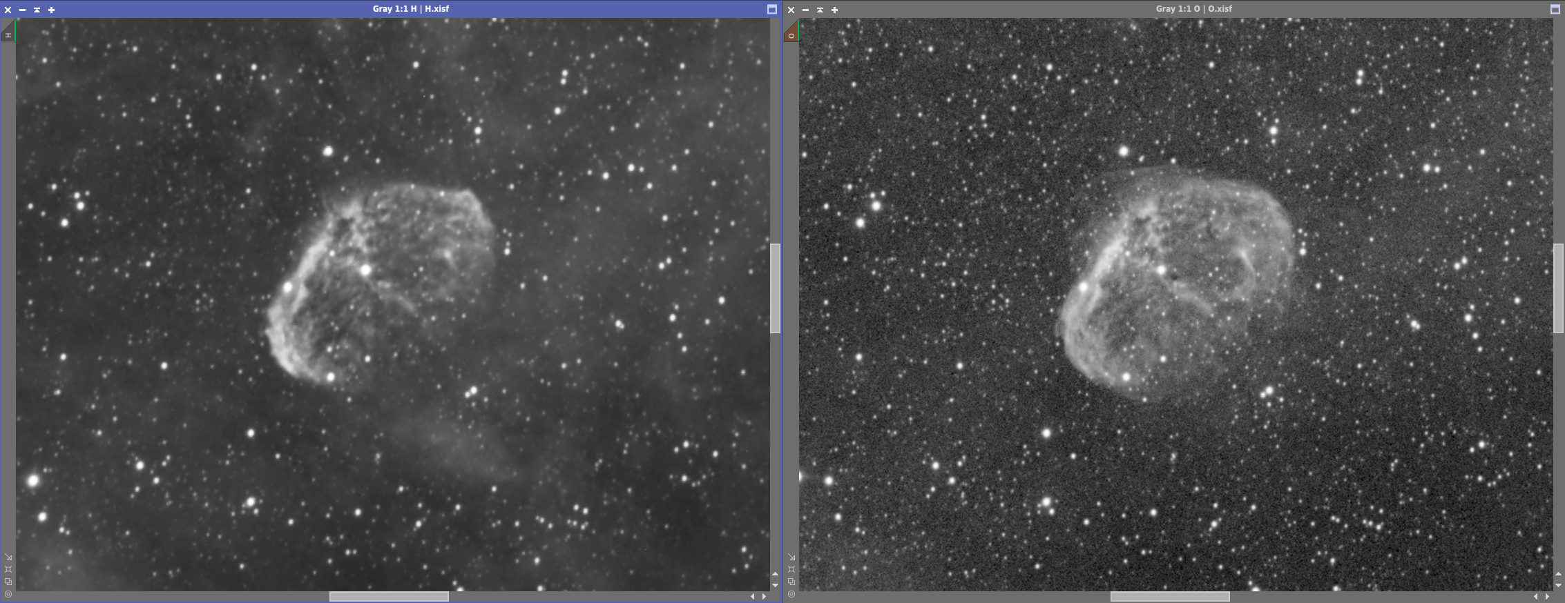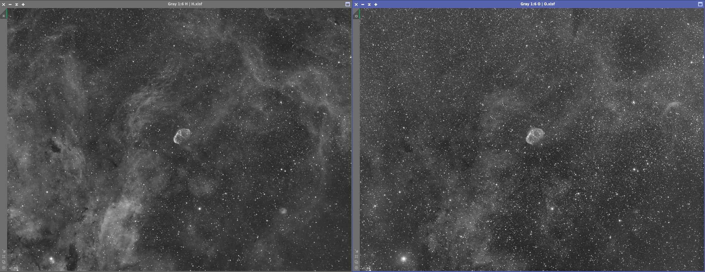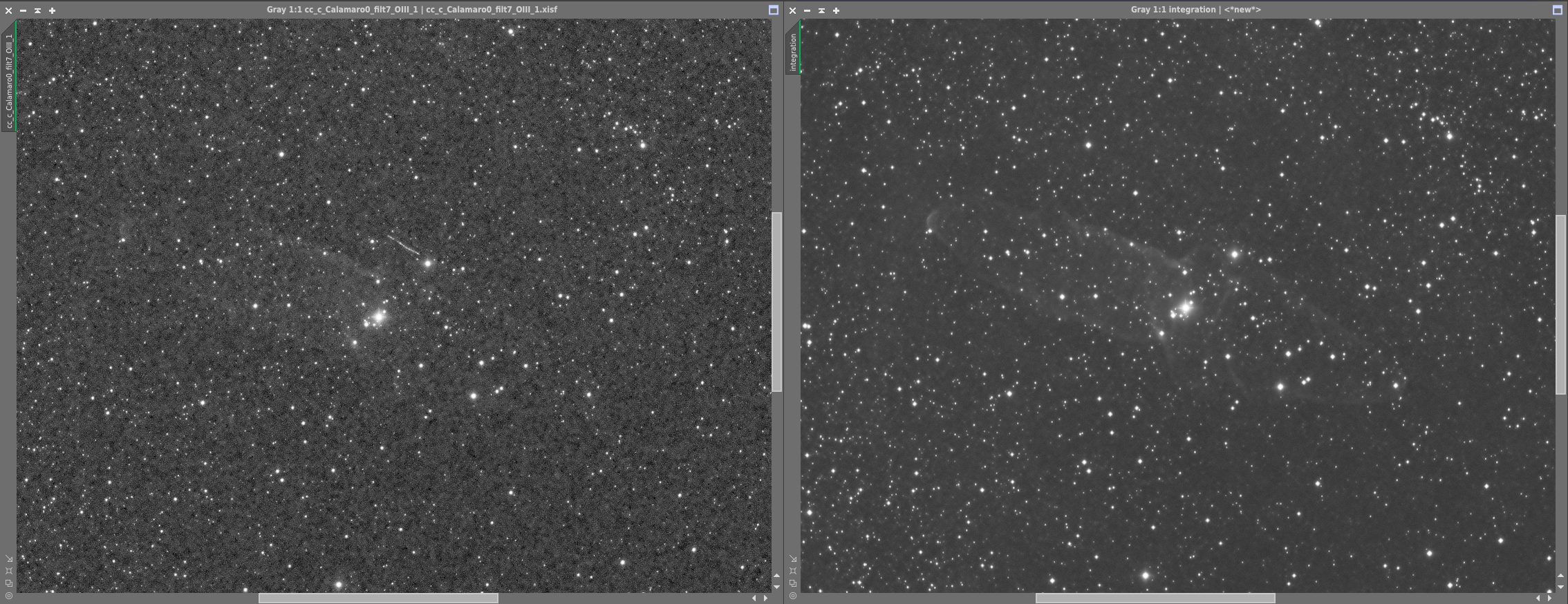 Per la parte di elaborazione vera e propria dell'immagine, non sono riuscito a riprendere il canale H-Alfa nella zona del Calamaro (mannaggia al maltempo!), quindi tornerò ai dati della Crescent Nebula ripresa nella sessione fotografica precedentemente descritta. In realtà, in quella sessione avevo ripreso con il solo filtro OIII, da cui deriva un solo Master Light; le riprese con il filtro H-Alfa risalgono a una nottata identica del 2019. Ecco i due Master Light pronti per iniziare.