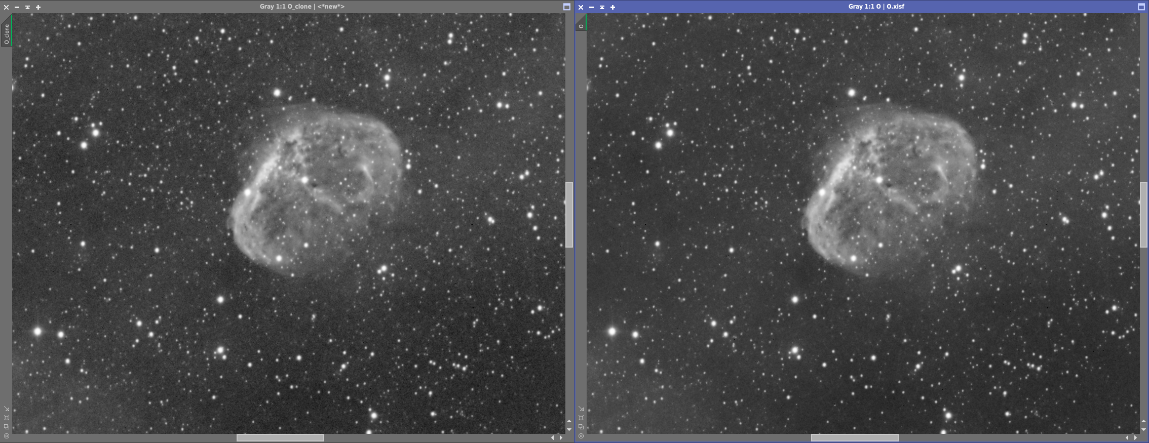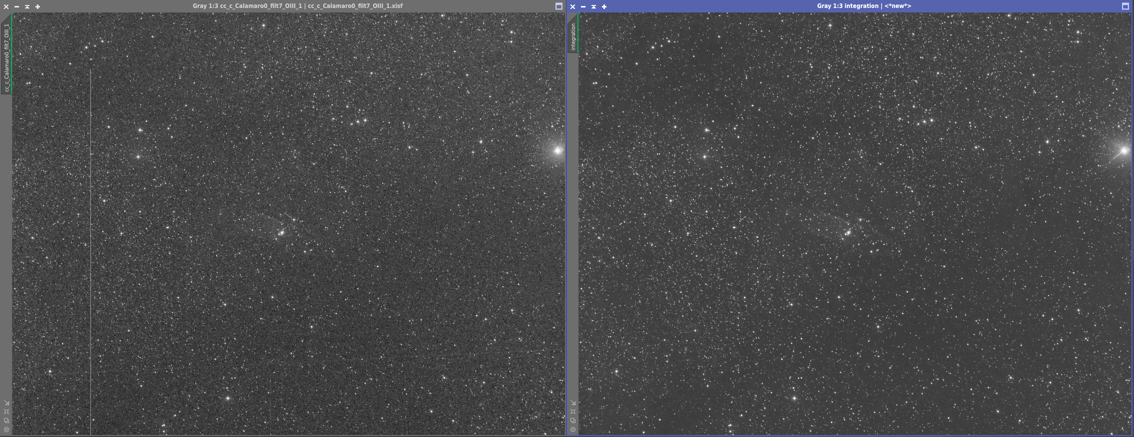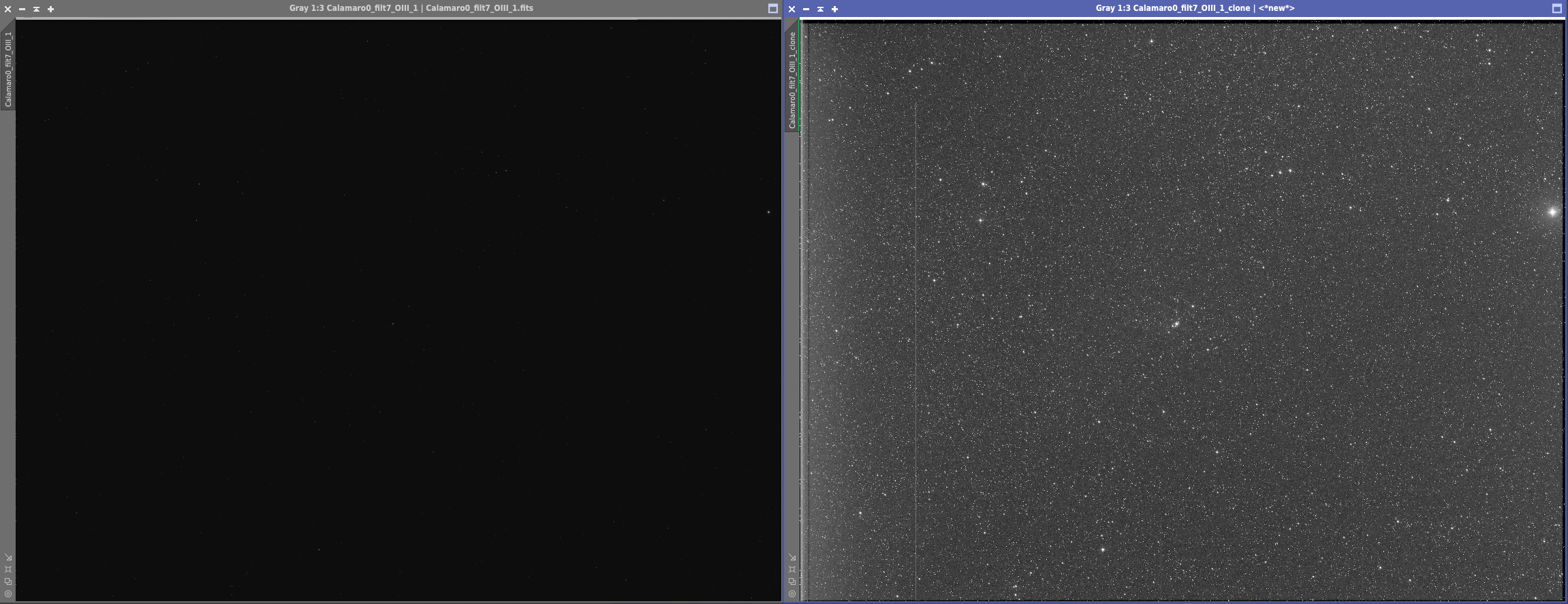 Per la parte di elaborazione vera e propria dell'immagine, non sono riuscito a riprendere il canale H-Alfa nella zona del Calamaro (mannaggia al maltempo!), quindi tornerò ai dati della Crescent Nebula ripresa nella sessione fotografica precedentemente descritta. In realtà, in quella sessione avevo ripreso con il solo filtro OIII, da cui deriva un solo Master Light; le riprese con il filtro H-Alfa risalgono a una nottata identica del 2019. Ecco i due Master Light pronti per iniziare.