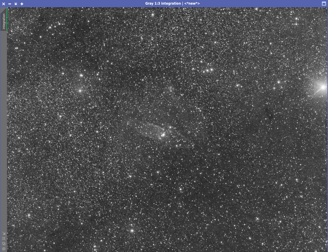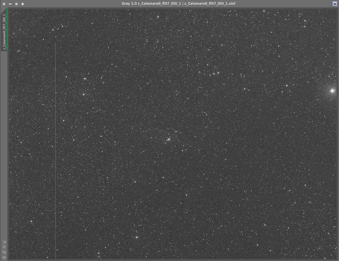La calibrazione dei 42 scatti ripresi nelle 3 nottate richiede quasi quattro minuti, ma ci restituirà immagini molto più pulite e lavorabili. Come si può vedere, della nebulosa si può appena intuire la presenza al centro dell'immagine.