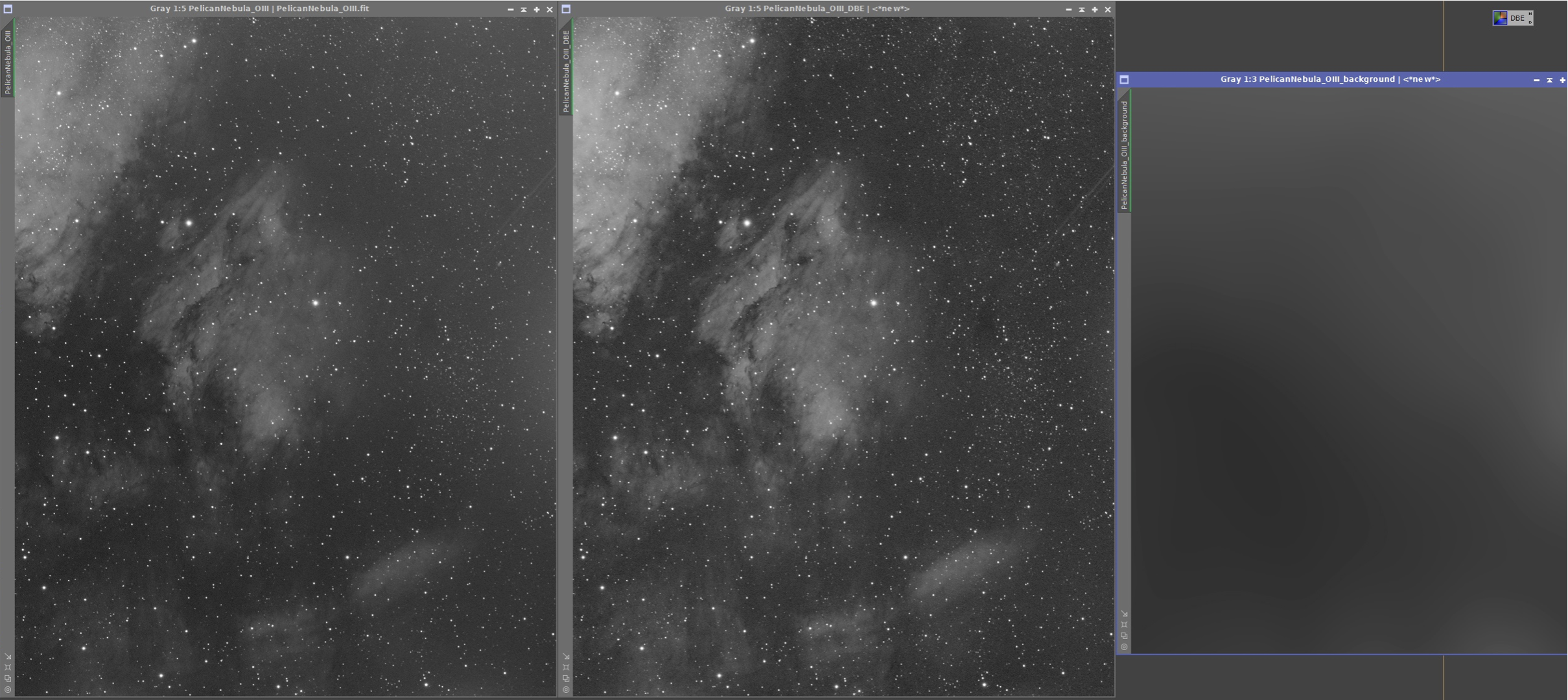 Normalmente la prima operazione dovrebbe essere quella di rimuovere i gradienti luminosi presenti nell'immagine (dovuti all'inquinamento luminoso o alla presenza della Luna Piena). Prendo un esempio dal web della Nebulosa Pellicano fotografata in OIII con Luna piena particolarmente alta che ha generato un'illuminazione di tutta la parte superiore destra della foto. Lo strumento che permette di correggere questo genere di gradienti chiede di apporre un segnalino sulle zone di fondo cielo visibili nella foto (zone non interessate da nebulose o altri oggetti che dovrebbero essere nere) e, supponendo che il cielo di sfondo sia tutto luminoso alla stessa maniera, calcola la differenza di luminosità nelle varie zone, le sfuma e genera l'immagine "background" (quella più a destra) in cui si vede il problema estrapolato dall'immagine. Chiedendo di sottrarlo all'immagine, genererà anche una versione più pulita e corretta della foto. Purtroppo i filtro OIII è particolarmente sensibile alla presenza della Luna, visto che la nostra atmosfera è costituita al 21% da Ossigeno. La rifrazione della luce lunare ad opera dell'atmosfera assume anche il colore dell'ossigeno che non sarà scartato dal filtro, ma preso per segnale buono.