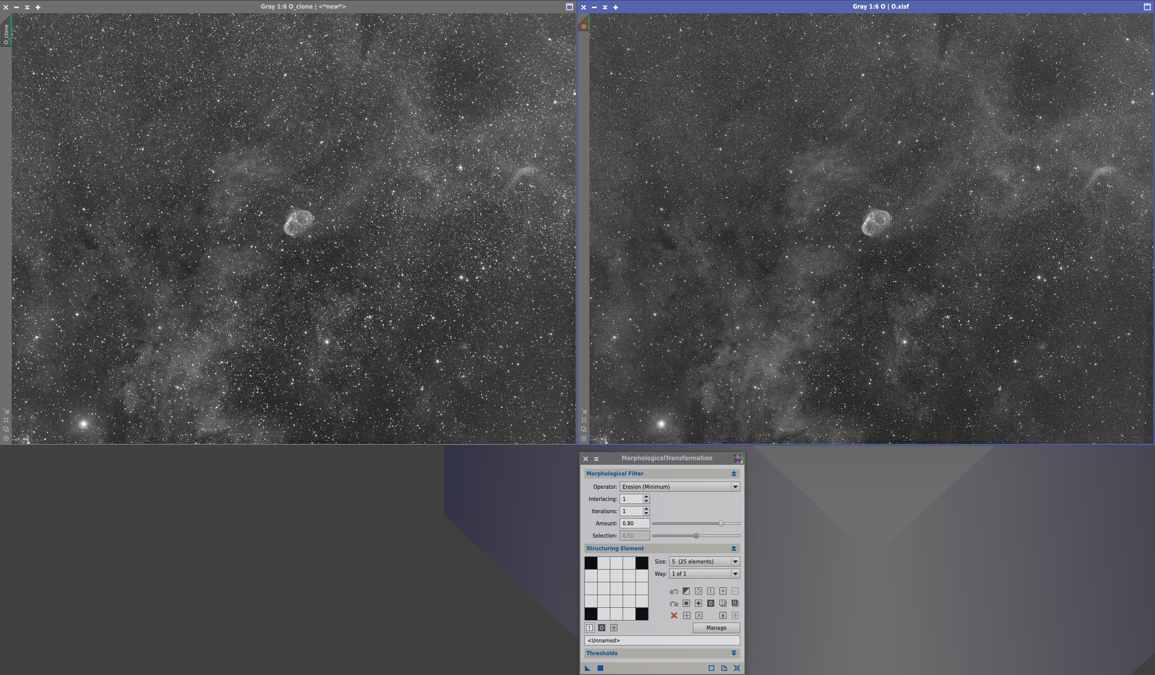 Prima e dopo l'erosione. in Basso la finestra del process con i parametri a cui ho ridotto l'efficacia (Amount) per avere stelle più simili ad H, altrimenti sarebbero state ancora più piccole, ribaltando il problema.