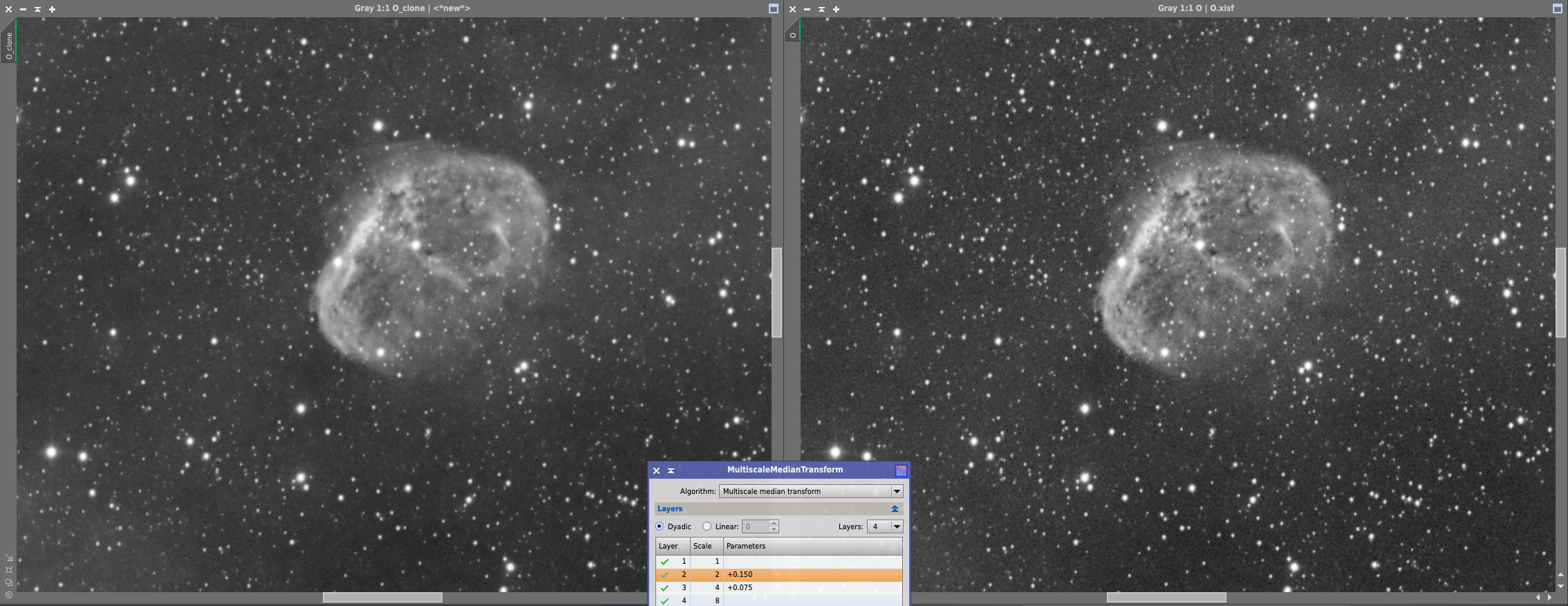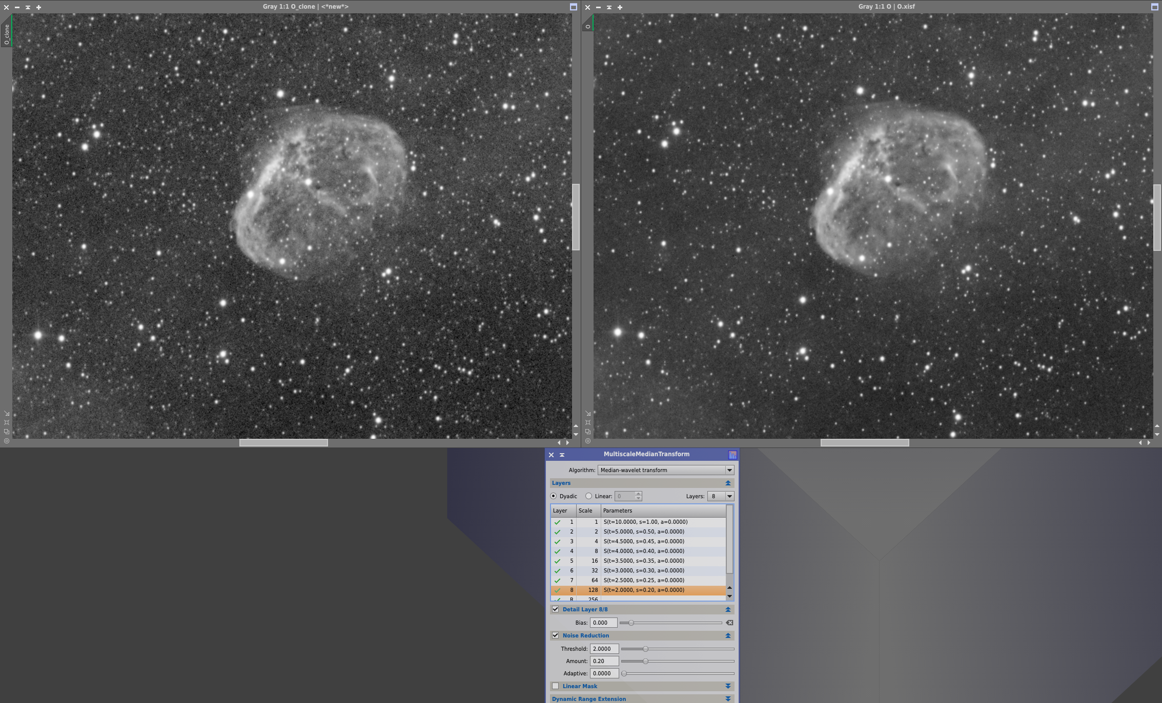 Riduzione del rumore. Per prima cosa disattiviamo la Star Mask, poi applichiamo MultiscaleMedianTransform (per gli amici MMT). Questo process, essendo "multiscale", permette di impostare parametri di riduzione del rumore differenti in base alle dimensioni della grana da rimuovere. Il layer 1 si occuperà della grana finissima (1x1 pixel), il layer 2 della grana da 2x2 pixel e così via. Il grosso del rumore risiede nei primi 3 layer e, man mano che si aumenta di dimensioni, bisogna stare attenti a non cancellare le strutture della nebulosa. Il grande potere di questo process risiede proprio nel poter diminuire l'efficacia e abbassare la soglia di rifiuto all'aumentare dei layer. Lo vedete nell'immagine che vengono presi in considerazione i layer fino all'ottavo, ma con soglia e efficacia decrescenti. Ancora una volta, nell'immagine il confronto pre e post trattamento