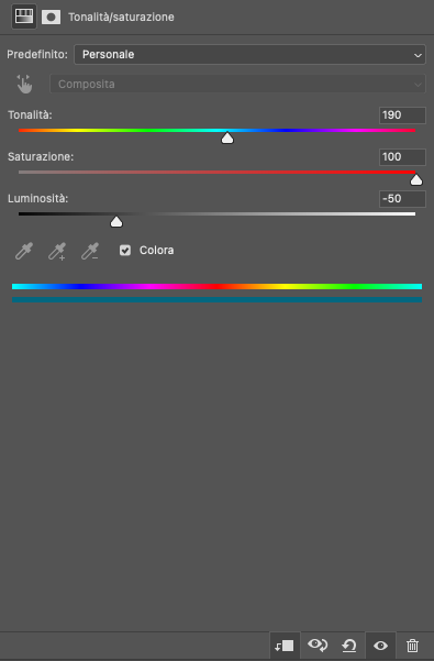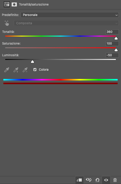 Per colorare l'immagine, ho intenzione di rifarmi ai colori naturali dei due gas: H è rosso, mentre O è azzurro. Selezioniamo i livelli uno alla volta e apriamo per ciascuno un livello di regolazione Tonalità/Saturazione e impostiamo come di seguito per colorarli (attenzione alla freccina in basso, fondamentale per applicare la regolazione solo al livello sottostante e non a tutti i livelli).