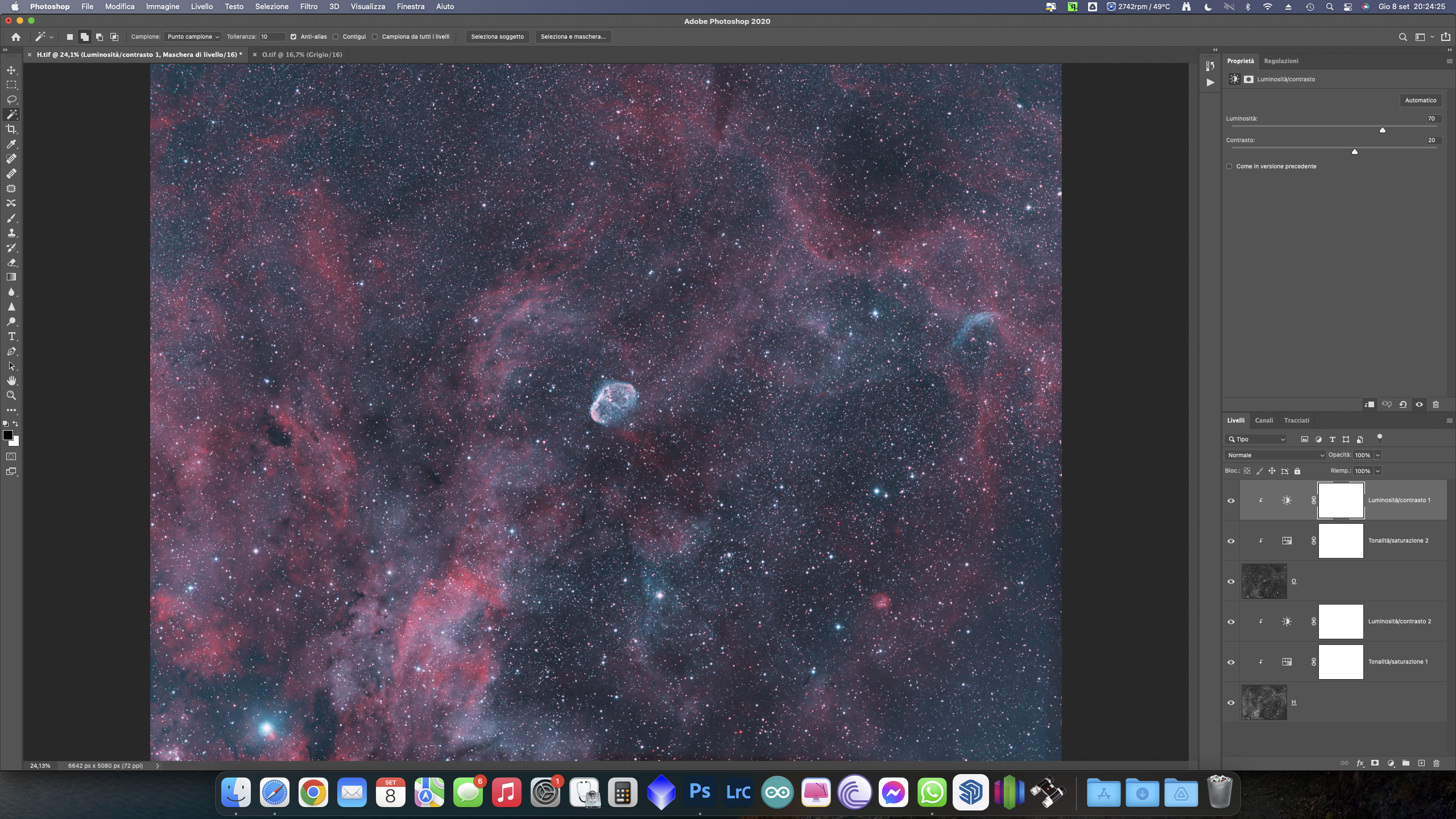 Aprendo un livello di regolazione Luminosità/Contrasto sarà possibile sistemare i due livelli in modo da accentuare di più la presenza di uno o dell'altro a piacere. Personalmente mi piace che O si veda e non venga sovrastato dall'abbondanza di H (anche se questo rende meno "naturale" l'immagine: il segnale di O è solitamente 1/10 di quello di H!). La parte più bella del lavoro su PS è la regolazione in tempo reale dei parametri. Ogni modifica viene mostrata a schermo senza dover fare il passo indietro e un altro tentativo. Tutto ciò velocizza molto le operazioni e rende più semplice regolare l'estetica dell'immagine. In poco si arriva a questo risultato