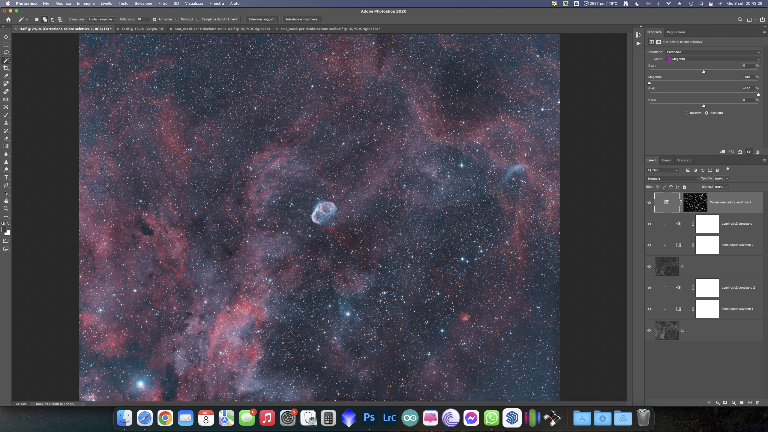 Apriamo un livello di regolazione Correzione Colore Selettiva, lasciamola applicata a tutta l'immagine (non a un singolo livello) e facciamo in modo che vada a toccare solo le stelle: recuperiamo la Star Mask fatta in precedenza per ridurre le stelle in O e apriamola in PS (servirà salvarla in tiff 16 bit), selezioniamola tutta e copiamo. Ora torniamo sul livello di regolazione Correzione Colore Selettiva: il riquadro bianco sul livello indica eventuali zone mascherate su cui il livello non deve agire, qui dobbiamo mettere la nostra Star Mask. Alt+clic sul riquadro bianco e incolliamo la Star Mask. Su PS le maschere funzionano al contrario (le zone nere sono protette), quindi invertiamo l'immagine con Ctrl+i. Clicchiamo su un qualsiasi altro livello per tornare alla nostra immagine e accediamo alle regolazioni: il problema è nel canale del magenta, quindi selezioniamo quello al posto del rosso e regoliamo in modo da eliminare completamente il magenta e aumentare il giallo al massimo. Vedremo le stelle cambiare colore fino ad arrivare a questa situazione.