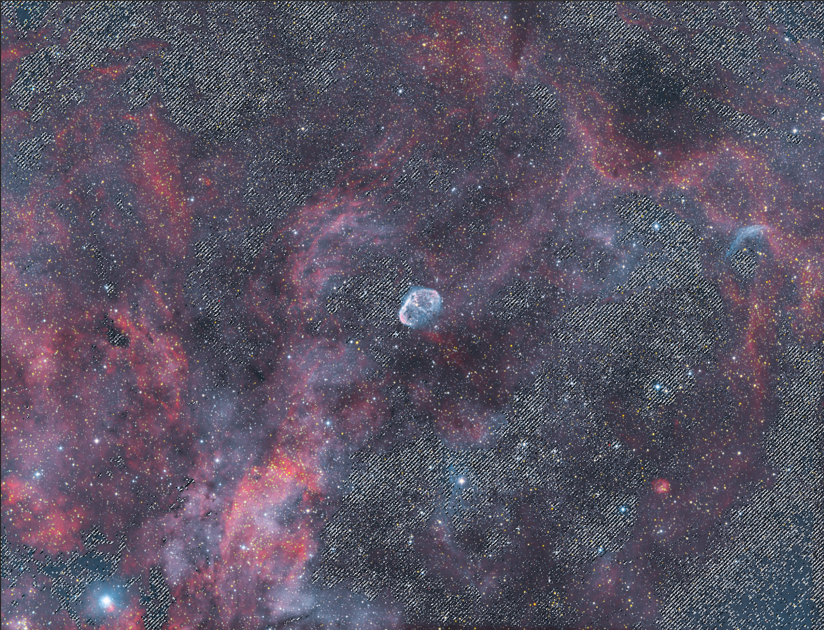 Creando un'immagine RGB usando solo R e B (rosso e blu), inevitabilmente qualcosa manca. Salta immediatamente all'occhio che le stelle sono tutte rosse e azzurre e la cosa non va bene (le stelle rosse sono molto rare nell'universo, soprattutto se parliamo di questo rosso magenta!).