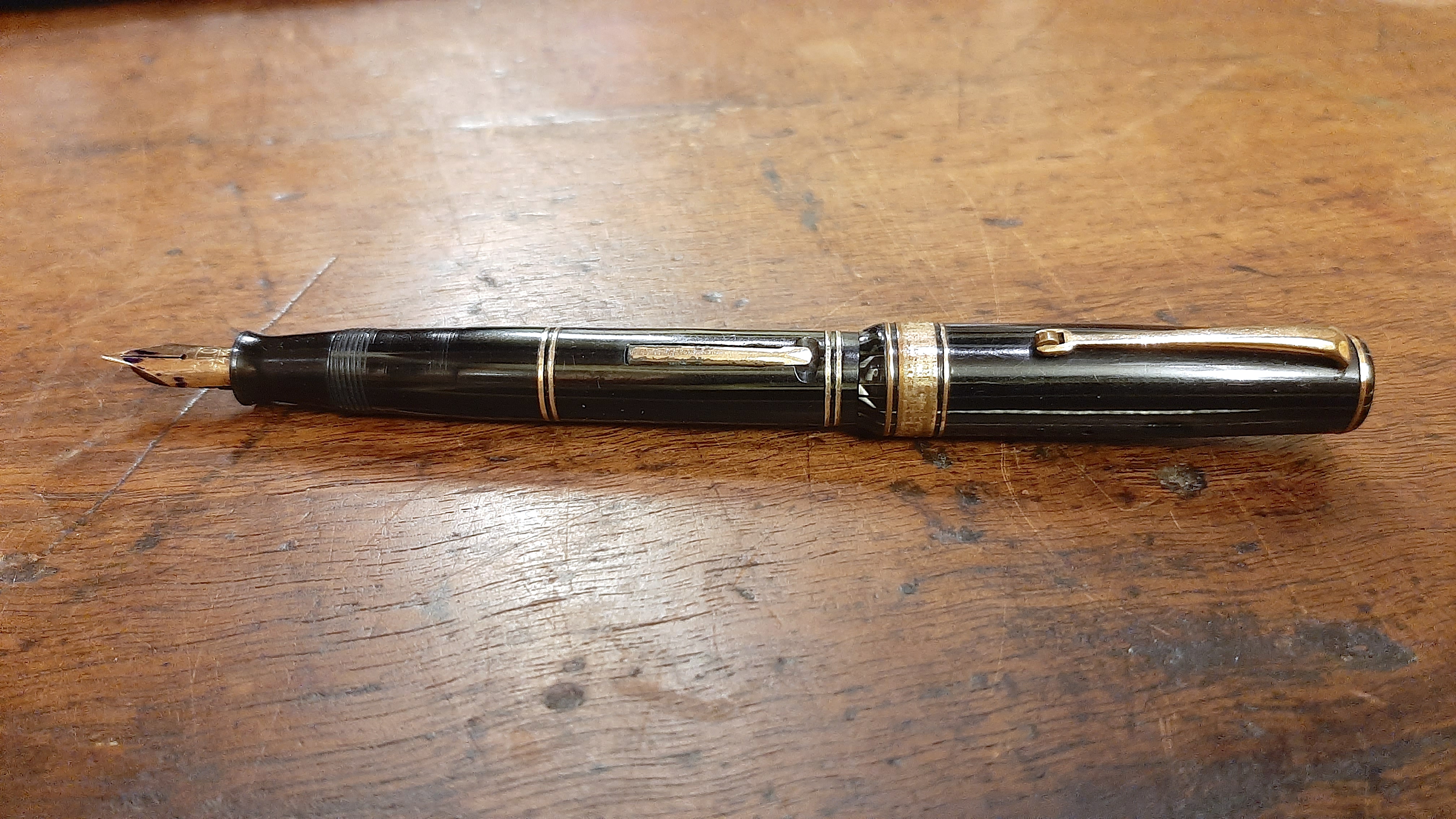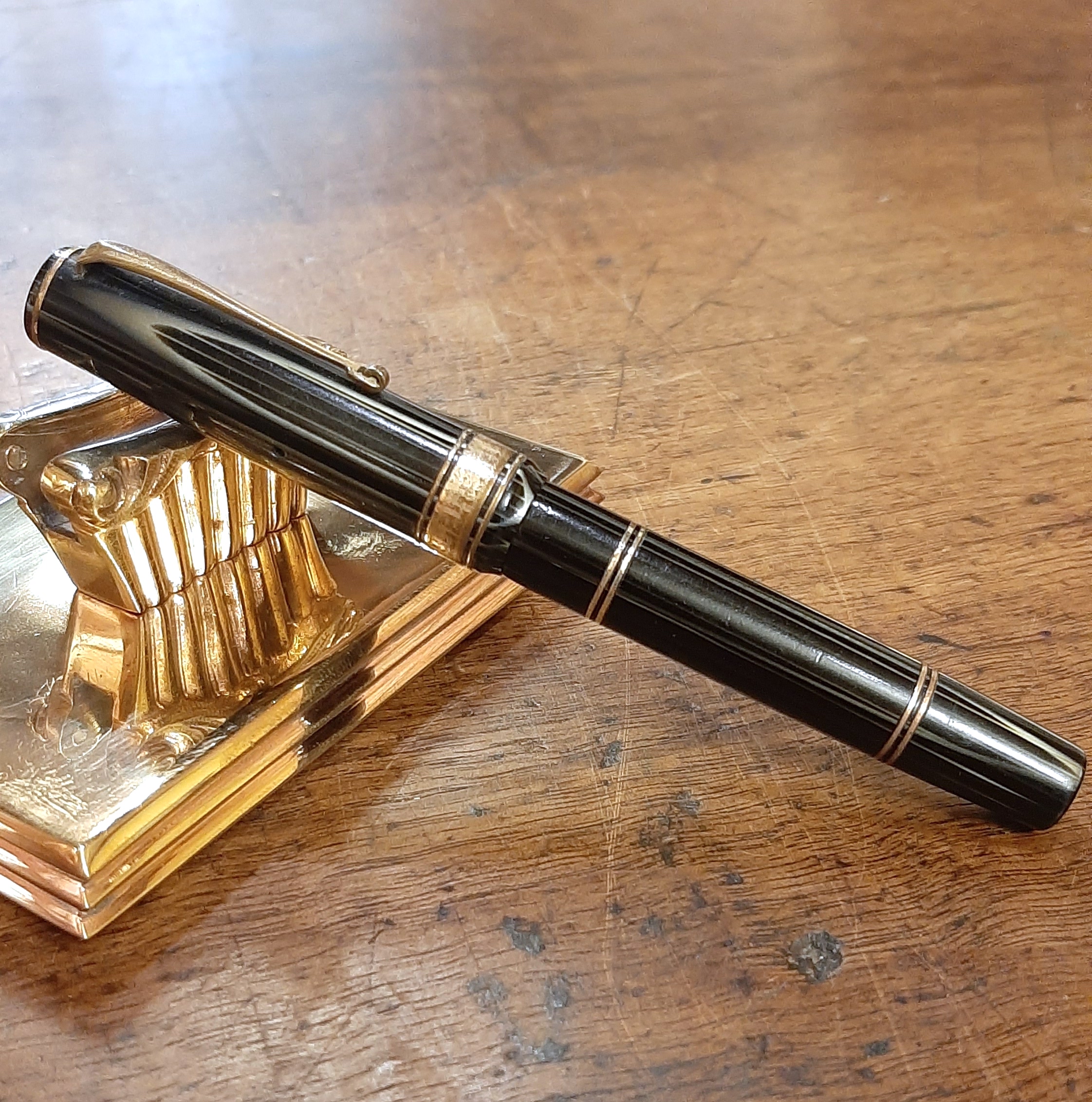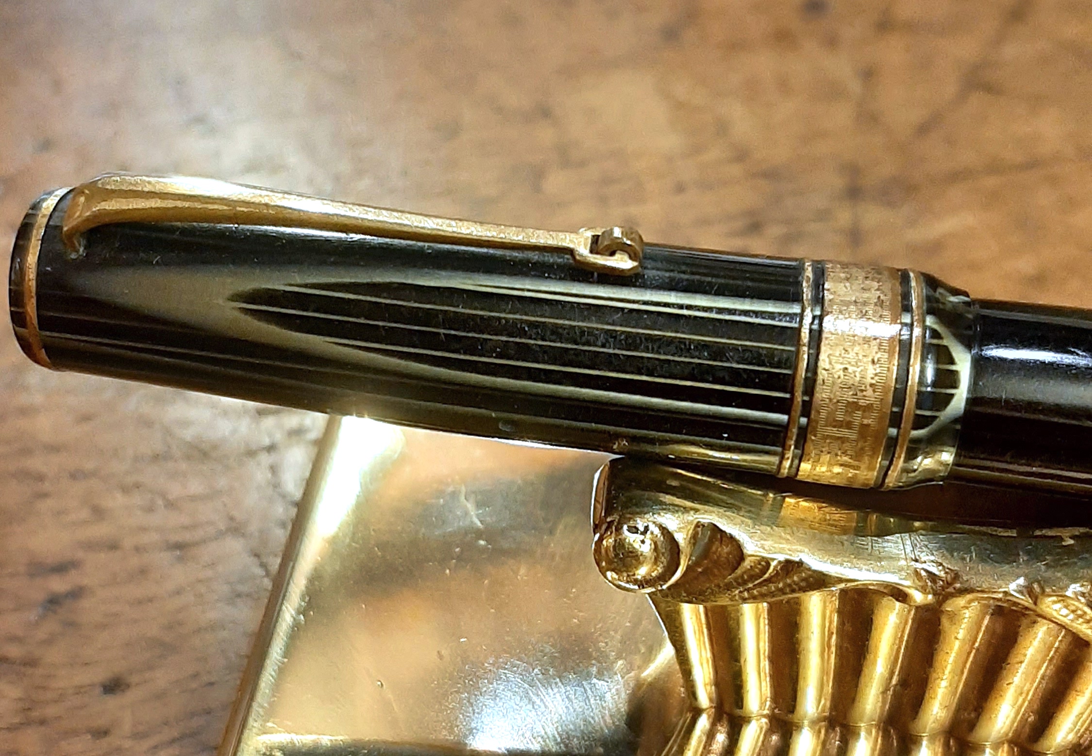 La foto della stilografica più significativa sarebbe, però, quella che attualmente ancora manca alla tua bella presentazione: ovvero quella "con cappuccio calzato". Così erano ritratte e pubblicizzate, perché così erano state progettate, e quindi normalmente utilizzate, le stilografiche... Come "suonano" quelle coppie di anellini in rapporto alla vera grecata, che "ritmo" dovevano avere per il loro progettista e per il loro acquirente dell'epoca, nella penna "pronta a scrivere"? Senza questa foto la penna non può nemmeno entrare in gara in Archivio...