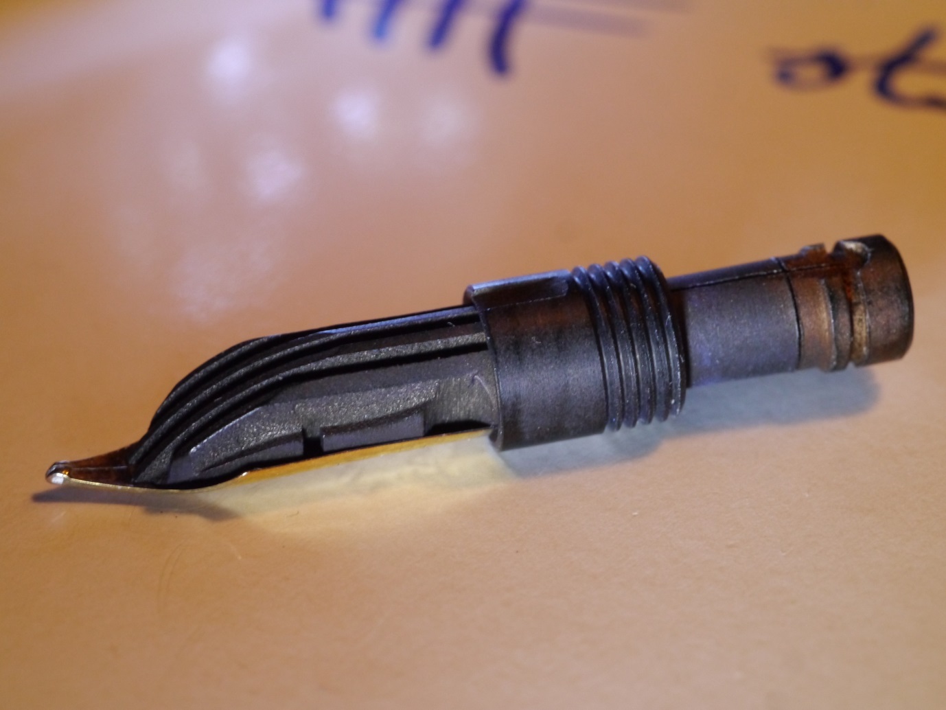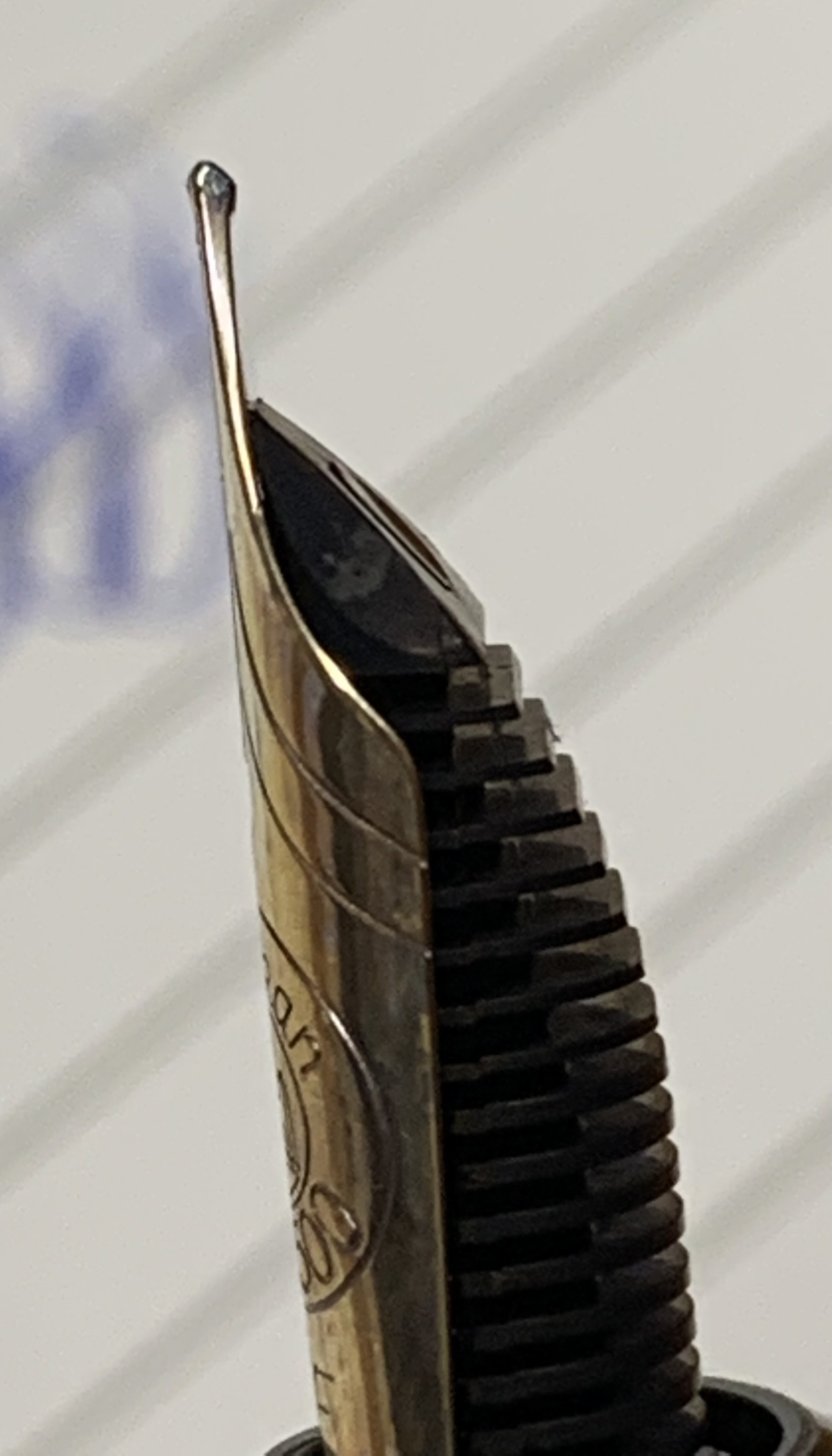 questo è il pennino di una 140 precedente al 1954, come vedi il lato del pennino, dove c'è l'iridio non è arrotondato, è piatto, quindi quando lo appoggi sul foglio è come se fosse un cilindro non una sfera.