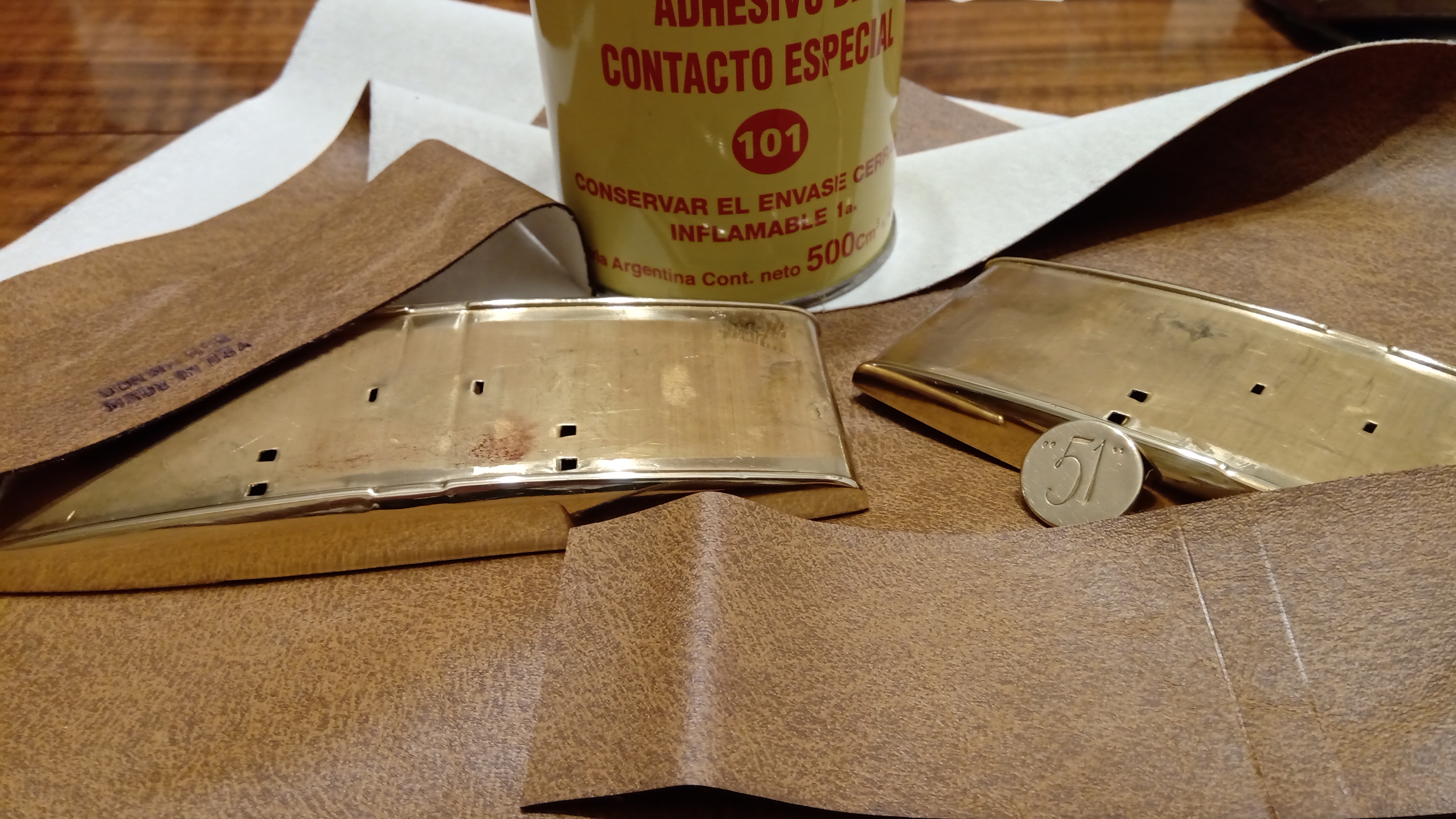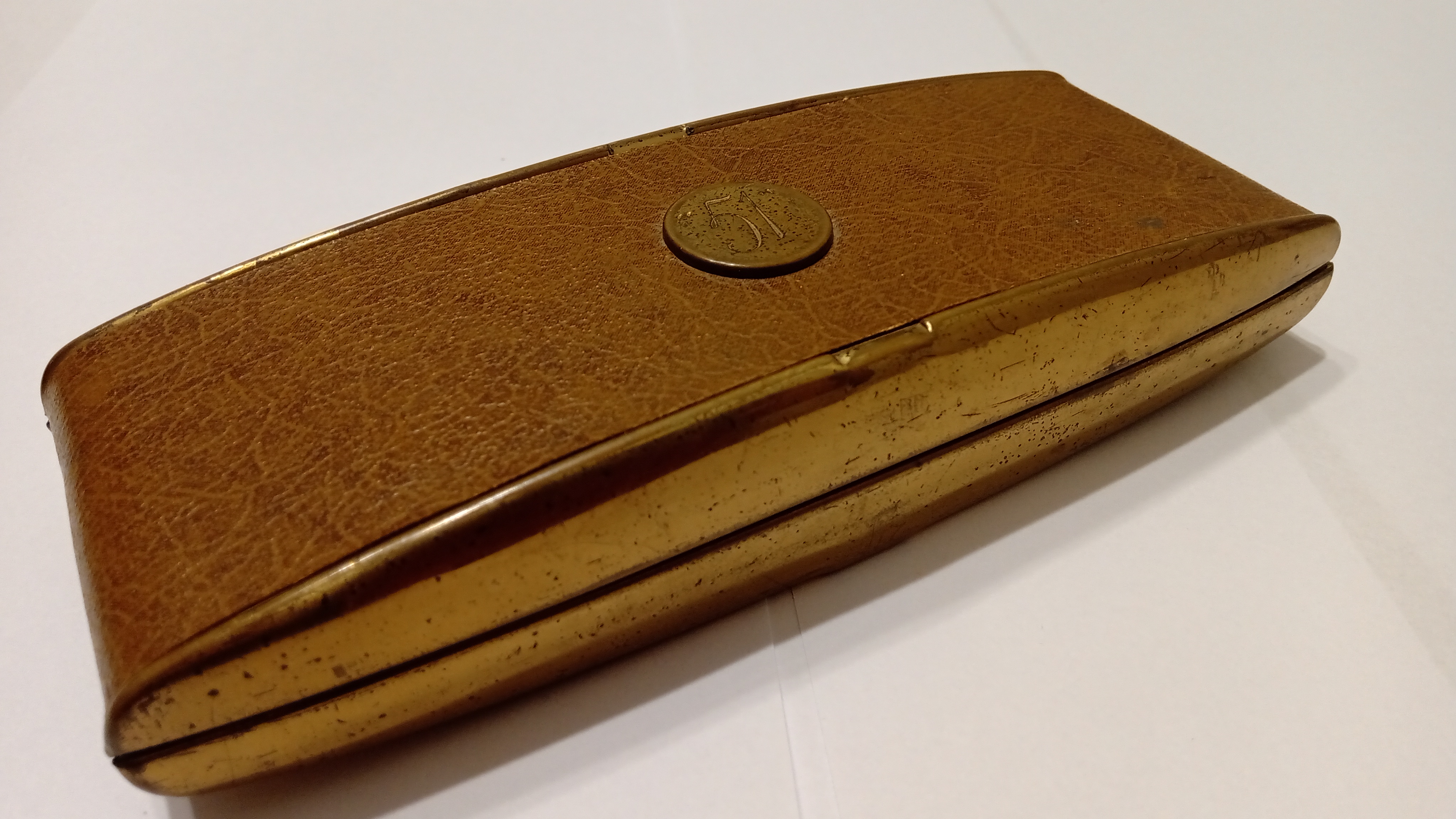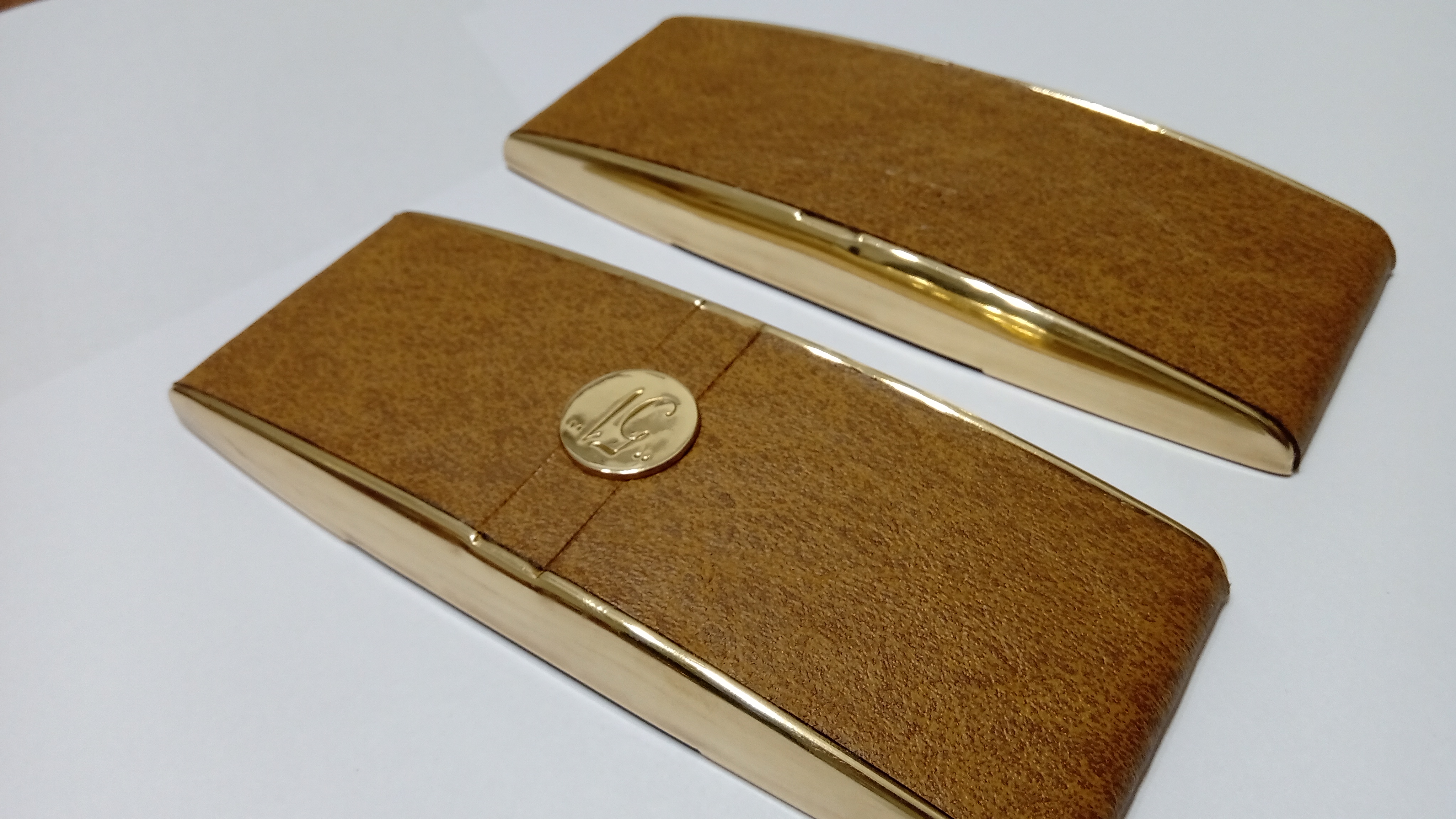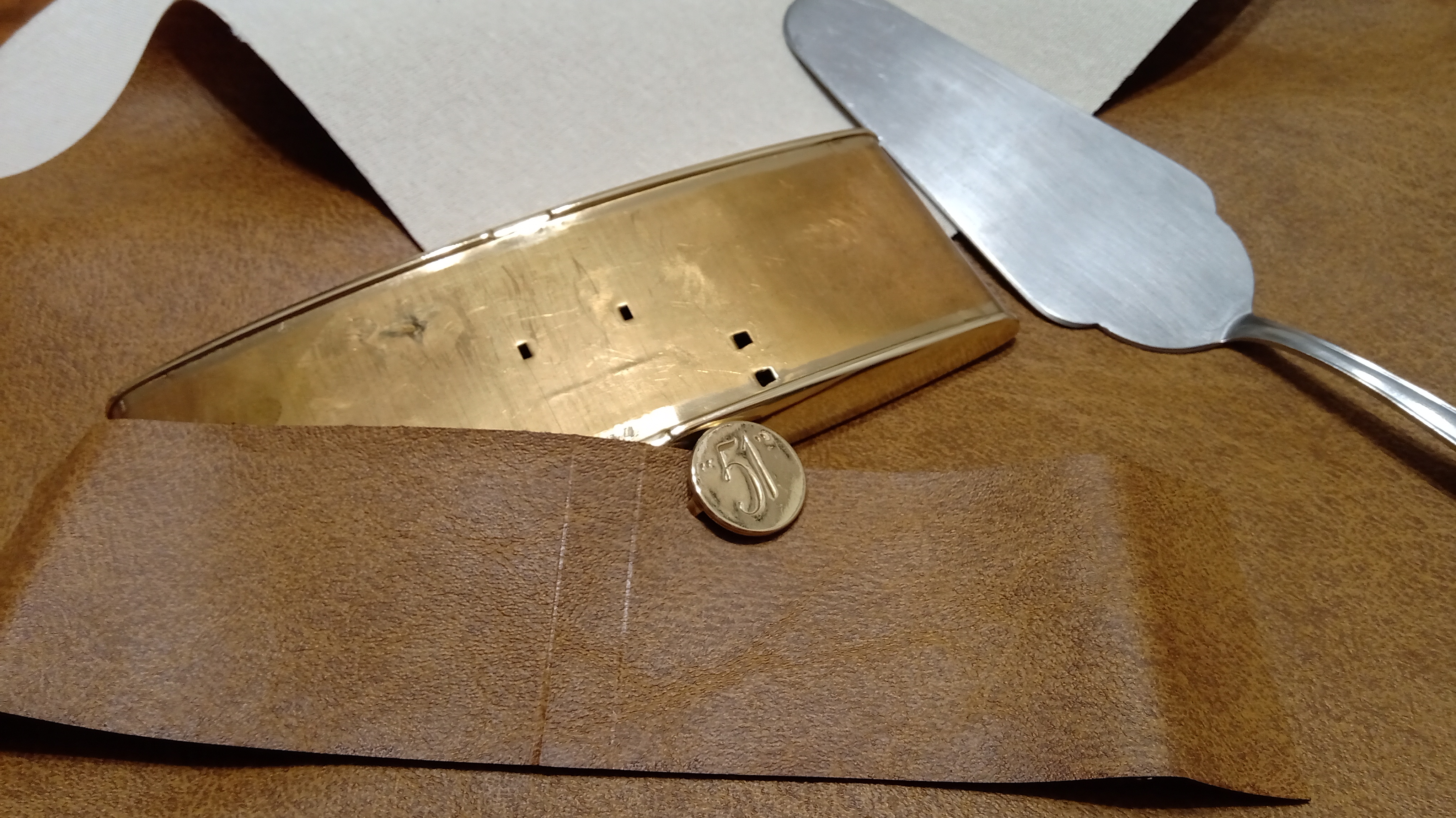 Per rivestire il coperchio e la base della scatola in ottone è stata scelta una similpelle sintetica di buona qualità, che dopo essere stata tagliata ordinatamente alle dimensioni originali, nel caso del coperchio, le due linee sotto le insegne sono state incise con una spatola calda,