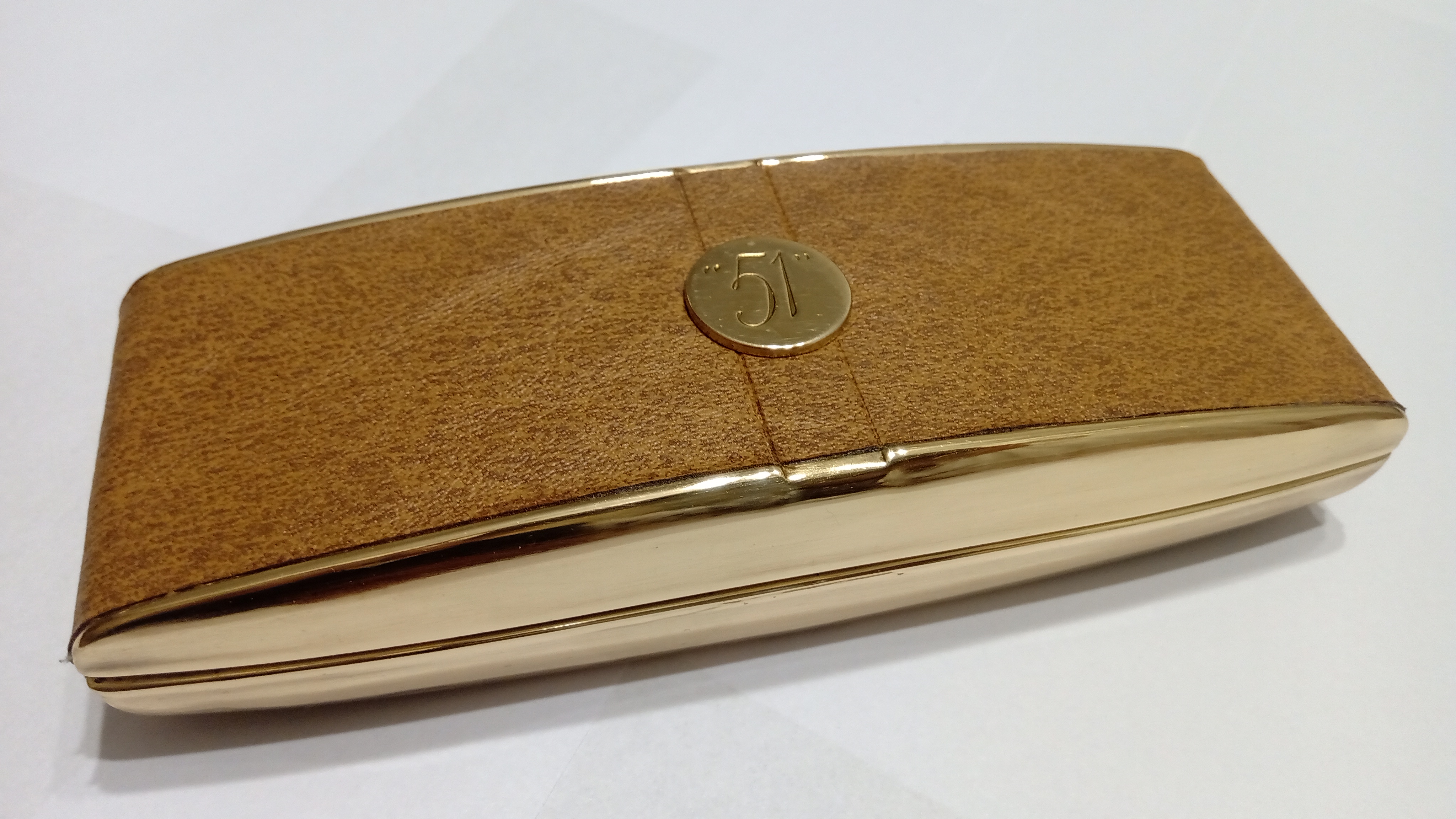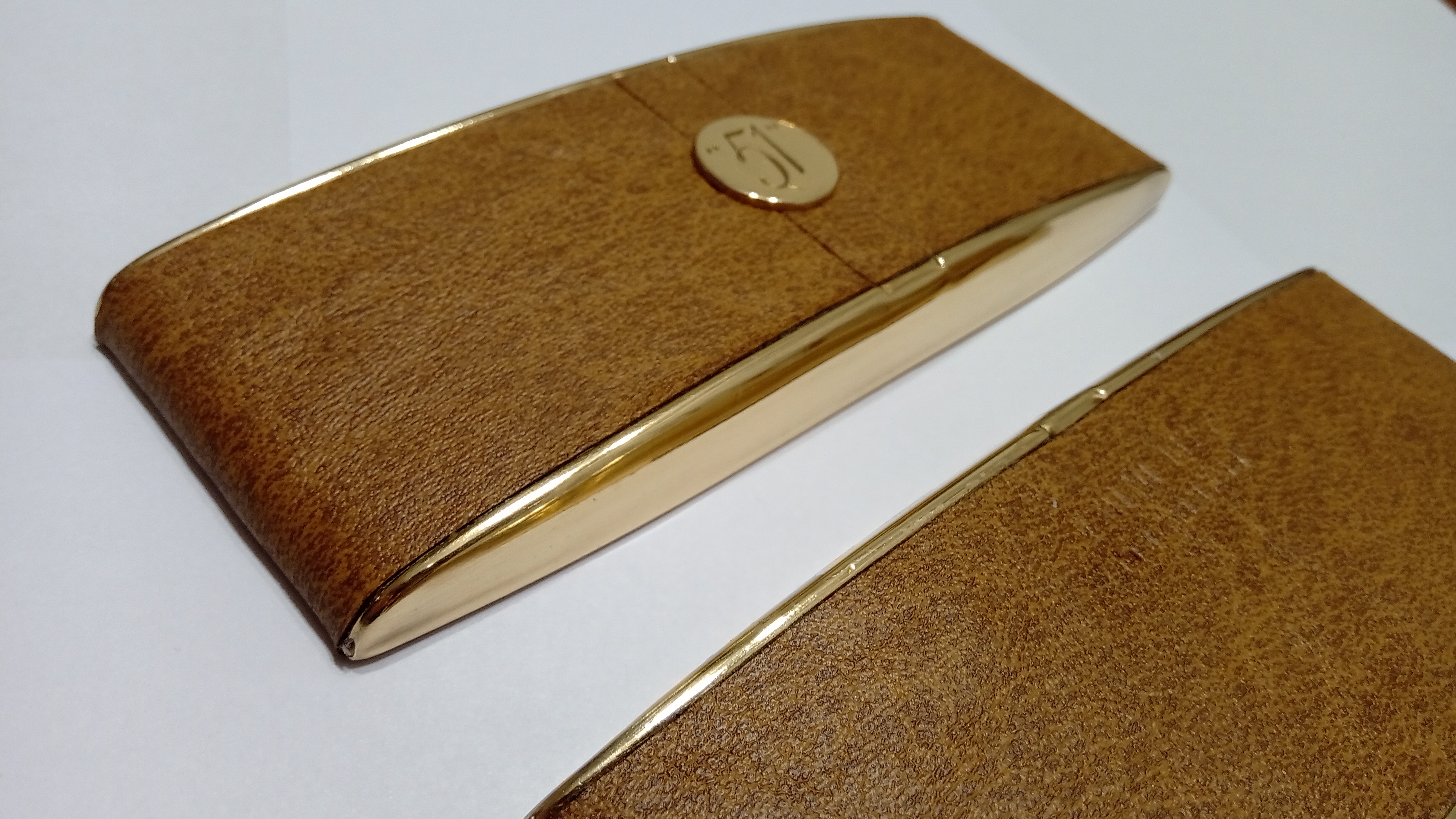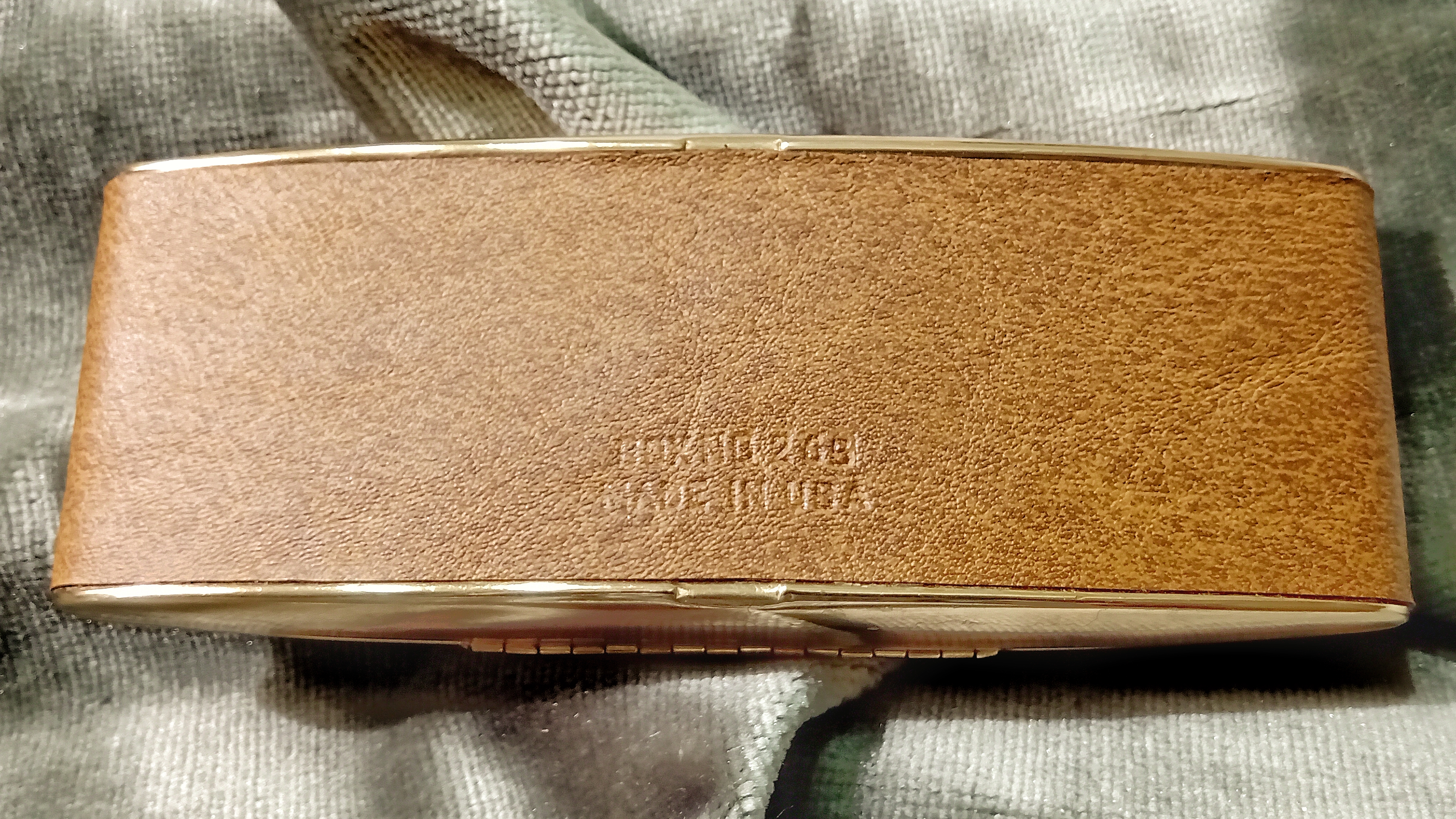 Per rivestire il coperchio e la base della scatola in ottone è stata scelta una similpelle sintetica di buona qualità, che dopo essere stata tagliata ordinatamente alle dimensioni originali, nel caso del coperchio, le due linee sotto le insegne sono state incise con una spatola calda,