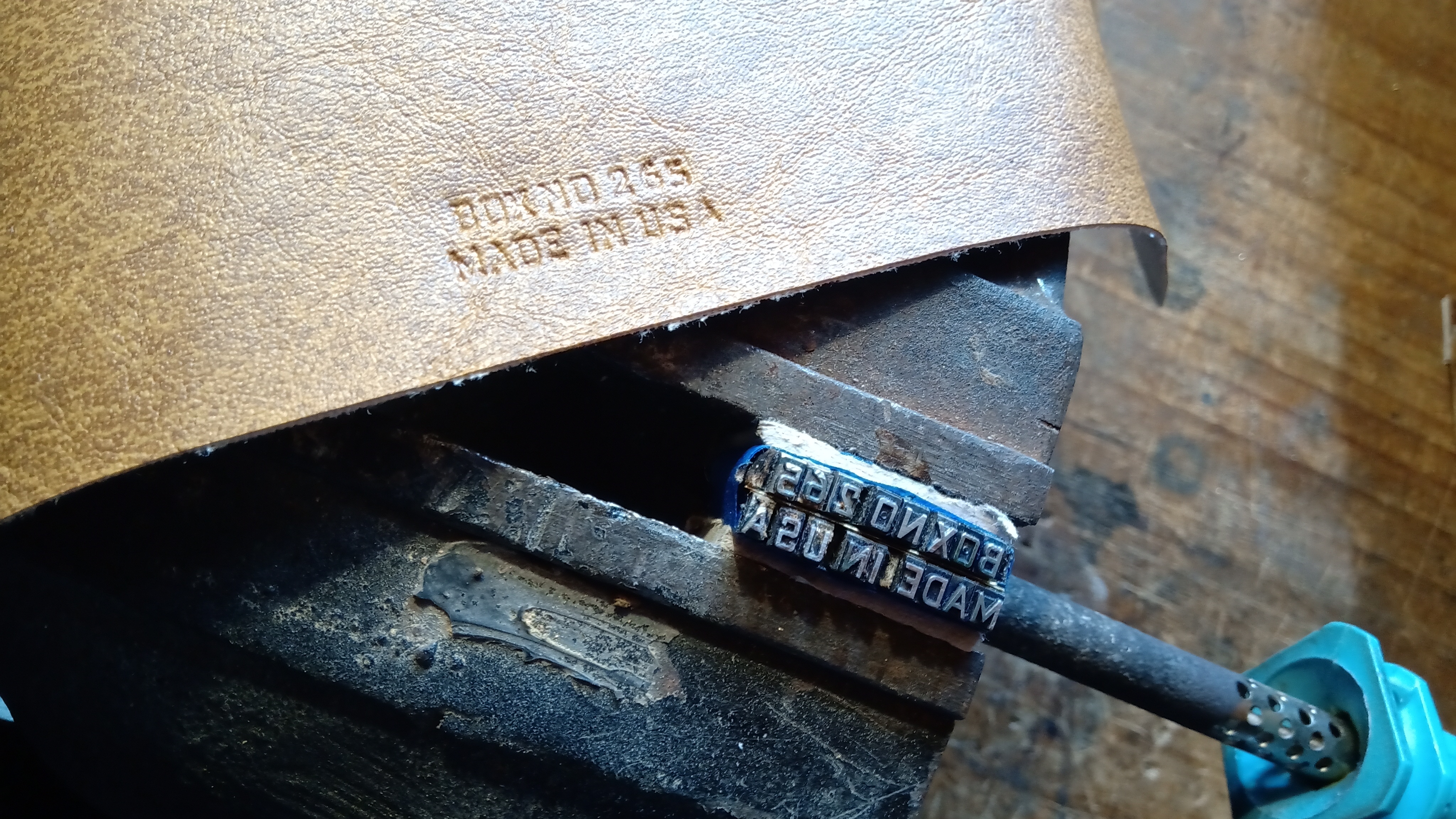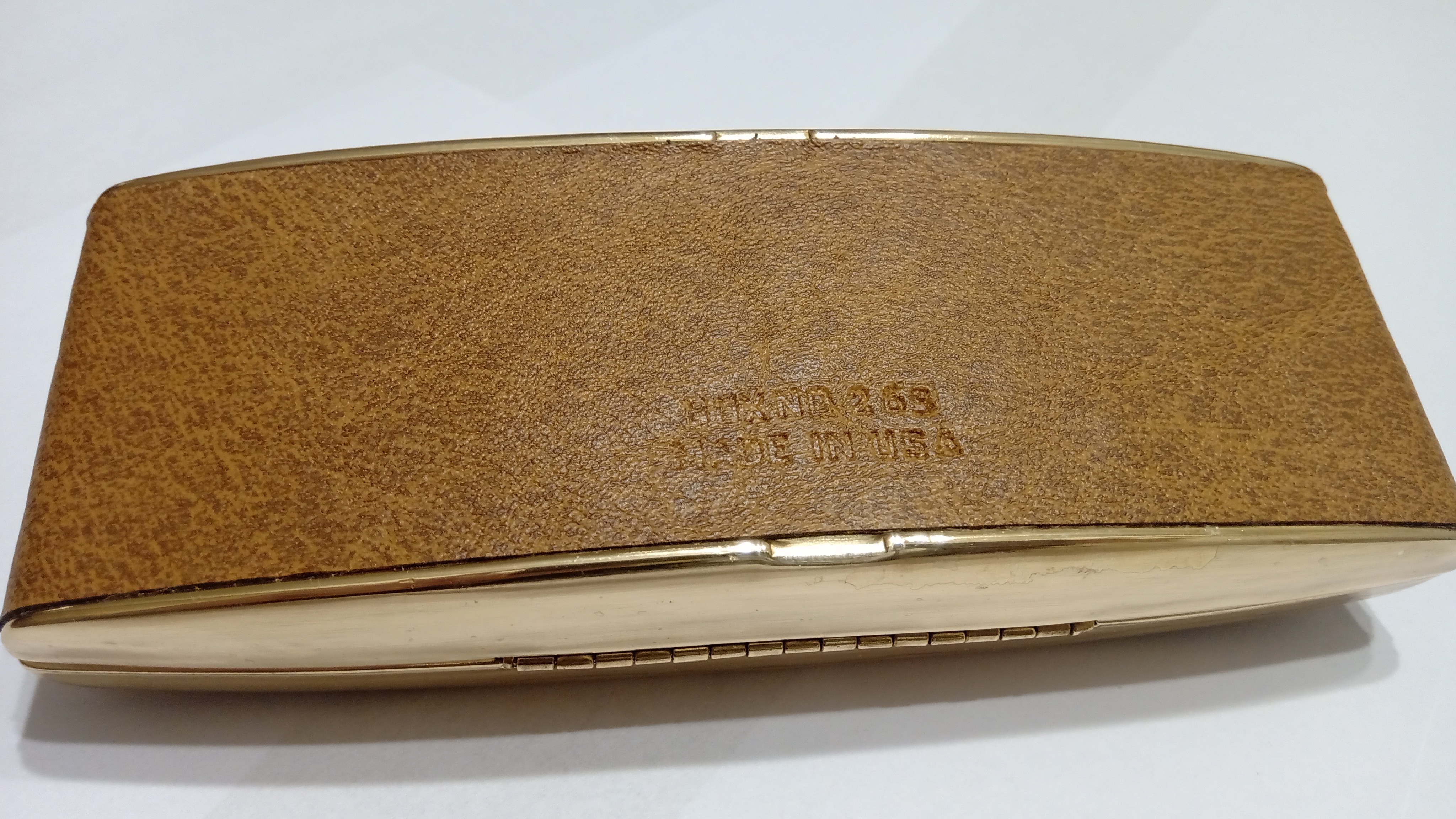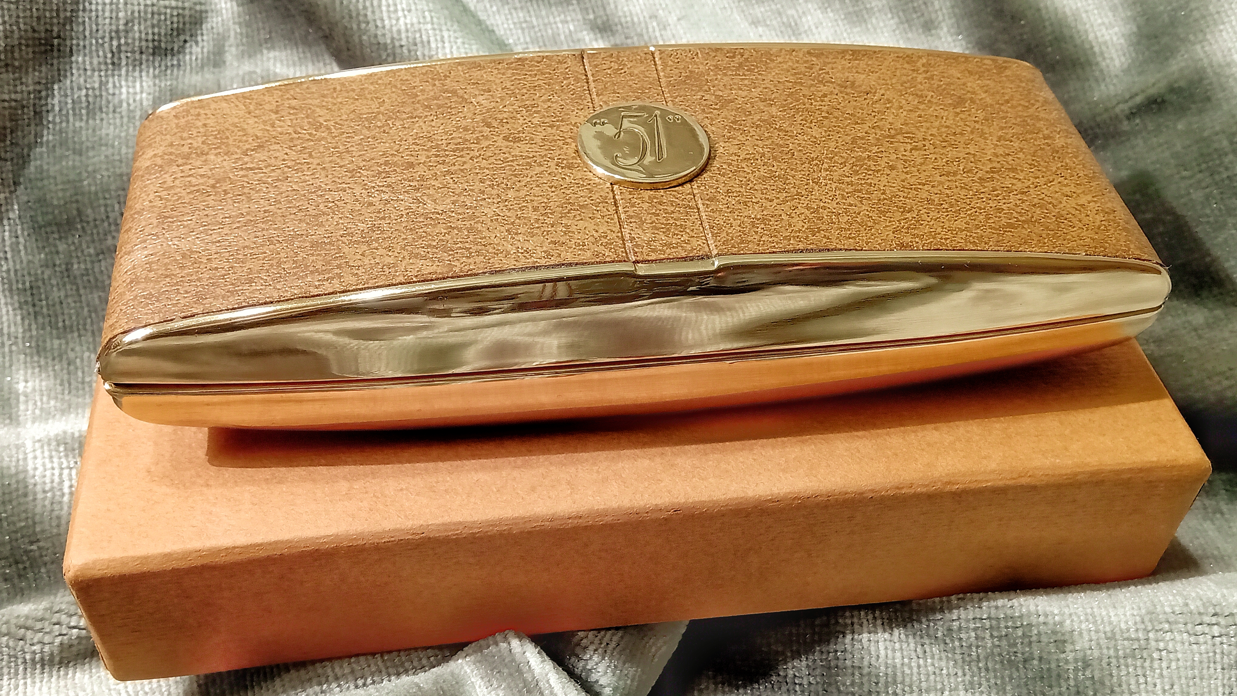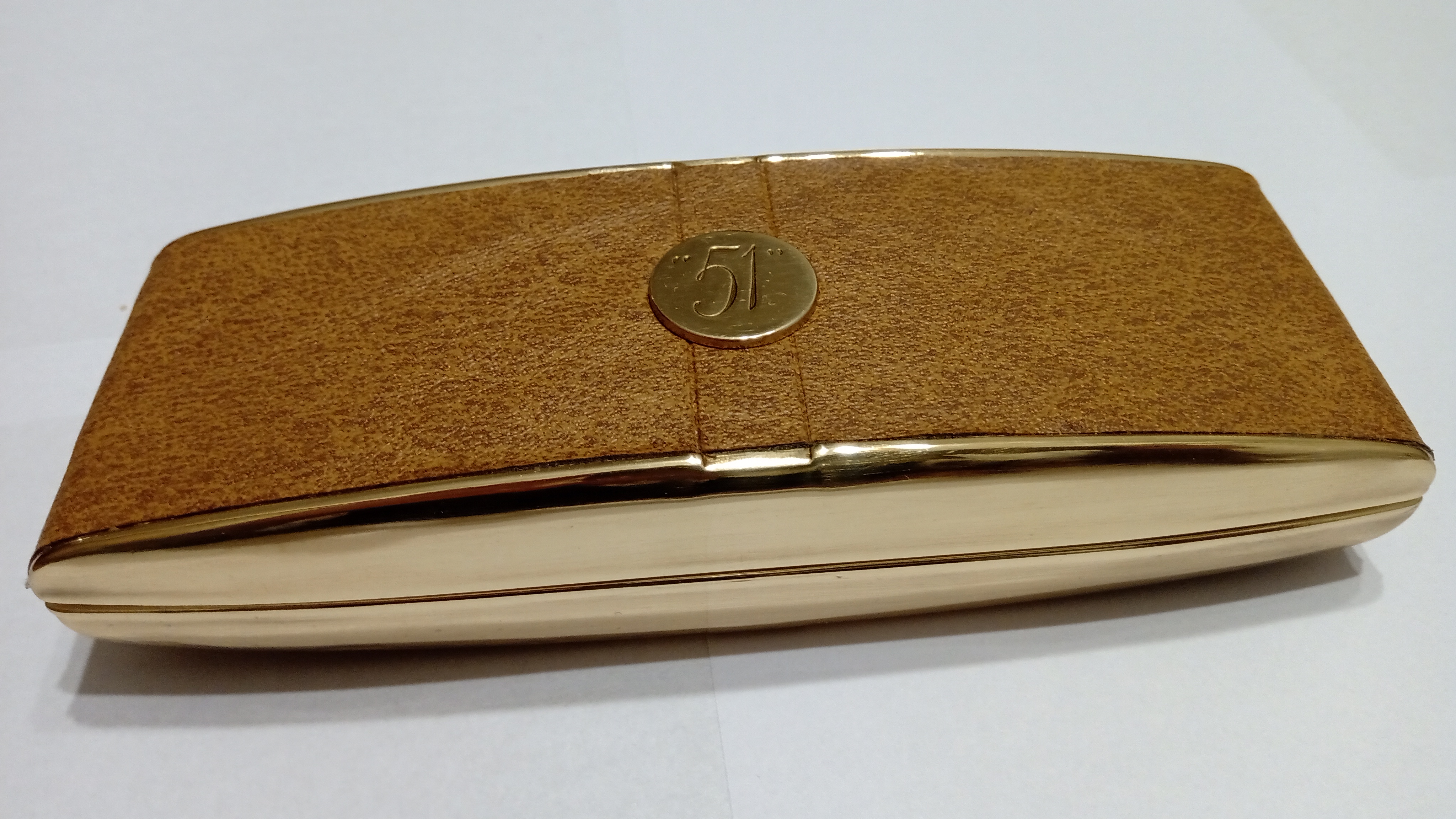 Per rivestire il coperchio e la base della scatola in ottone è stata scelta una similpelle sintetica di buona qualità, che dopo essere stata tagliata ordinatamente alle dimensioni originali, nel caso del coperchio, le due linee sotto le insegne sono state incise con una spatola calda,