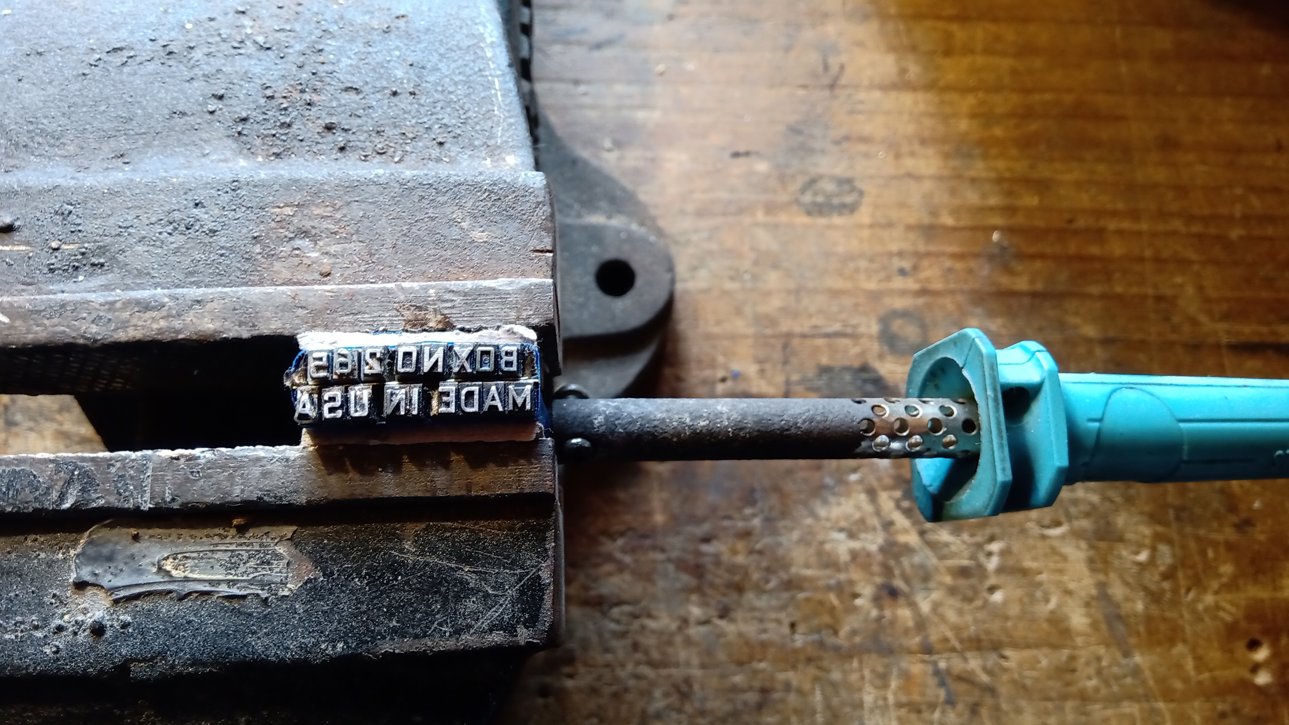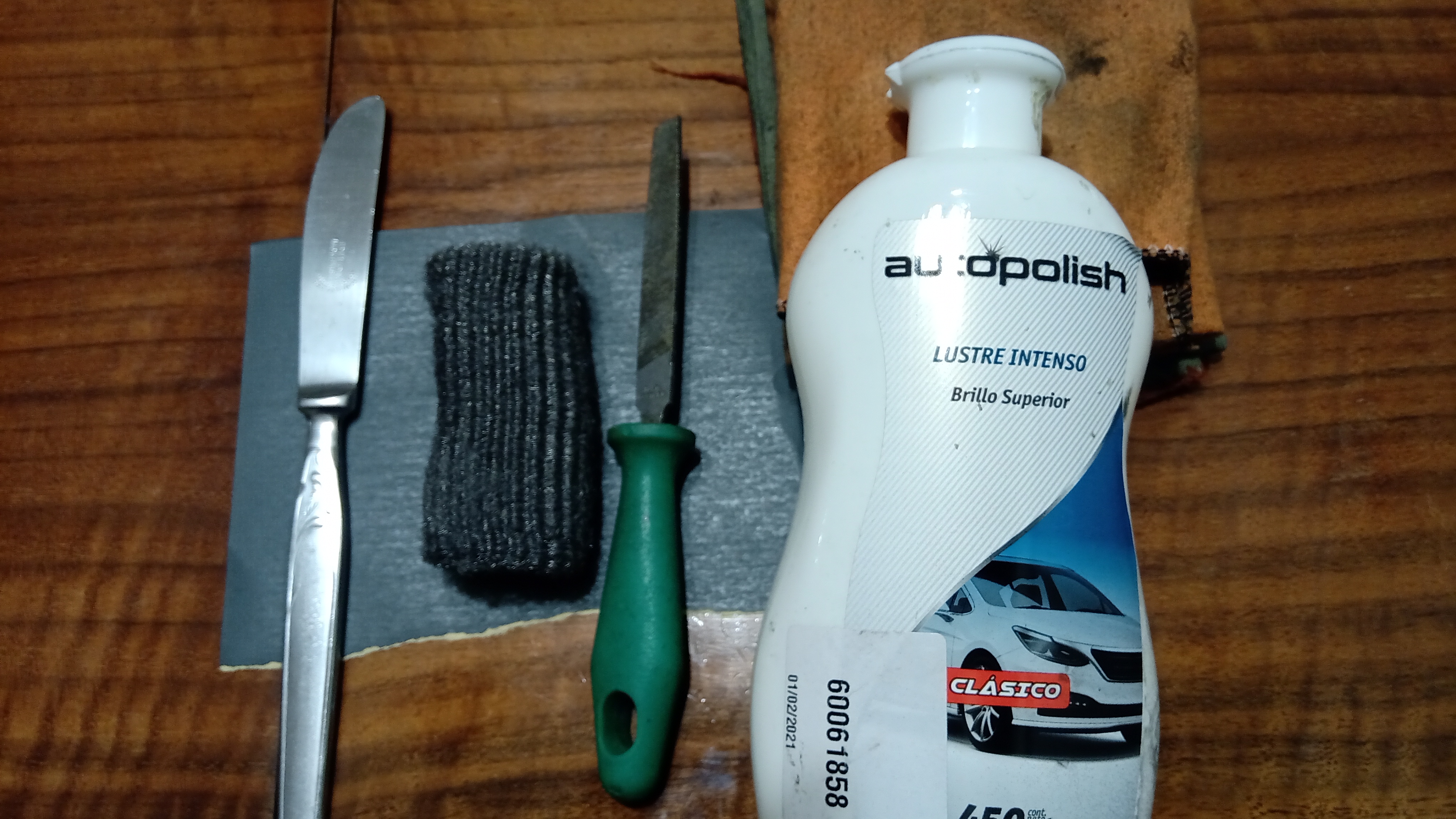 utilizzando strumenti domestici (coltello, lima fine, lana d'acciaio, carta vetrata grana 2000 e pasta per lucidare) per rimuovere le ammaccature e dare una finitura finale a specchio,