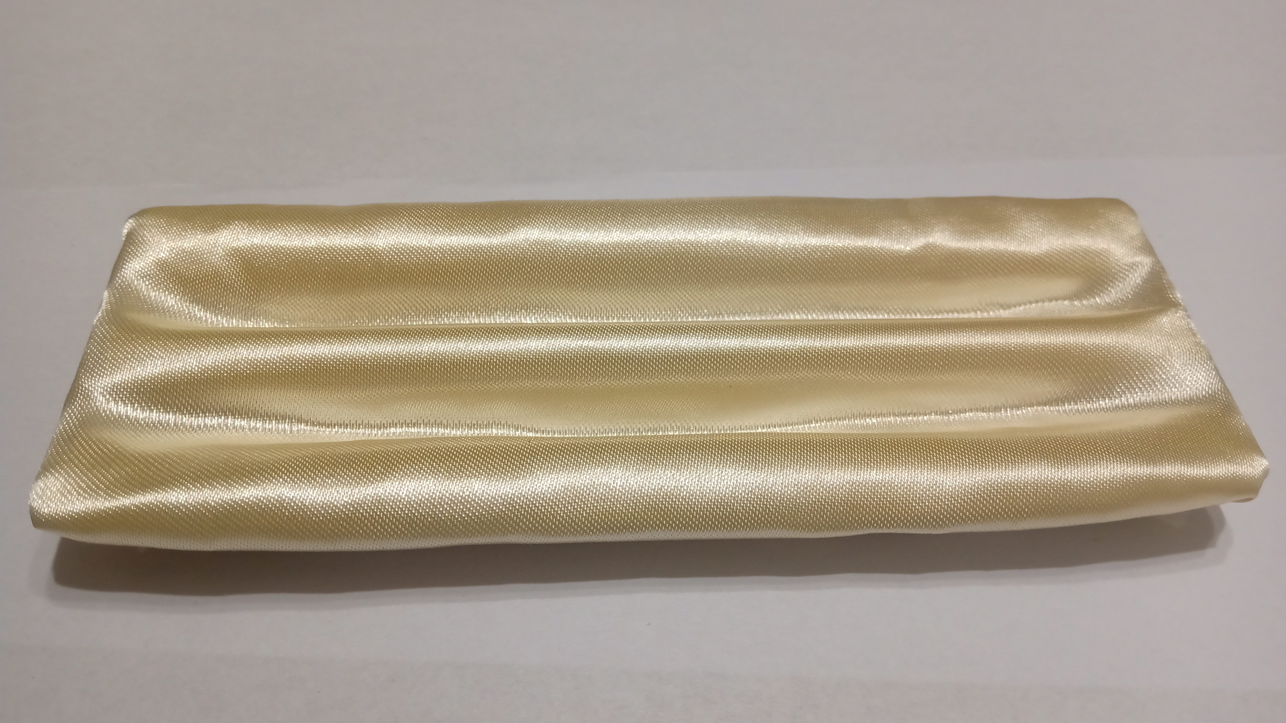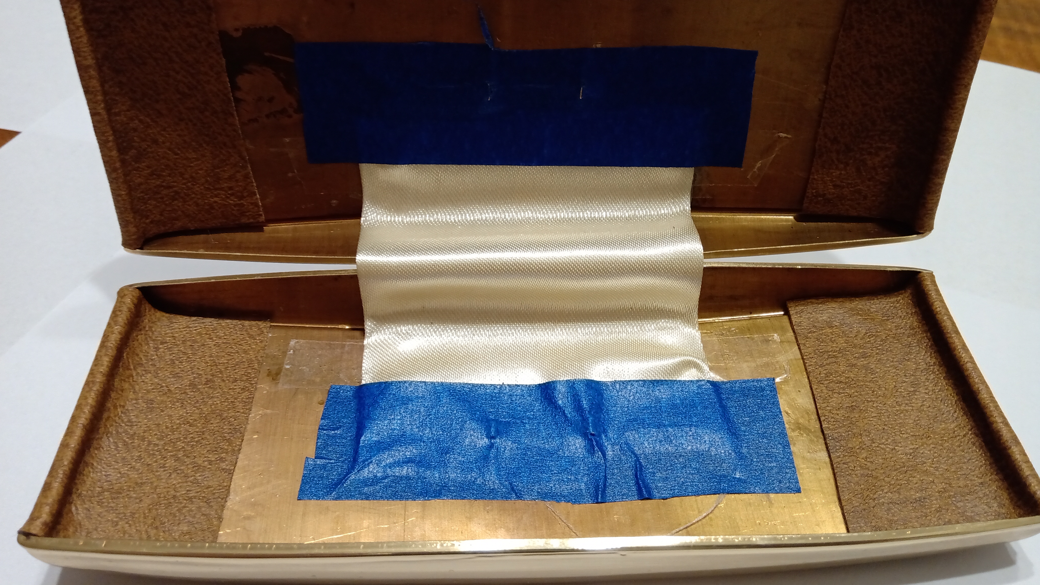 Dovremo rivestire il meccanismo della cerniera, con il raso o taffetà che scegliamo (leggermente dorato) per la parte interna, e che fisseremo con nastro biadesivo e nastro di carta...