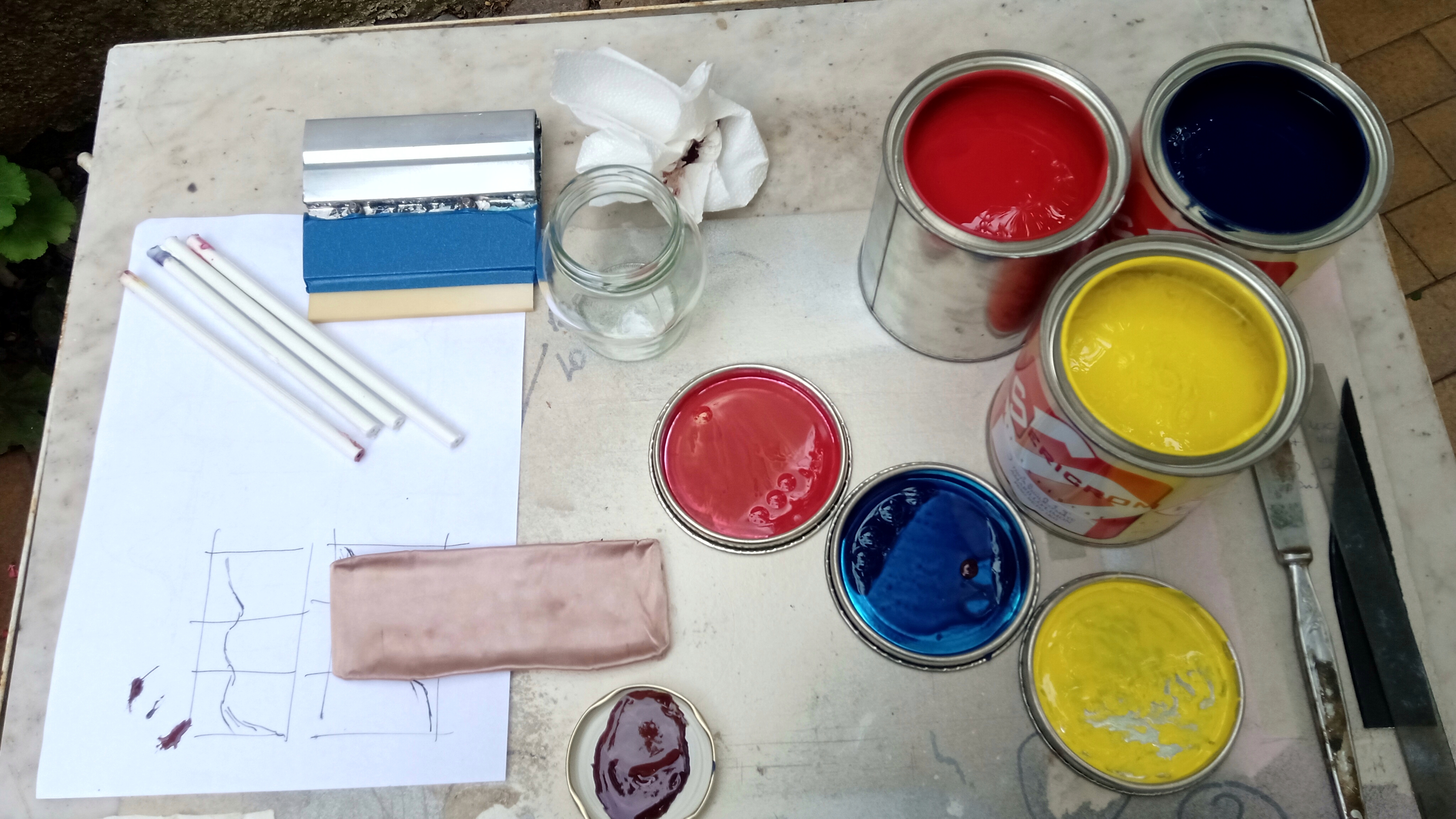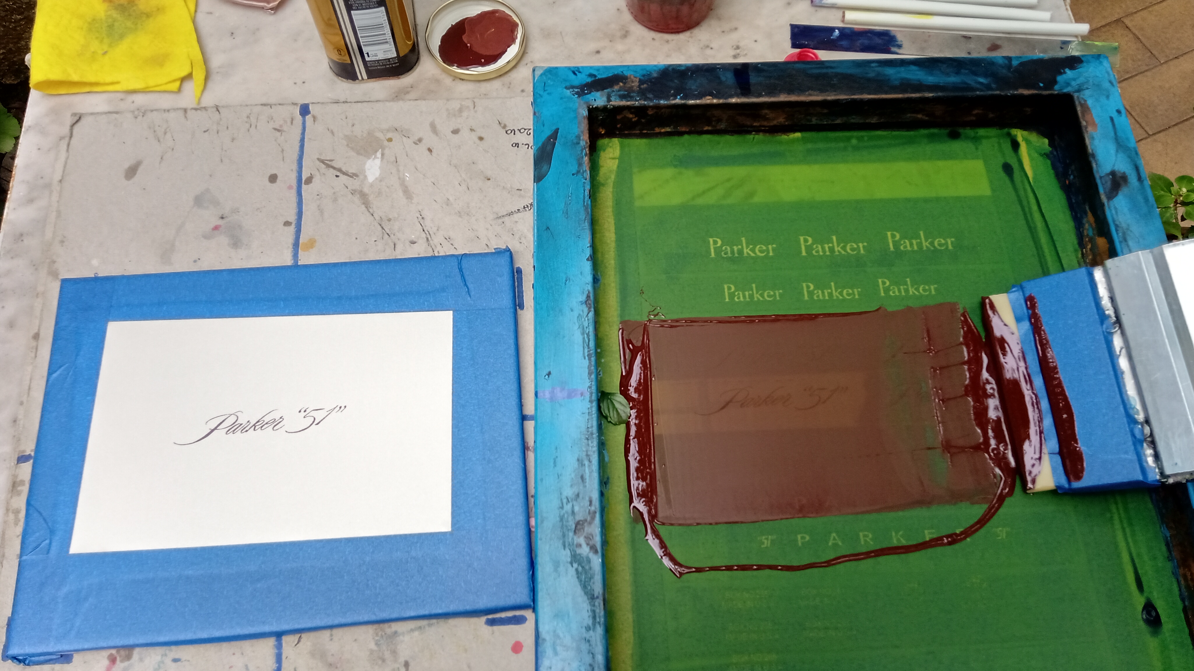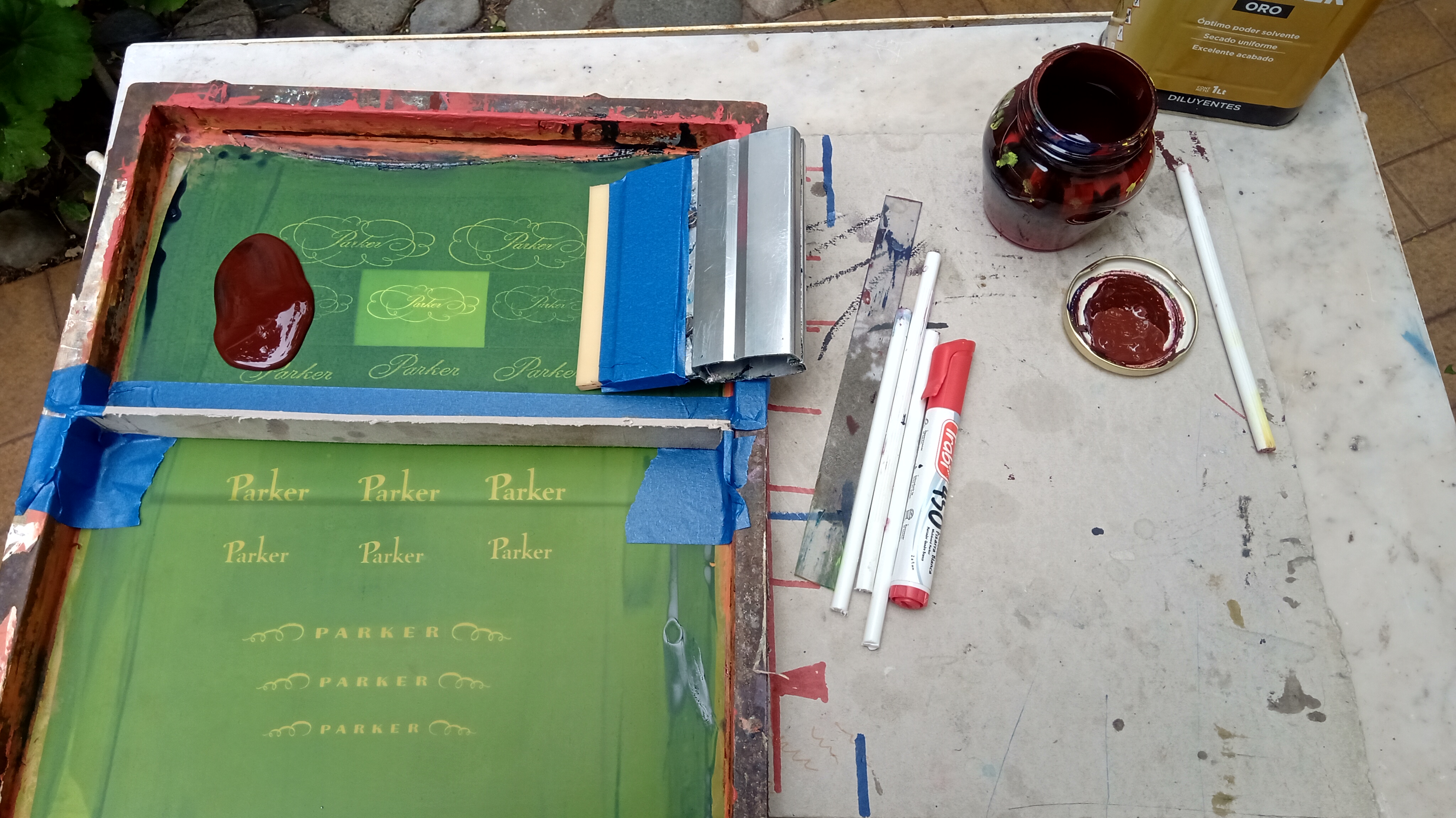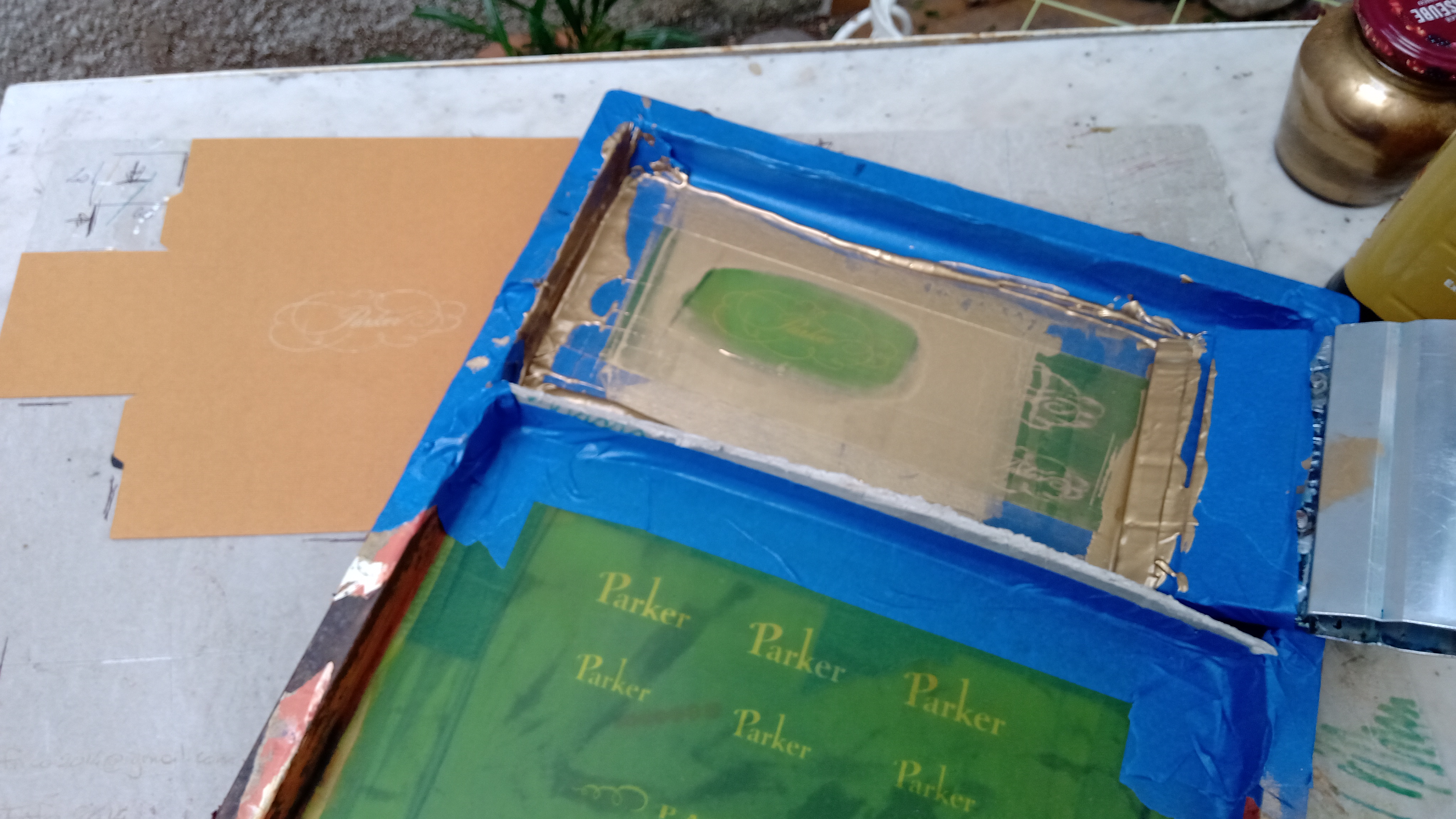 Una volta che l'emulsione si sarà asciugata, copieremo il logo sullo shablon posizionando la stampa su carta da lucido sul telaio, ed esponendo il tutto ai raggi UV (è possibile utilizzare qualsiasi riflettore alogeno) per 30 minuti. Toglieremo la carta vegetale, laveremo lo shablon con acqua e lo asciugheremo ottenendo la matrice per stampare il tessuto interno del coperchio...