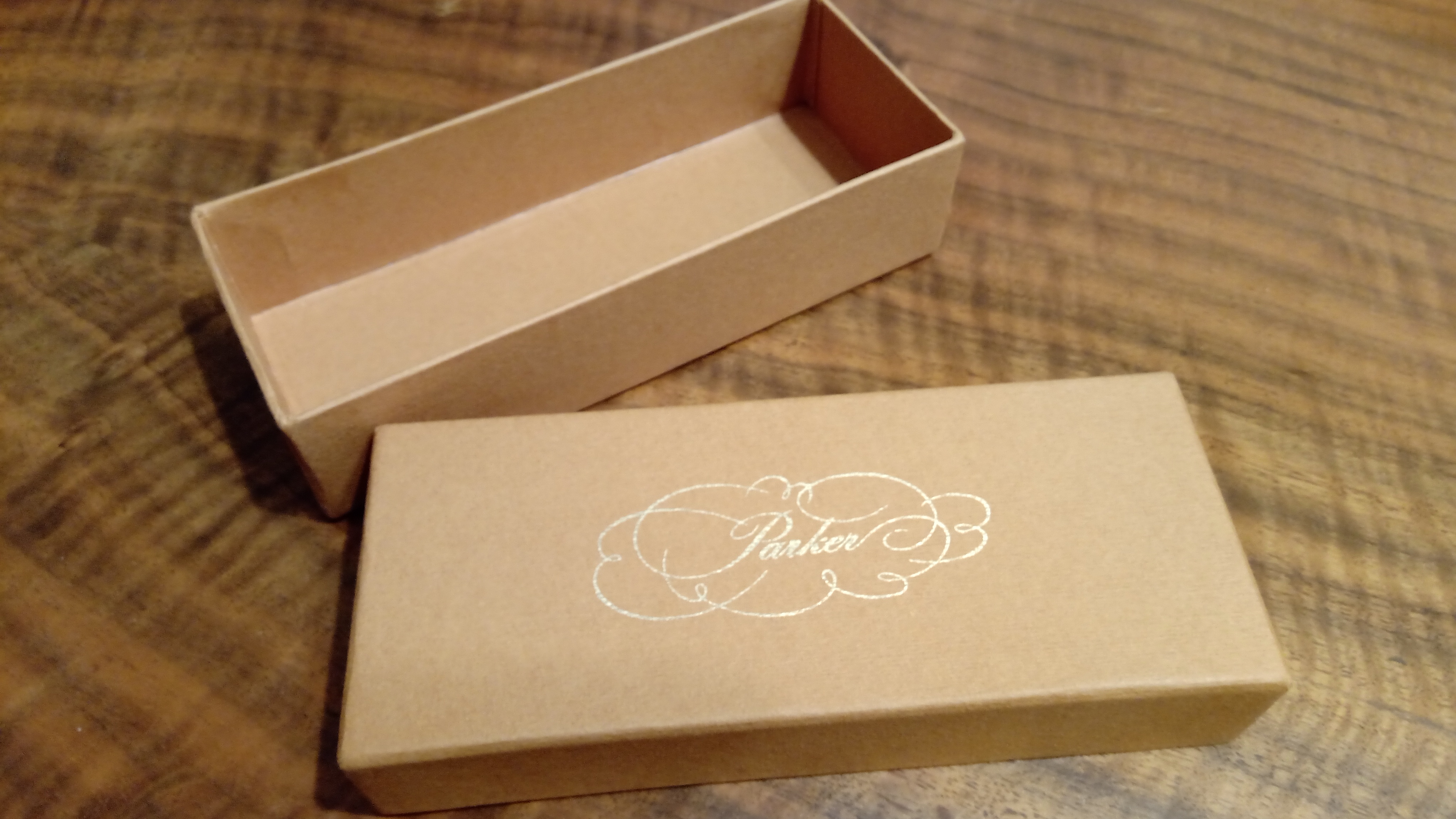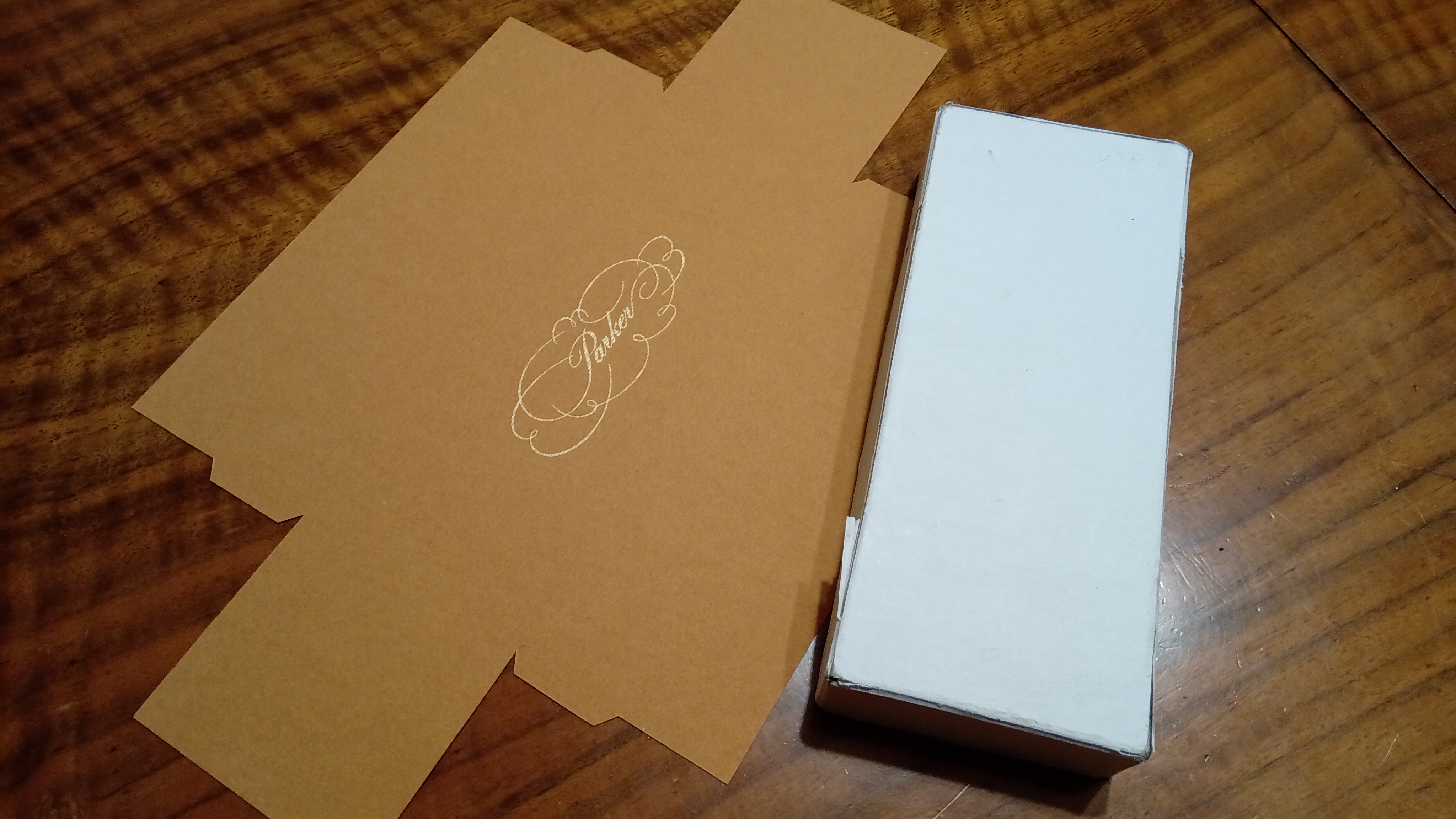 È allora che abbiamo deciso di realizzare una piccola scatola di cartone a righe, per preservare la scatola di ottone con il suo set di penne stilografiche e portamine. Per prima cosa montiamo la base della scatola con cartone rivestito,