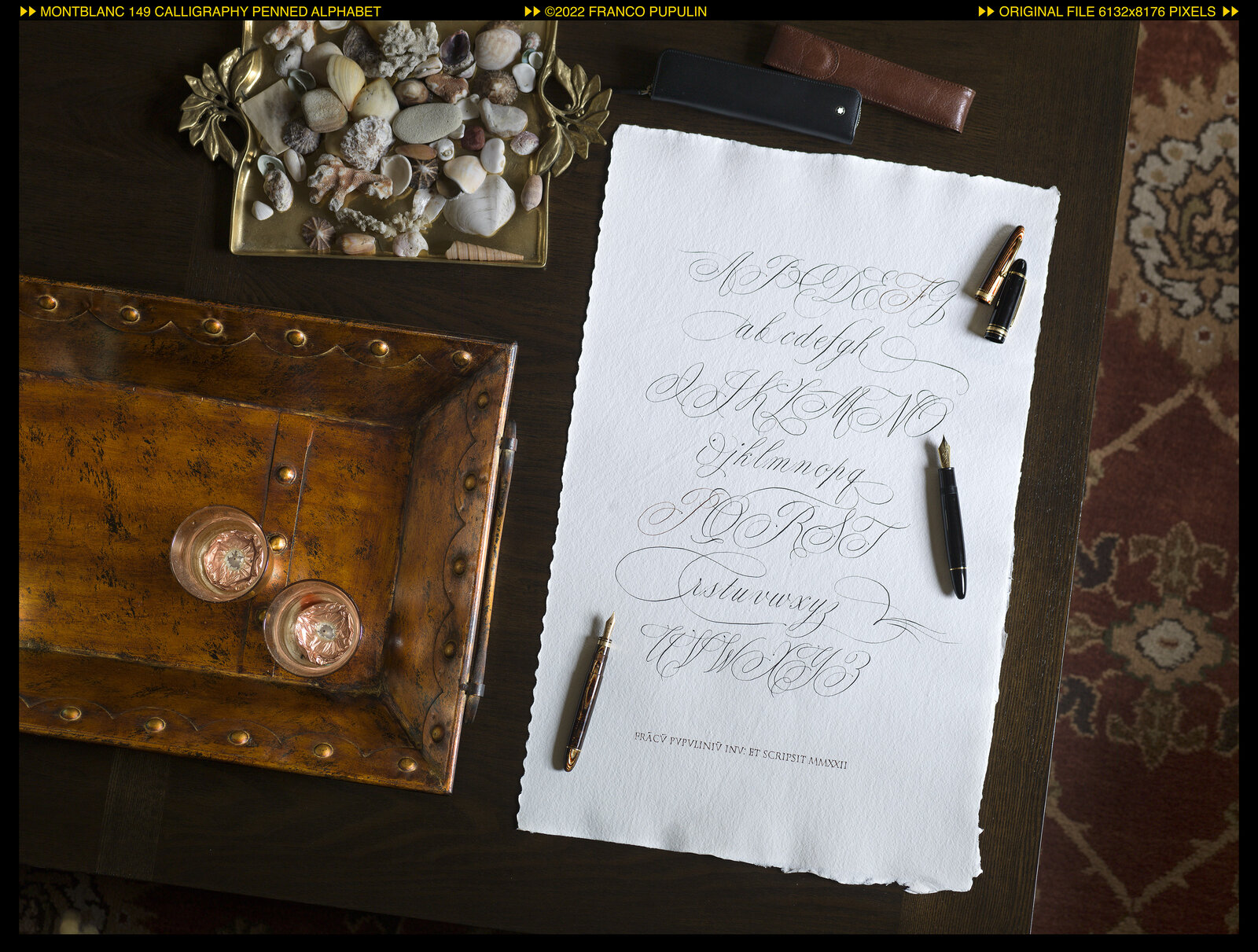 Qui l'ho usato per scrivere un alfabeto completo di lettere maiuscole e minuscole, scritto con la mia 149 Calligraphy e l'inchiostro Black Permanent di Montblanc, fatta eccezione per le lettere maiuscole F e P e la firma, che sono state realizzate con il pennino OMAS EXTRA della mia Ogiva Arco riempita con inchiostro Pelikan Brilliant Brown.