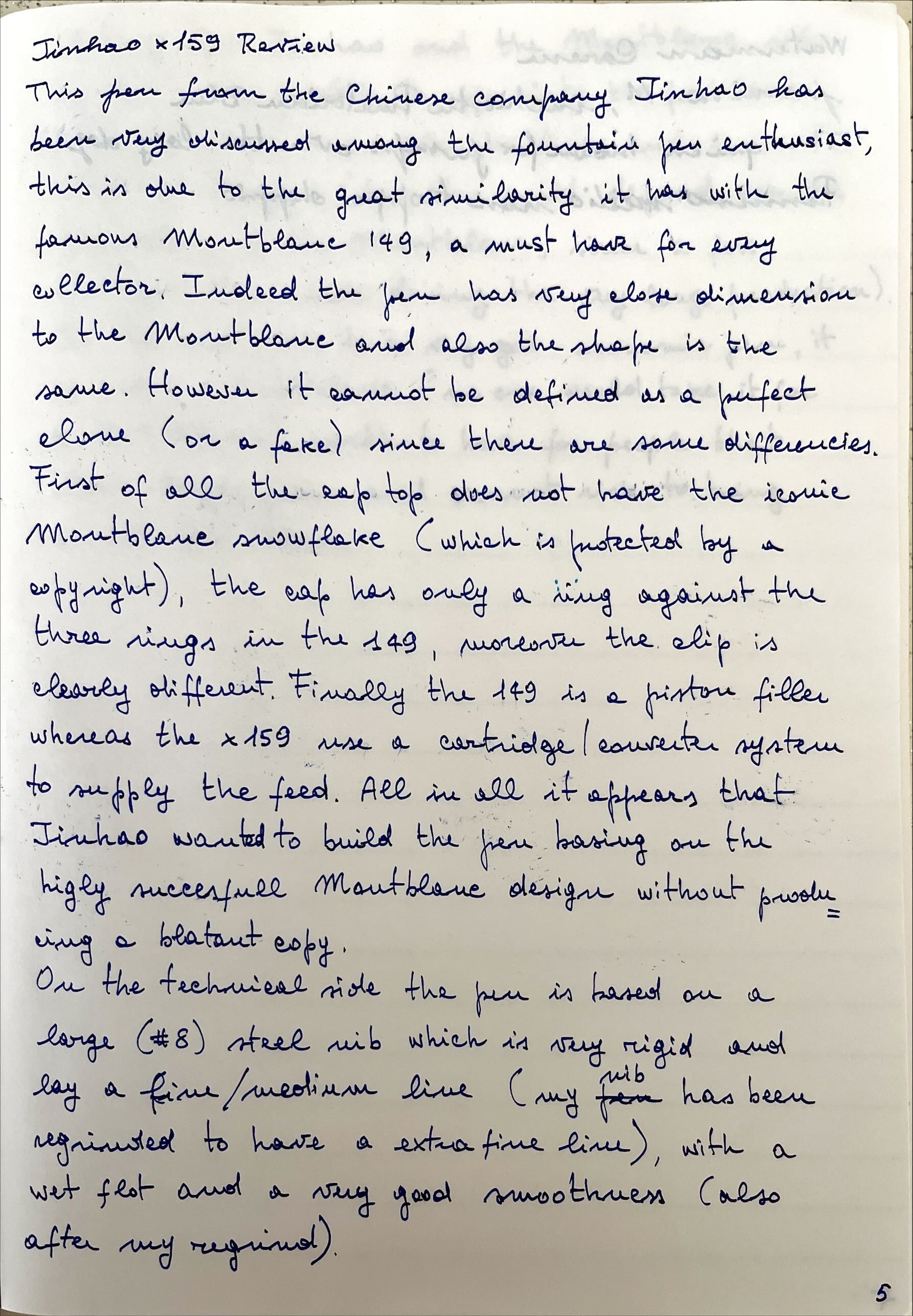 Oggi dopo pranzo mi sono deciso a scrivere una recensione a mano della Jinhao x159, purtroppo solo a metà della prima pagina mi sono reso conto che la stavo scrivendo in inglese ed a quel punto ho deciso di continuare in tale lingua (capita quando si scrive in inglese il 98% della propria produzione), mi scuso anche con i puristi dell'inglese se c'è qualche ovvio errore.