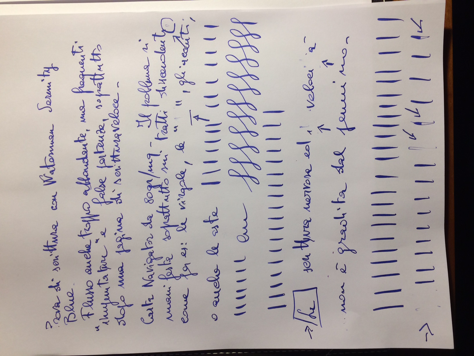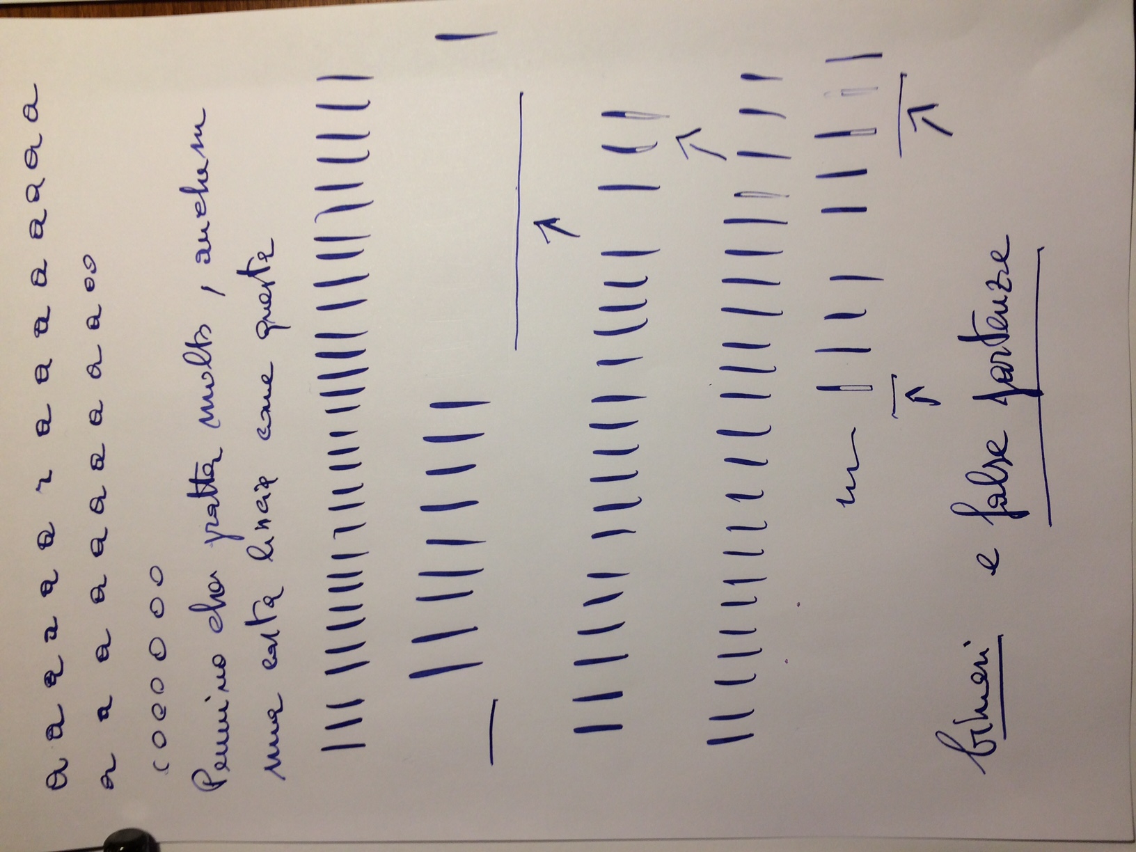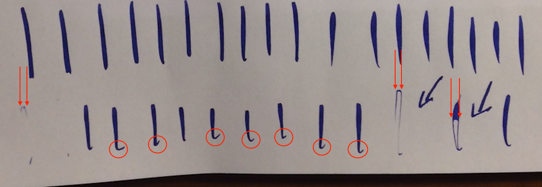 Oltre ad una pressione forse troppo esercitata sul pennino, ho il problema della velocità di scrittura elevata, che accentua il problema dei binari . Lo noto dal fatto che sulla prima riga (l' immagine seguente) non ho di questi problemi , mentre sulla seconda riga , verso la fine, cominciano a comparire proprio i binari e noto che compaiono perché ho aumentato la velocità di esecuzione del tratto (da cosa lo noto ? Dal fatto che la parte terminale del tratto presenta una specie di ricciolo all'insù , circolato in rosso, che viene mi viene fuori solo quando scrivo velocemente, e nella prima riga non ci sono questi riccioli e neanche i binari)