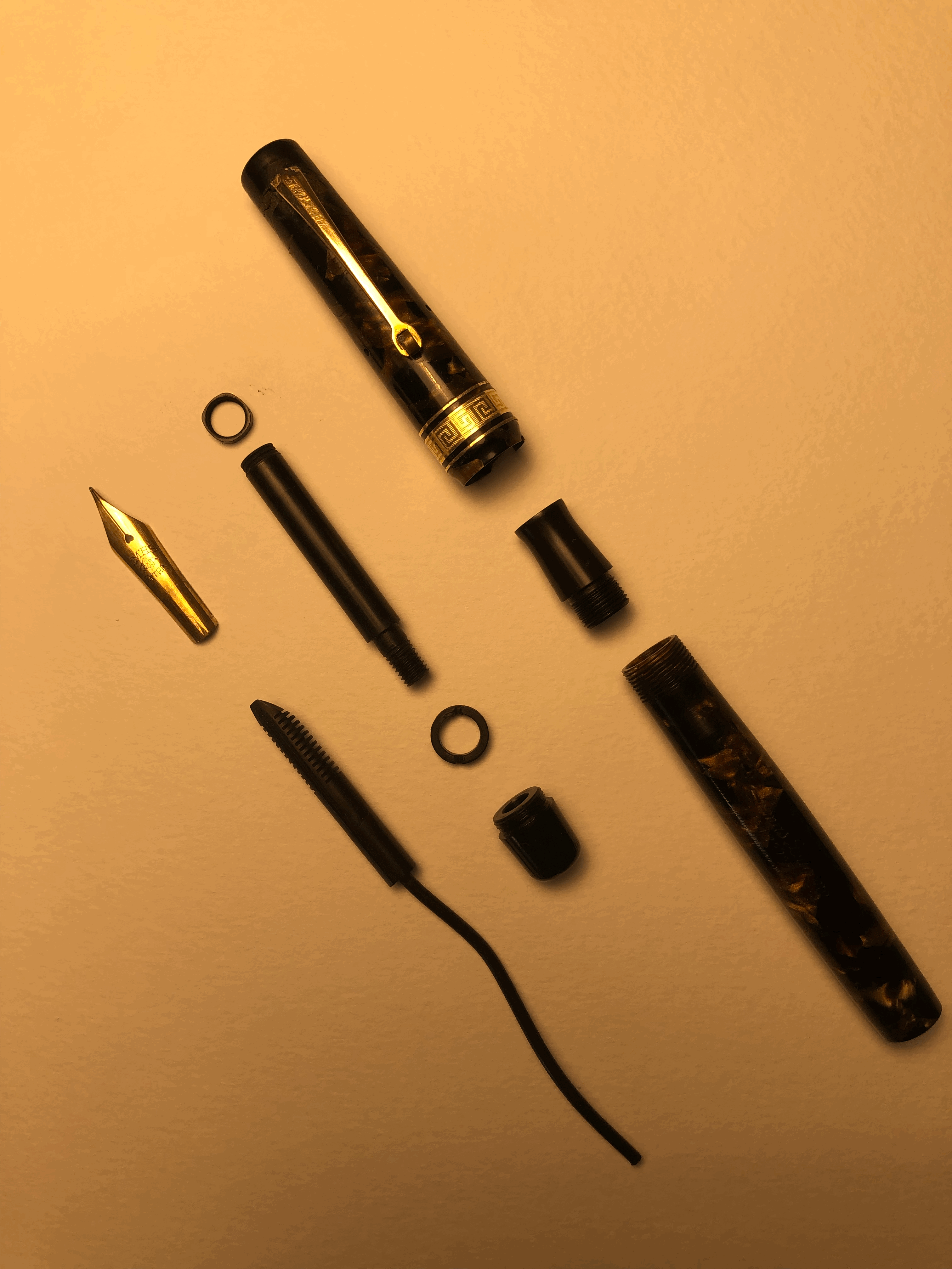 Io ne ho un paio, entrambe restaurate. Lo smontaggio non è dei più semplici, si svita la sezione, il pennino è incastrato a frizione nella sezione assieme all'alimentatore dal quale parte il tubicino di sfiato. la parte del fondello a me ha dato qualche difficoltà e in effetti non riuscendo a svitarlo la ho data a uno che ripara. Lascio una foto della mia smontata (quella marrone prima serie), che ovviamente ho smontato solo perché mi è, fortunatamente, riuscito facile, si è svitato tutto in un attimo, e le ho cambiato il sughero.Pelikan57 ha scritto: ↑domenica 6 novembre 2022, 18:35 Buongiorno,