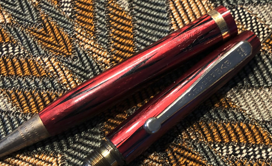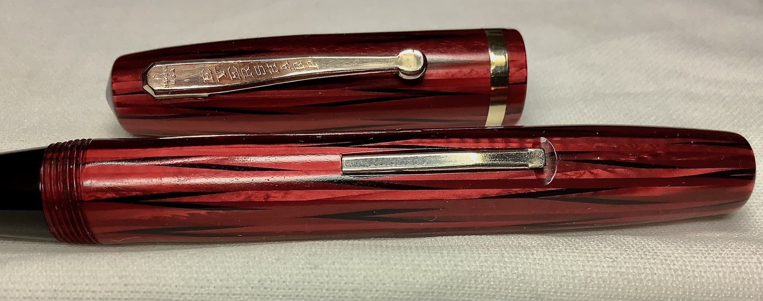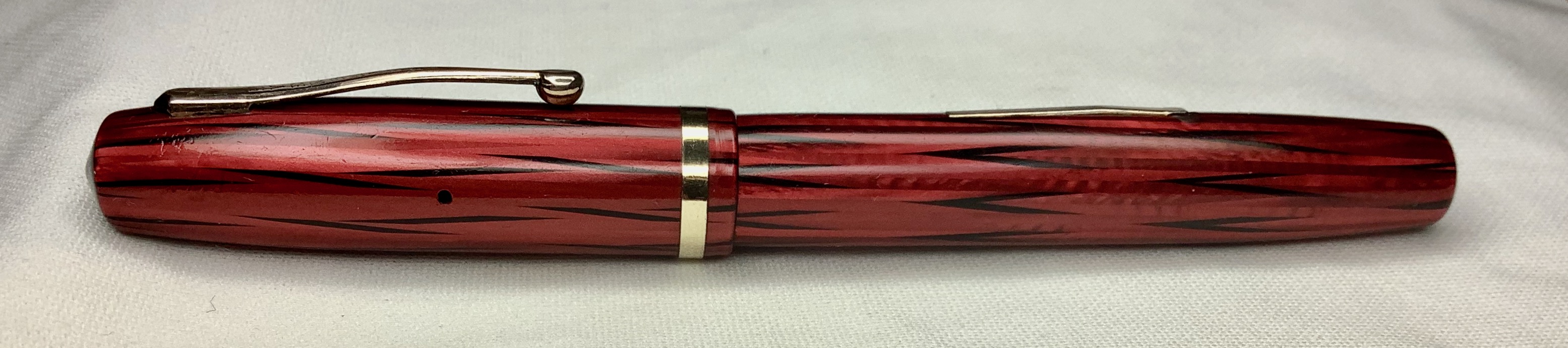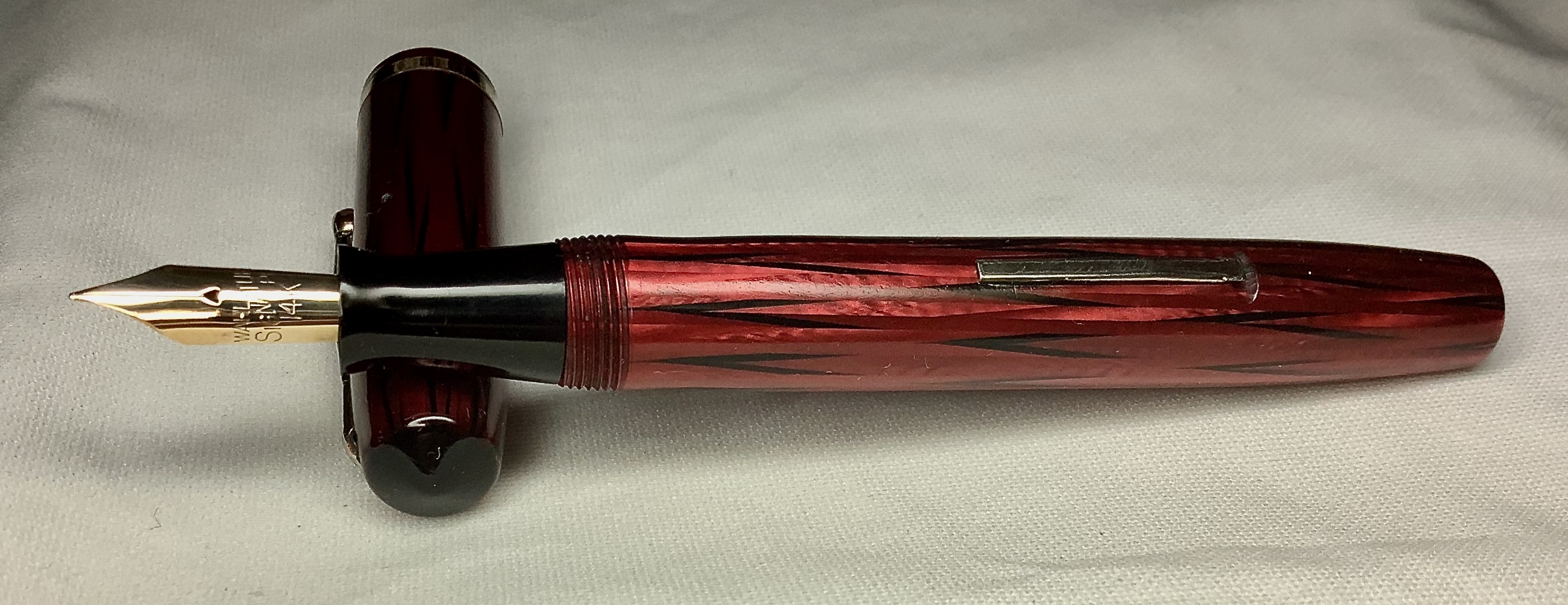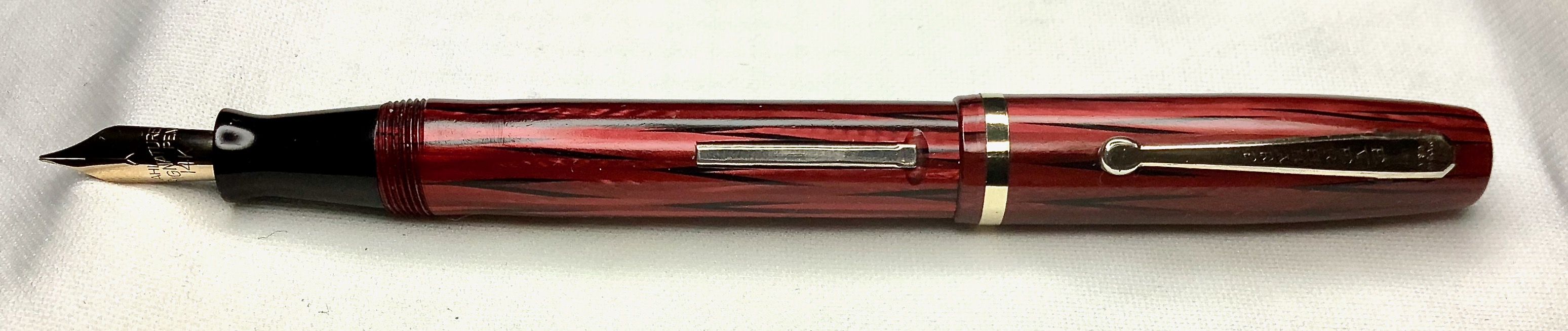 In rete ho trovato ben poco su questa specifica variante, qualcosa su FPN (c'è una foto con la colorazione verde-nera) https://www.fountainpennetwork.com/foru ... to-thread/ , qualcosa su un blog inerente anche ad un libro sulle penna Wahl Eversharp qui http://oldfountainpensjustforfun.blogsp ... sharp.html , ma invece qualcosa di interessante è saltato fuori dal sito di GoPens https://gopens.com/catalog-34-march-2005/ , sul catalogo nr. 34 di Marzo 2005. La stessa penna (la numero 180 nella lista del catalogo), nella stessa colorazione , la didascalia recita una "W.Eversharp lever filler , rosso con venature nere. Una penna piuttosto tardiva, con un colore bellissimo e raro! GFT. Pennino largo..." ecc... E' curioso il fatto che non sia stata indicata come Wahl Oxford ma come una Eversharp senza uno specifico modello.