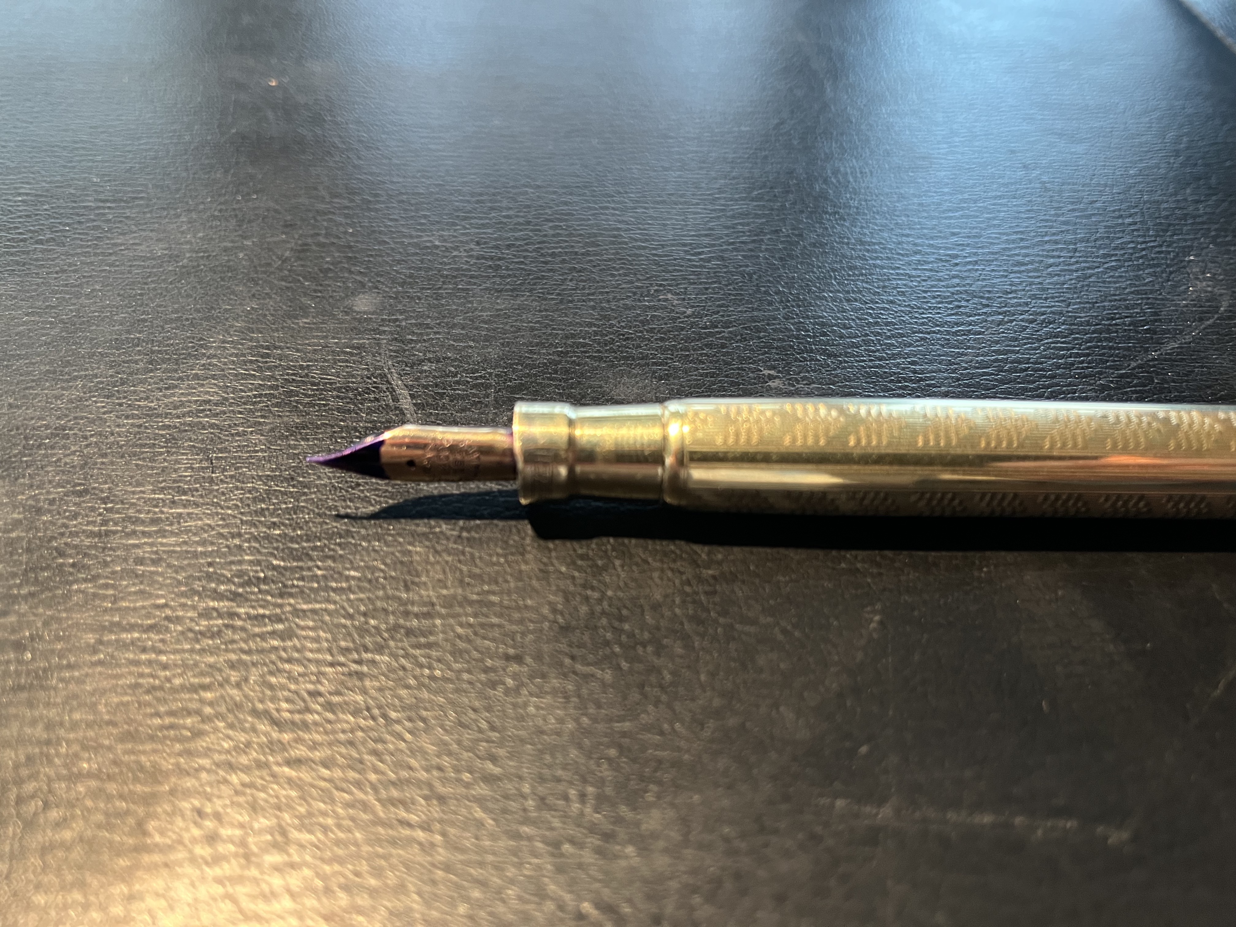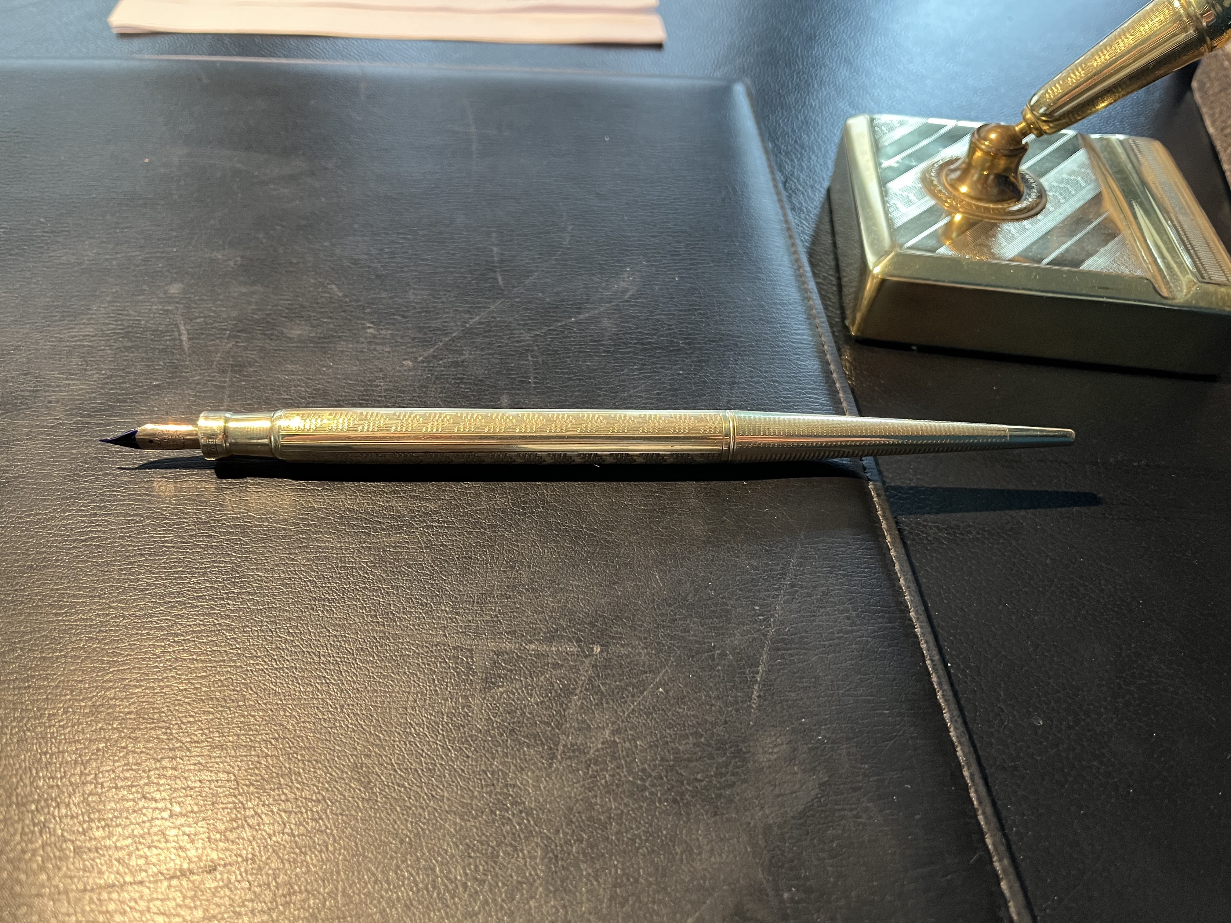 Non c'è un "in mezzo" fra pennini e calamaio e stilgrafiche, per decenni sono stati usati entrambi (le stilografiche erano costose, pochi potevano permettersele). La penna è uno stiloforo (o penna da scrivania) che all'epoca era in uso negli uffici, sicuramente di fascia alta visto che sembra completamente laminato. Nonostante si tratti di una marca minore è interessante, è praticamente impossibile dare una datazione esatta, ma si può indicare approssimativamente un periodo fra gli anni '30 ed i '40.