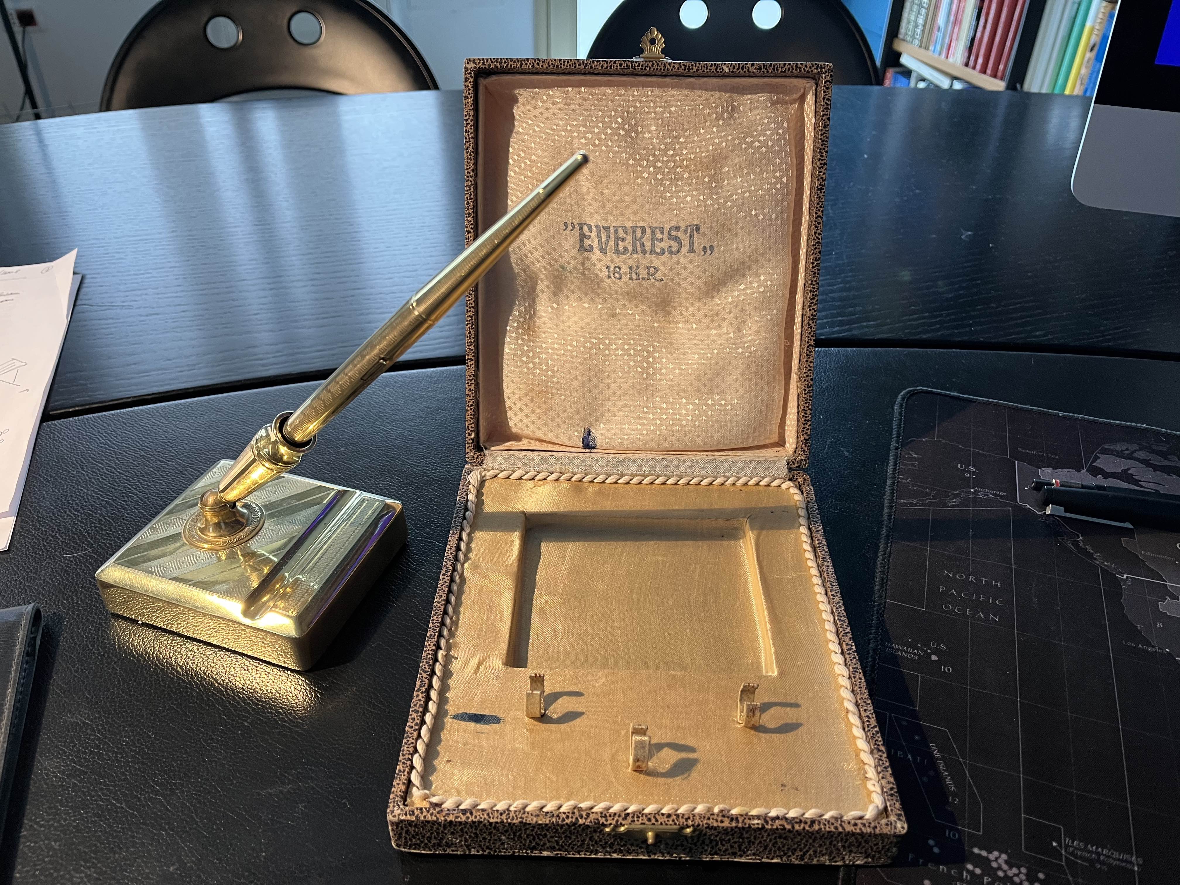 Salve a tutti... mi appello a voi più esperti per sapere qualcosa in più rispetto a questo regalo che mi hanno appena fatto. Una penna everets tutta laminata in oro 18 K, con un bel pennino molto flessibile di 14 c... Chi me l'ha regalata mi ha detto che come epoca è in mezzo tra i pennini e calamaio e le prime stilografiche... Ha infatti l'alloggiamento tipico del pennino ma anche il caricamento a sacchetto..... Grazie a tutti per le info....