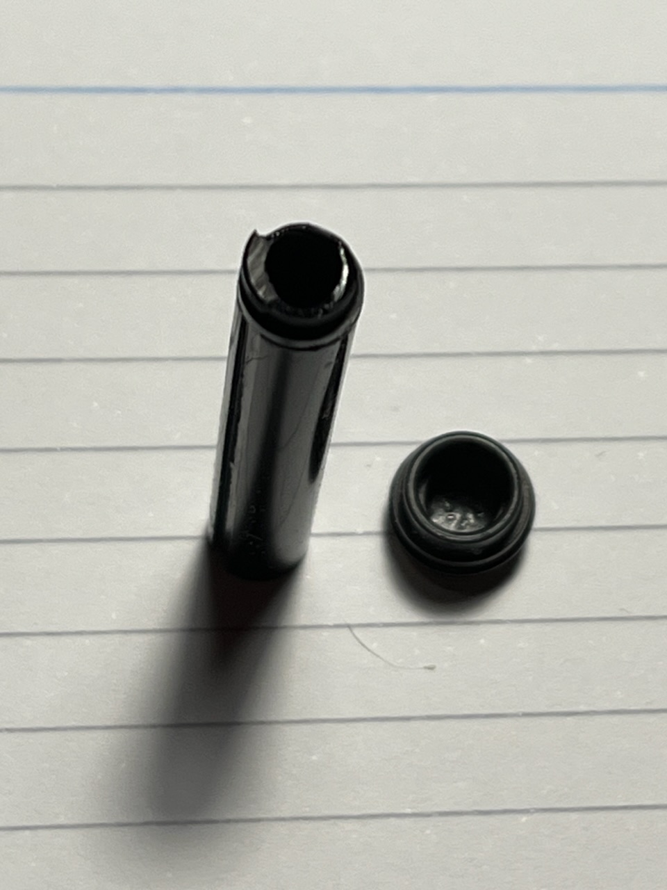Stamane ho recuperato le guarnizioni dello stantuffo in posta. Calzano perfettamente sull'asta dello stantuffo. Ho usato quella nera, nel pacco ci sono trasparenti, nere e una verde. Era un po' troppo stretta, mi si e' smontata l'asta ad elica dalla manopola, fortuna che e' dentro a pressione. Ho provato con la guarnizione trasparente, ci ho messo intorno un po' di grasso al silicone ma anche questa era veramente stretta. Mi si e' smontato un paio di volte l'elicoidale dalla manopola. Sono bastate varie aspirazioni a vuoto per rodare la 'canna' e la guarnizione. Ora la tenuta e' stagna, l'inchiostro viene succhiato alla perfezione e la penna ha ripreso a scrivere alla perfezione. Bellissimo!! 10 giorni tra la data dell'ordine e la consegna tra USA ed UK e niente costi extra alla dogana, ho pagato la VAT inglese ad eBay nelll'ordine.
