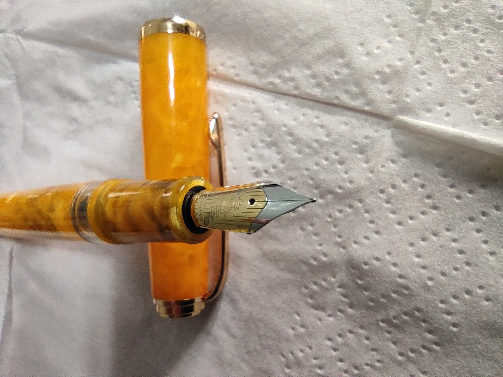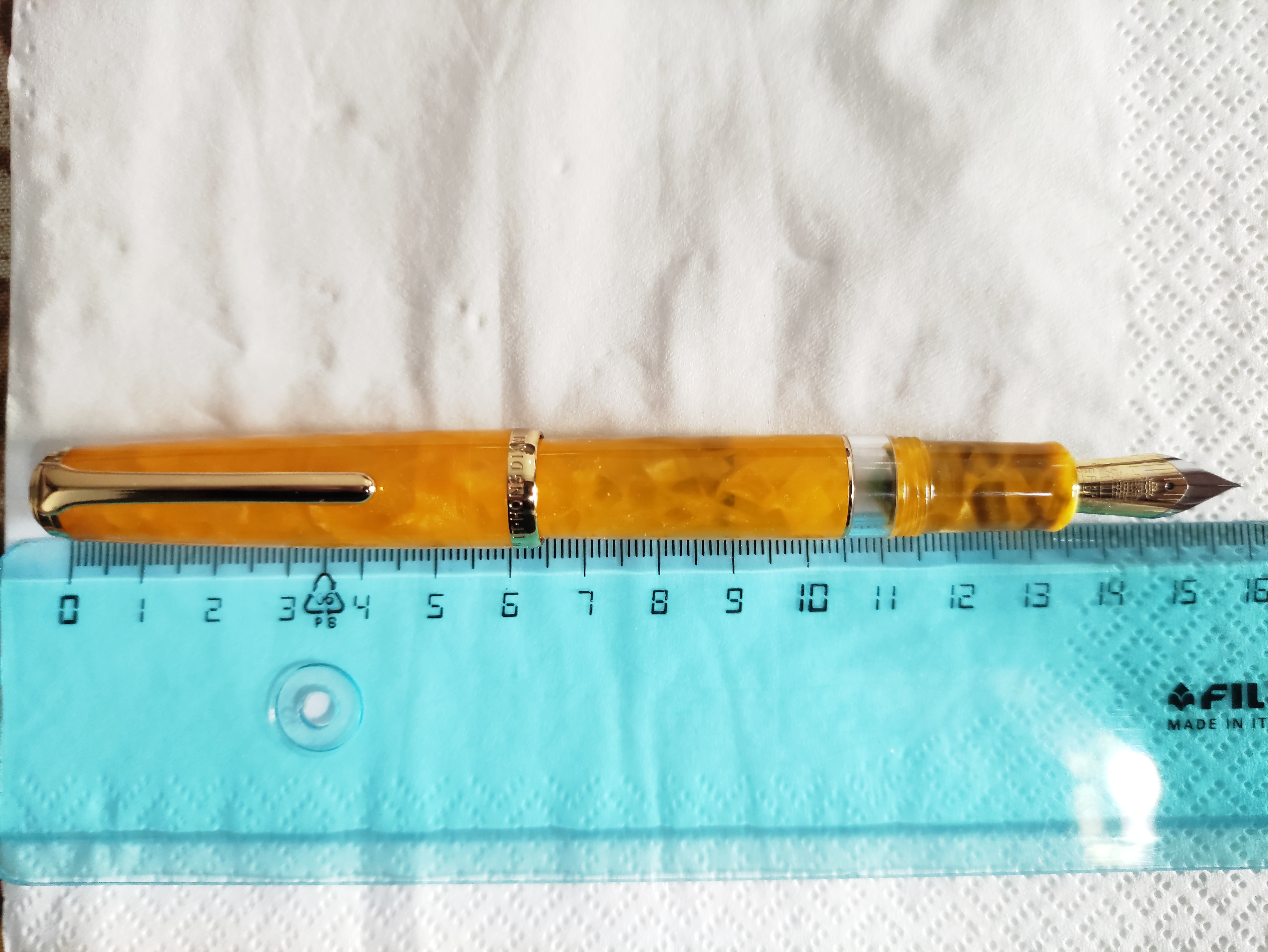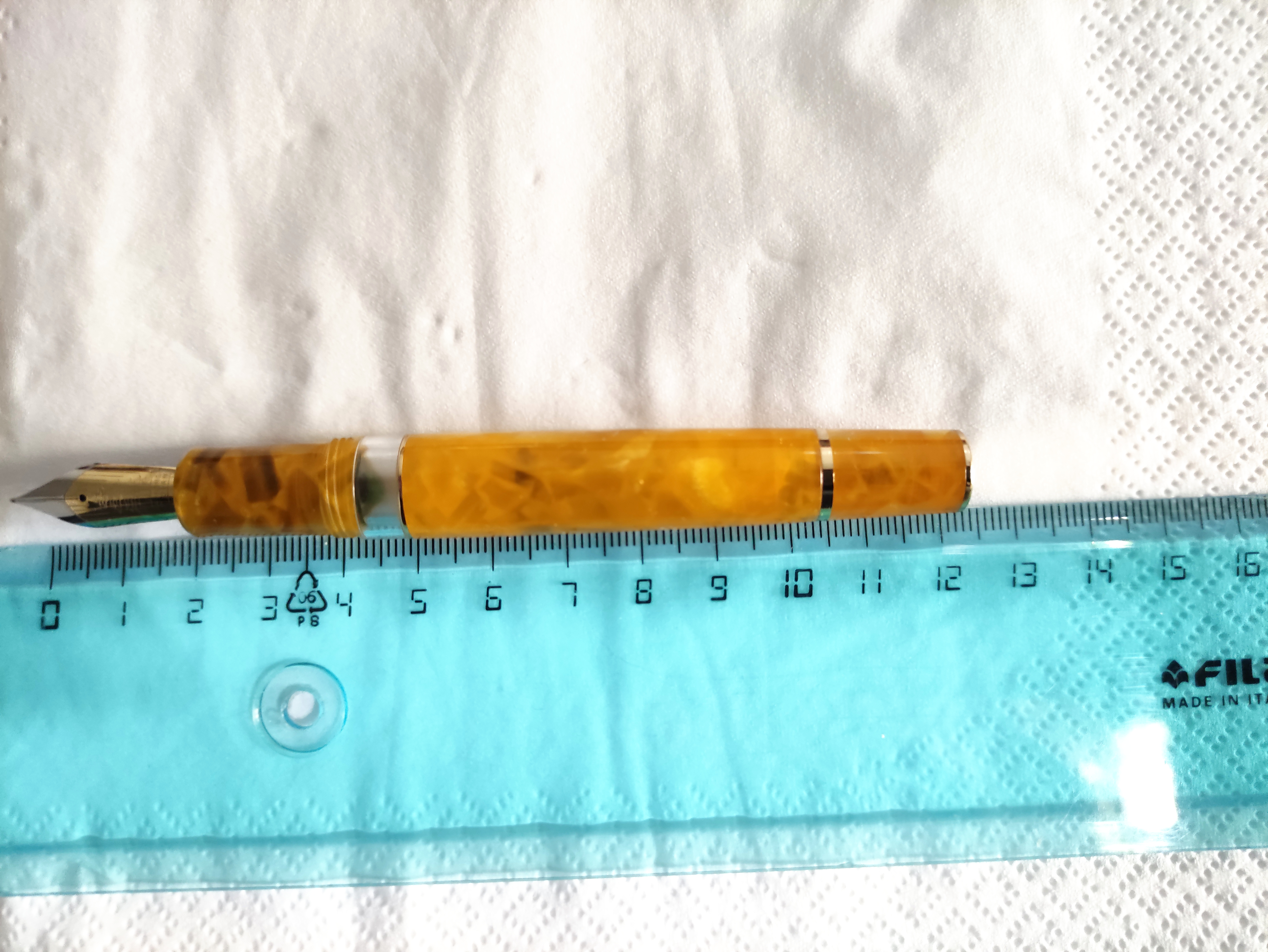 Veniamo alla penna, è una stilografica in resina arancione chiaro, tendente al giallo con pennino in acciaio extra fine.