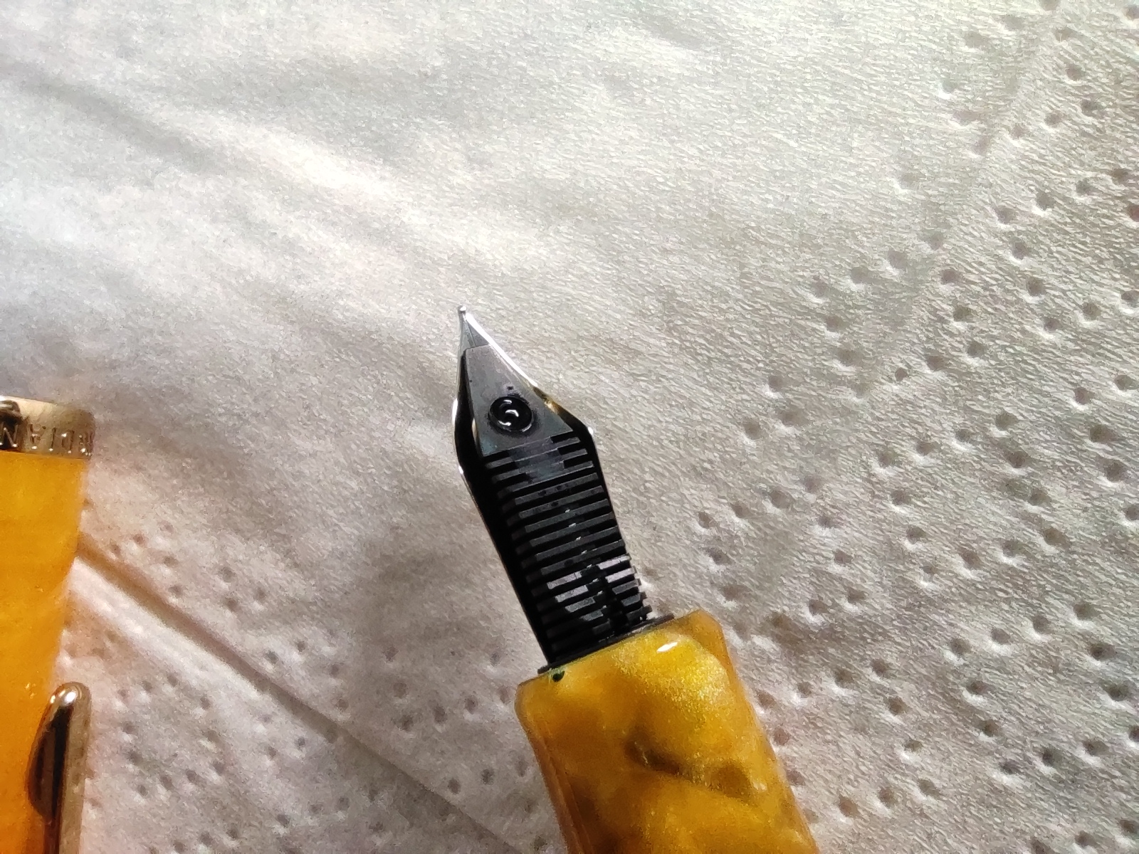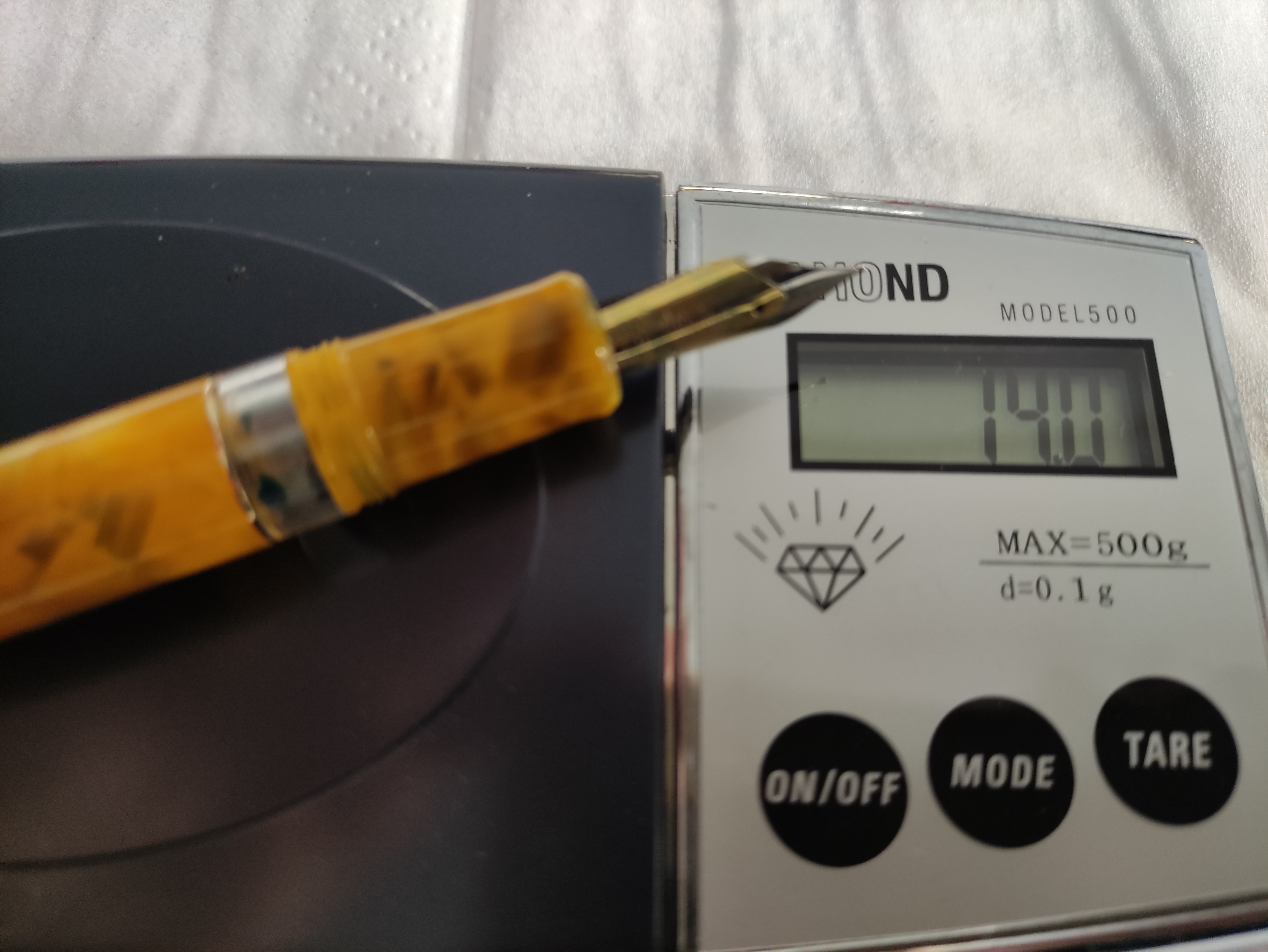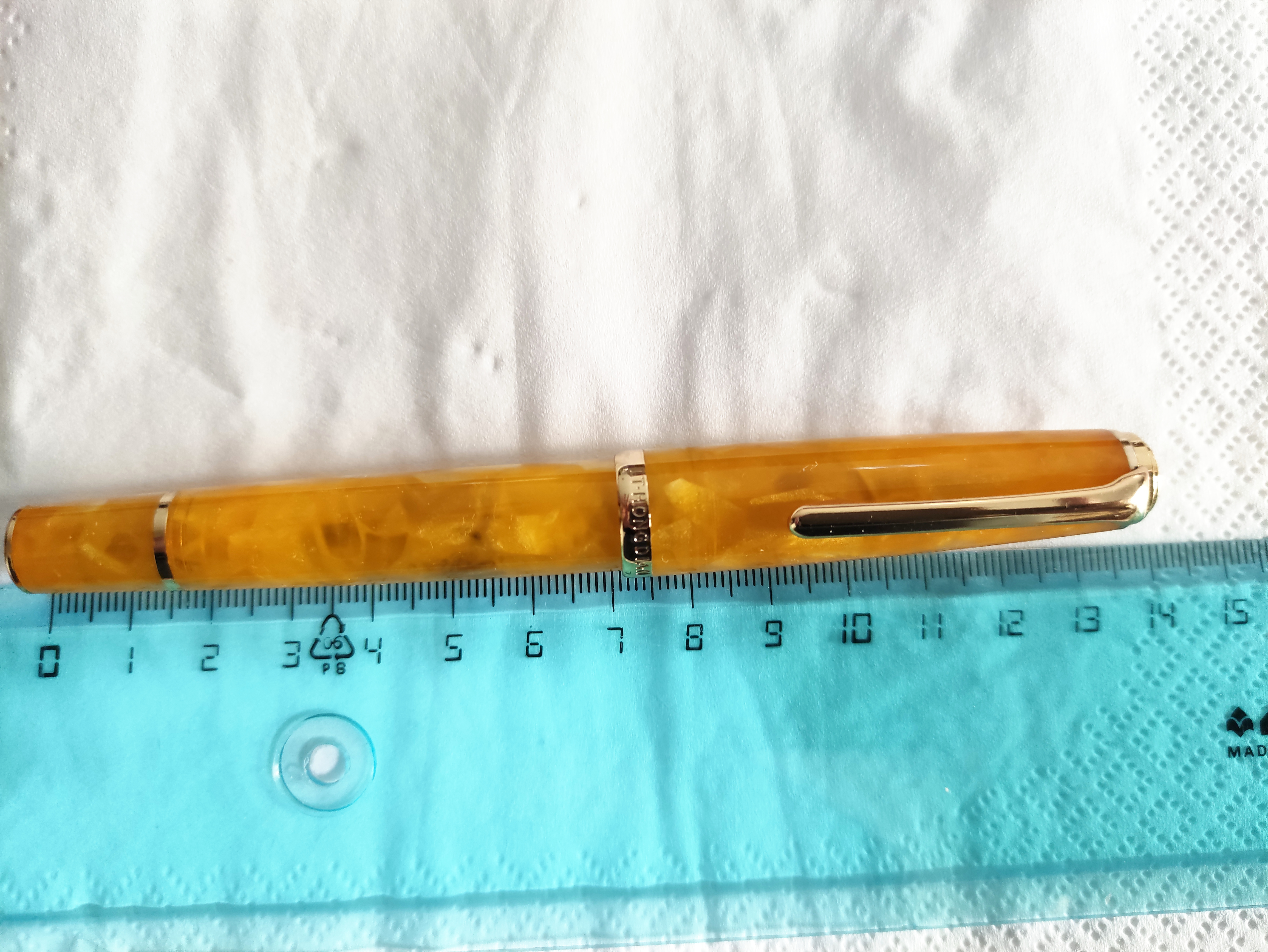 Veniamo alla penna, è una stilografica in resina arancione chiaro, tendente al giallo con pennino in acciaio extra fine.