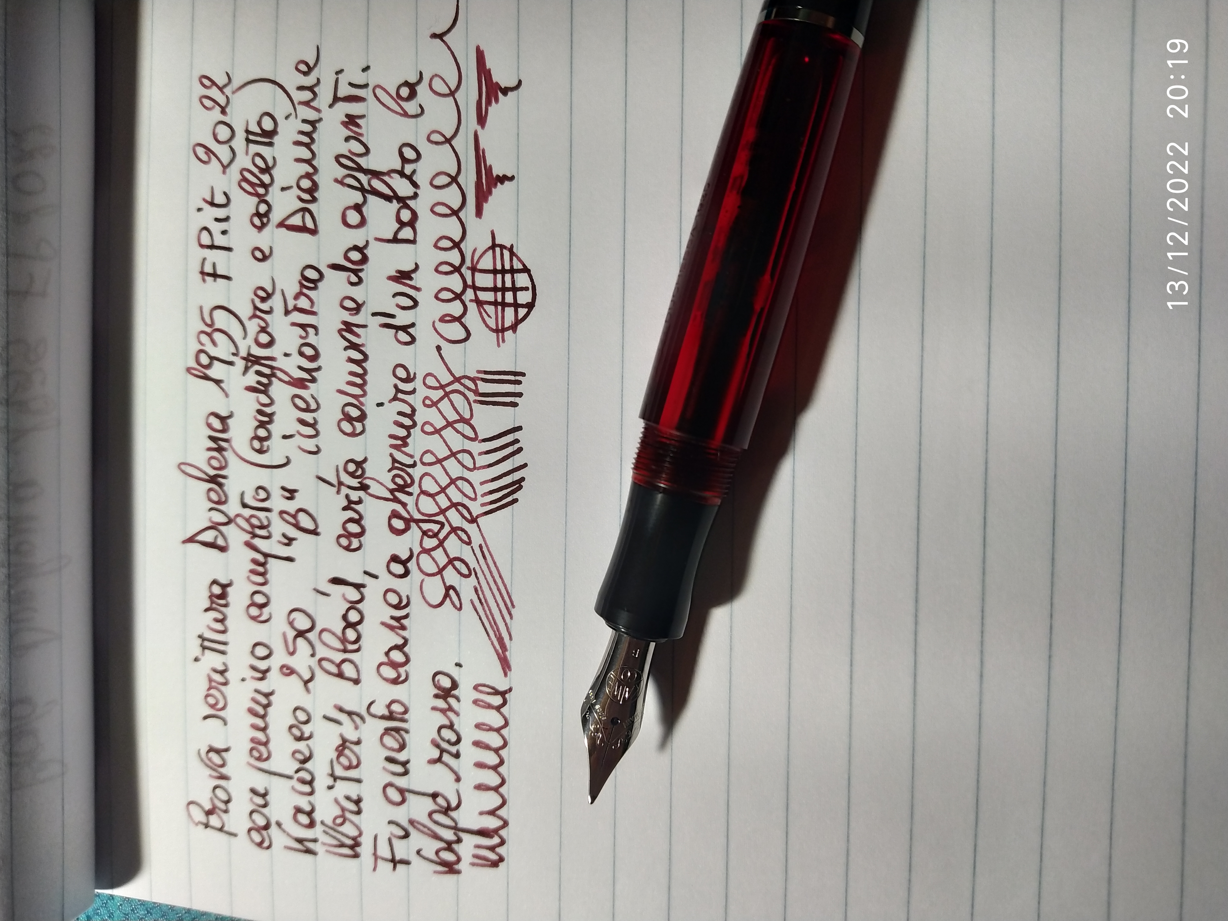 Inutile ripetere quì tutta la storia della necessità di tale sostituzione (è tutto ampiamente descritto nella discussione in epigrafe), non avendo alcuna voglia di avere una penna bella e particolare di fatto inutilizzabile, stamane ho proceduto all'innesto di un gruppo scrivente Bock completo. Ho avuto a disposizione un gruppo scrivente (non conosco l'esatto termine tecnico per indicarlo) Kaweco 250 e dopo aver messo un velo di grasso di silicone sulla filettatura l'ho avvitato alla sezione della Duchessa 1935 al posto del suo originario. Perfetto. Ho lasciato l'o-ring che si trovava su quello "vecchio" non innestando il tubicino, tanto io la penna la usavo e l'userò solo a eyedropper (comunque volendo si può caricare con la pompetta anche senza tubicino, poi spiegherò come). Caricata d'inchiostro l'ho usata per tutto il giorno scrivendo cinque pagine A4 non rilevando alcun problema sia funzionale che strutturale. Il pennino Kaweco 250 (che è Bock 250) risulta più lungo di 1,2 mm ma ciò non inficia sulla chiusura del cappuccio (non va a battere sul fondo).