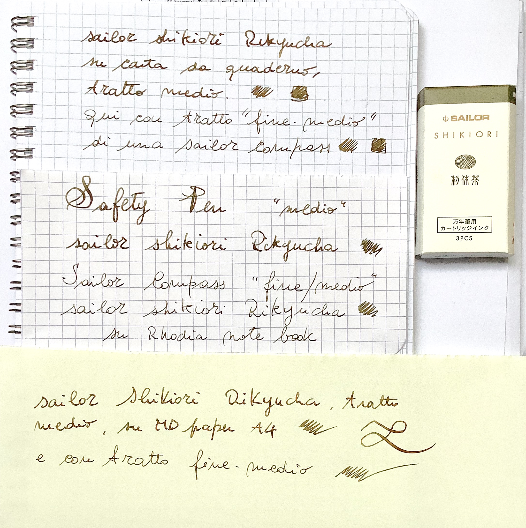 Il Rikyucha è uno dei tanti bellissimi inchiostri Sailor della linea Shikiori, simile ad un verde cachi scuro (o forse con qualche lievissimo viraggio ad un marroncino). In ogni caso, qualunque sia il suo colore base, è molto bello a vedersi sia con un tratto fine che con tratto più spesso; questo inchiostro appena steso sulla carta ha la particolarità di avere una tonalità tendente al grigio scuro scuro, per poi stabilizzarsi nel giro di pochissimi secondi nella sua peculiare colorazione (lì per lì la cosa lascia interdetti, ma è piacevole osservarla), e lo fa su tutte le carte.