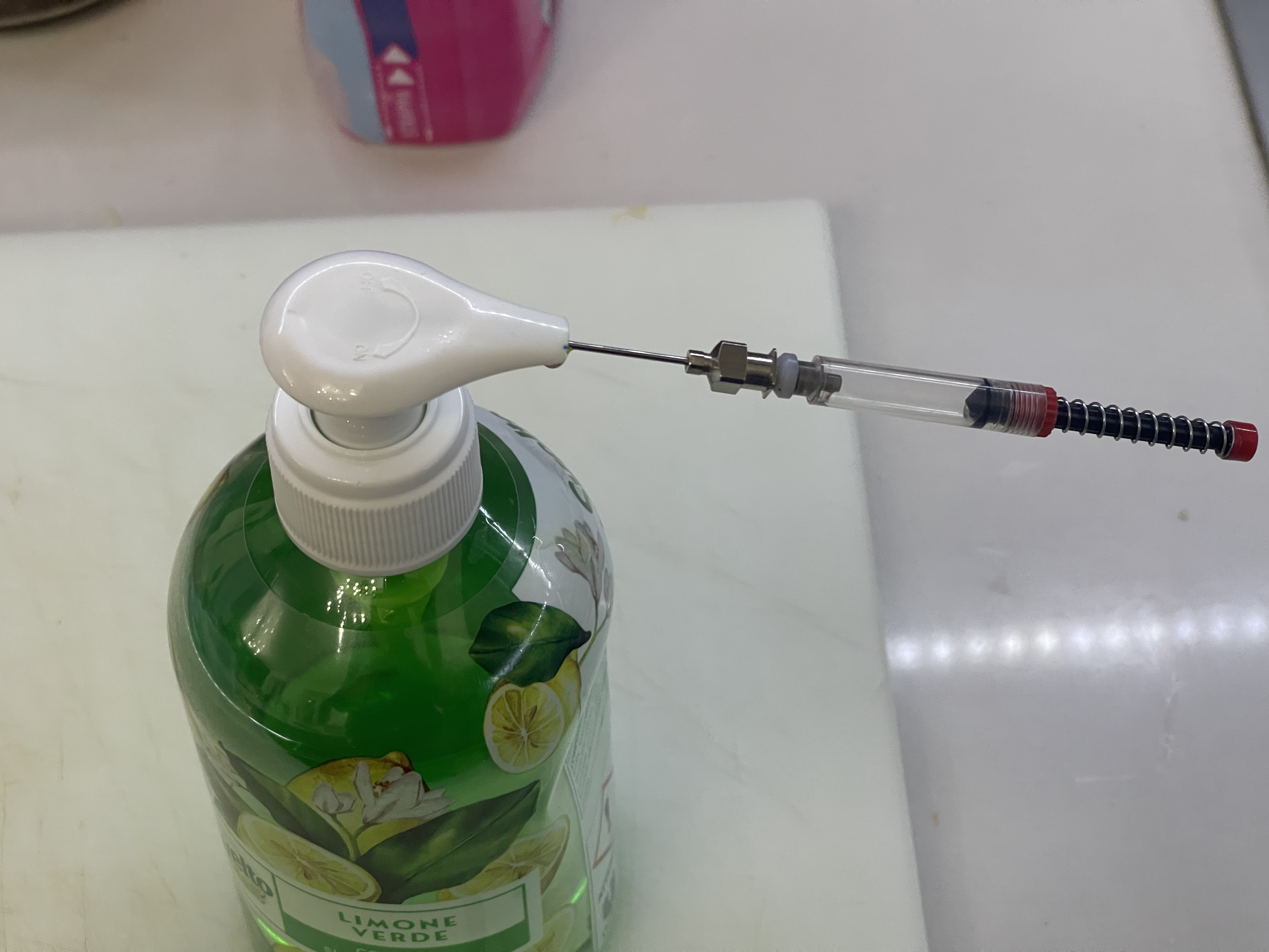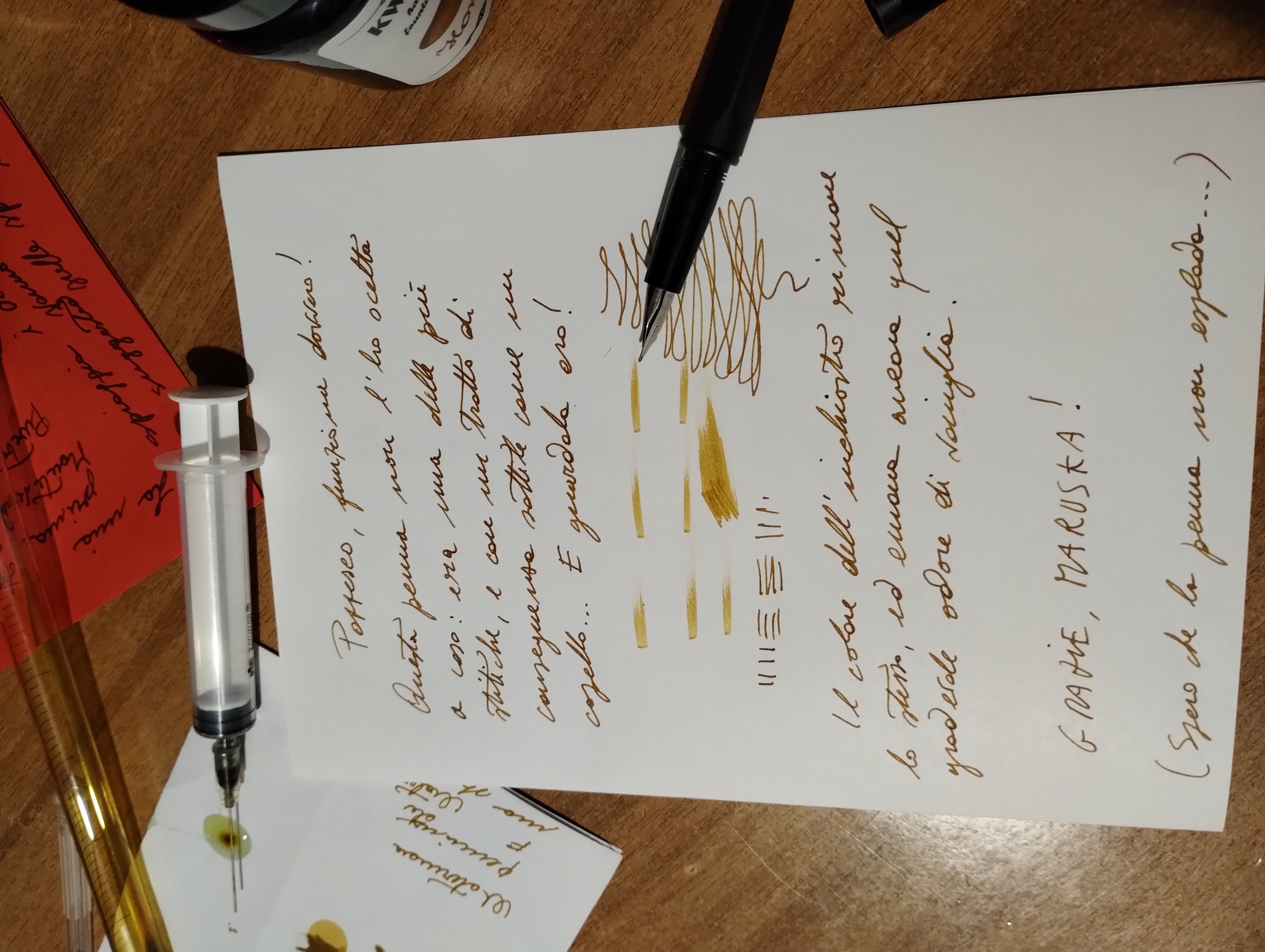 Mi sono ricordato che Maruska suggeriva di aggiungere una punta di detersivo per piatti all’inchiostro per fluidificarlo (santa donna!) e così ho fatto: ho scaricato la penna e, conscio del fatto che non avrei mai più usato un inchiostro così schifosamente viscoso, ho sporcato di detersivo l’ago di una siringa, l’ho immersa nel calamaio, girato per far scendere e ho shakerato il calamaio intero.