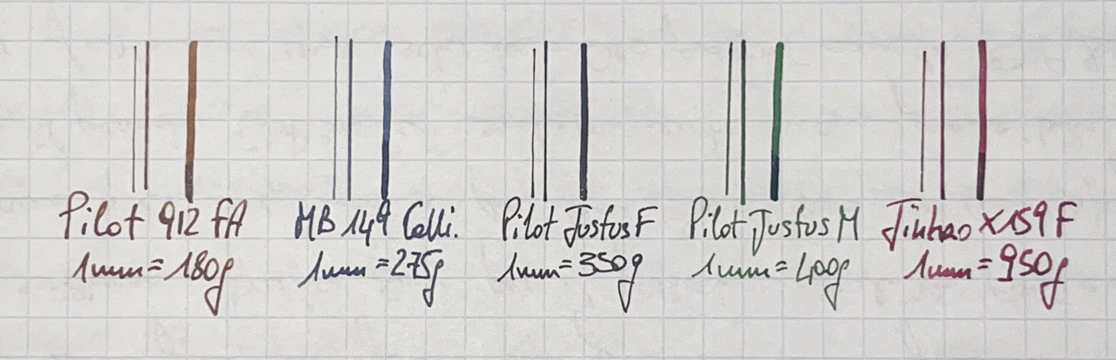 Scordati quel risultato con pennini FA o Calligraphy (entrambi arrivano alla larghezza massima, ma partono da un tratto piu grosso), meno ancora con i Soft di Pilot (piuttosto rigidi per scriverci continuativamente con variazioni che, comunque, non arrivano a quel livello) e ancor meno con gli elastic su base Jowo(che praticamente non hanno variazione in confronto).