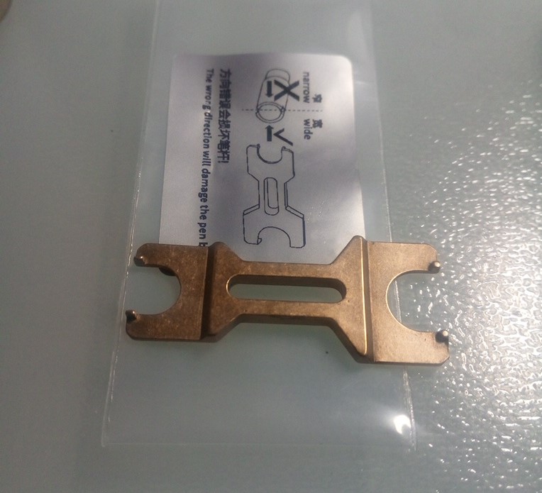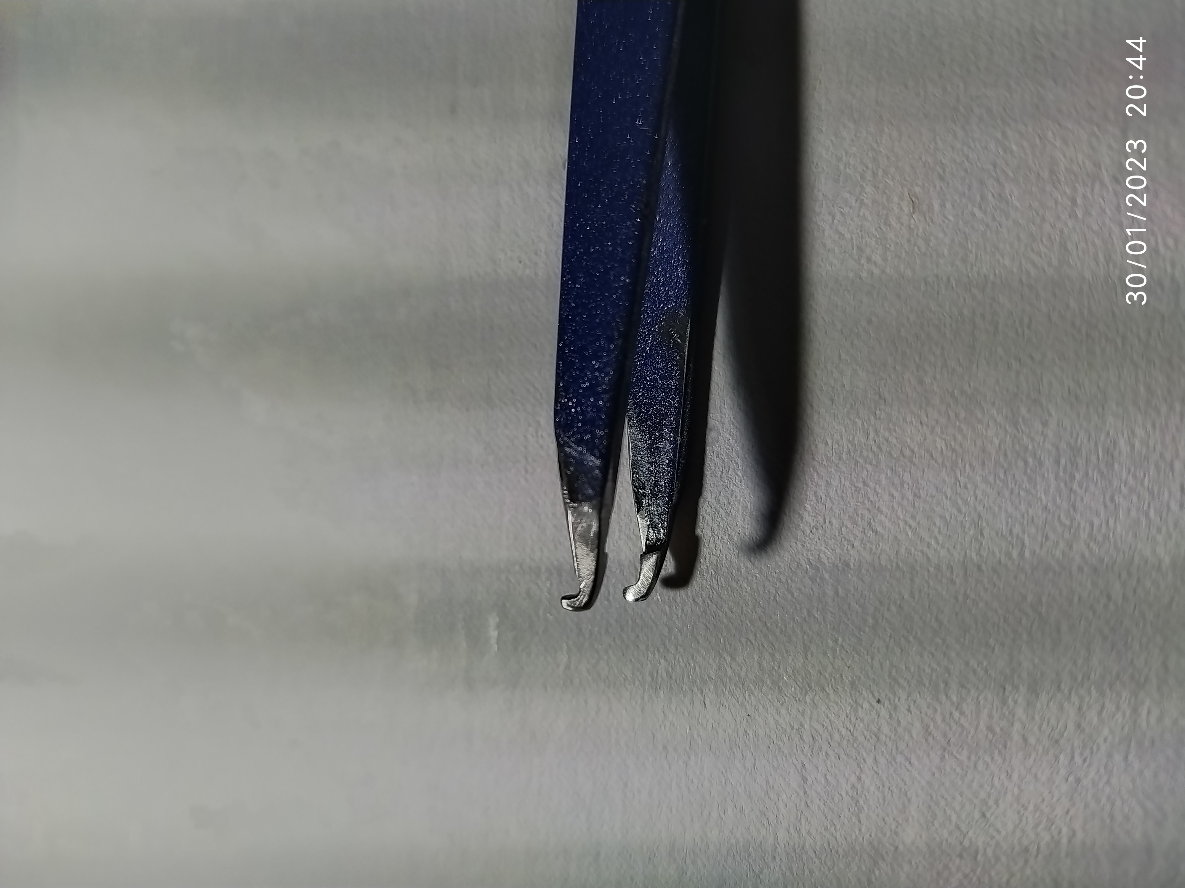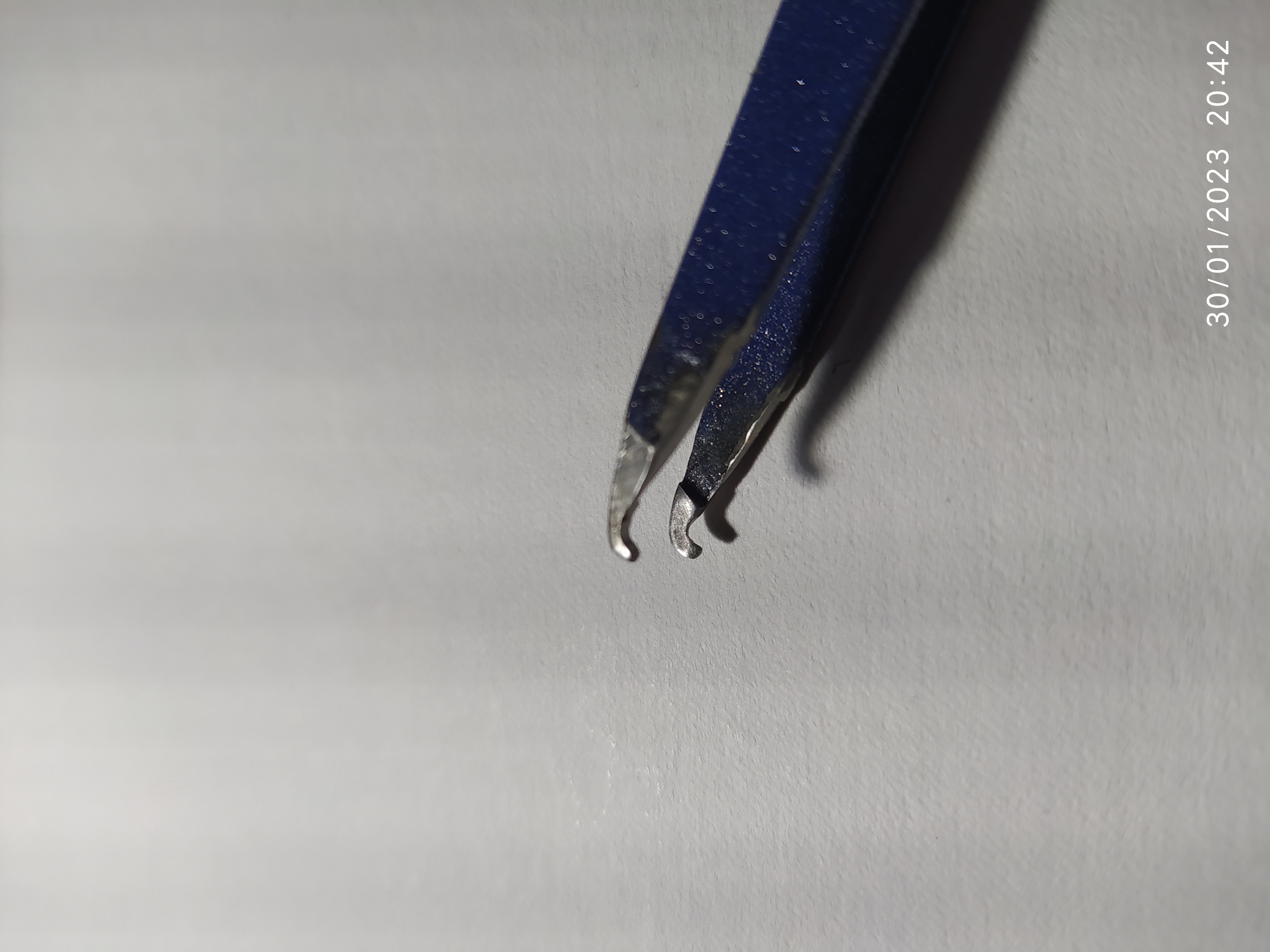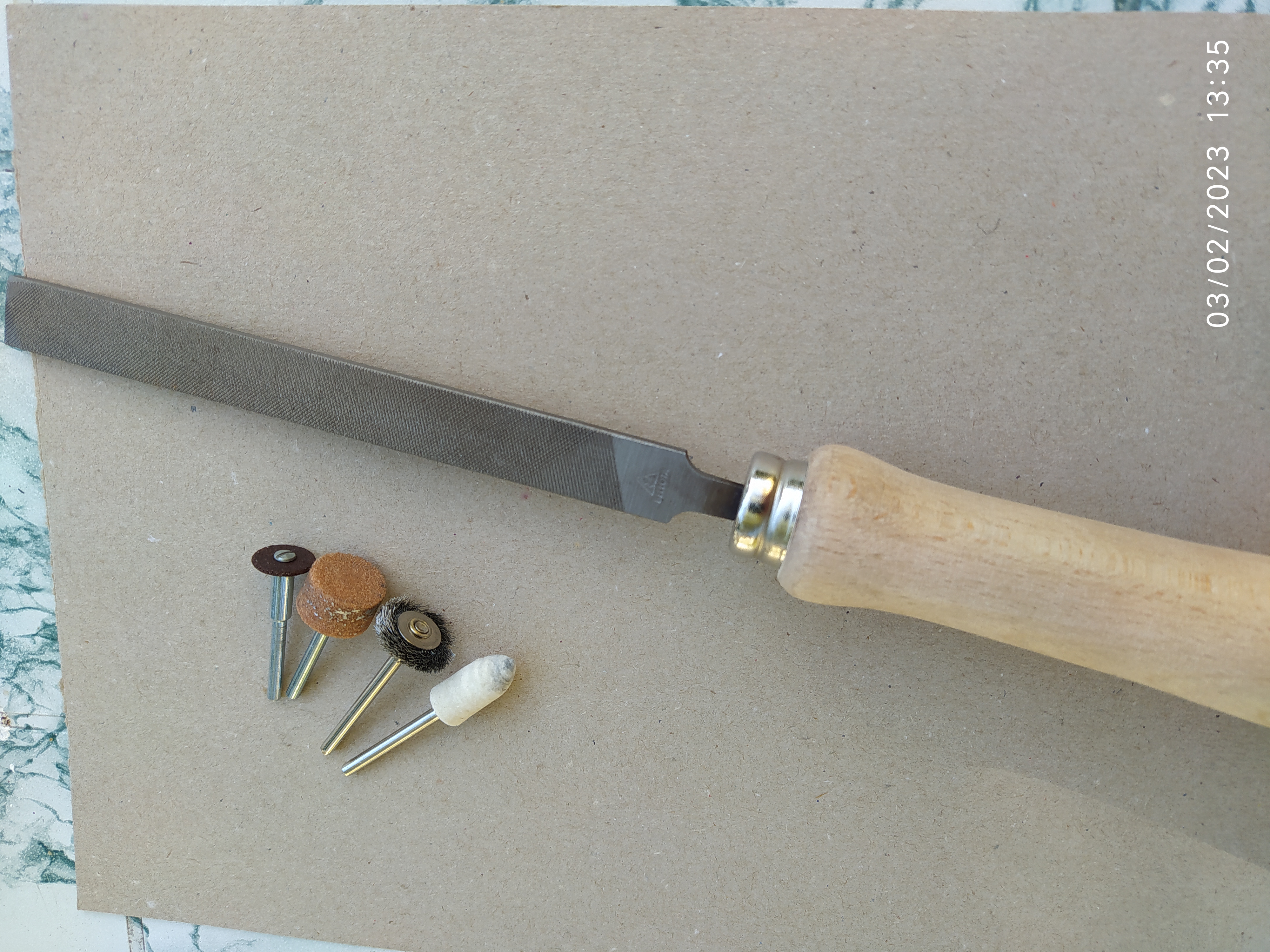 Ho usato una pinzetta per cosmesi avente i terminali piatti come quella in foto. L'altra foto mostra gli utensili che ho usato, in ordine cronologico di impiego dall'alto verso il basso, applicati al dremel. Il feltrino con pasta abrasiva per rifinire e la lima l'ho usata per lo sgrosso iniziale e la rifinitura finale con avvolta sopra un foglietto di carta abrasiva 2000. Spero di essere stato utile.